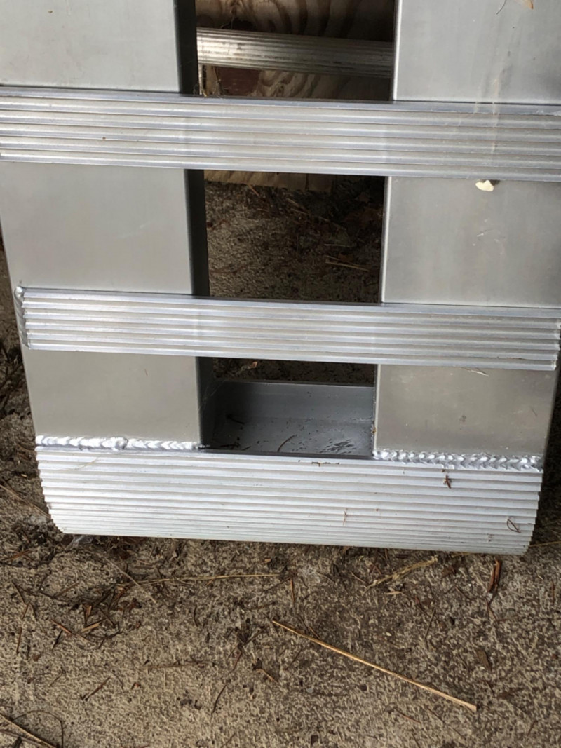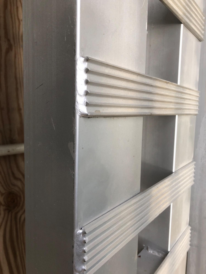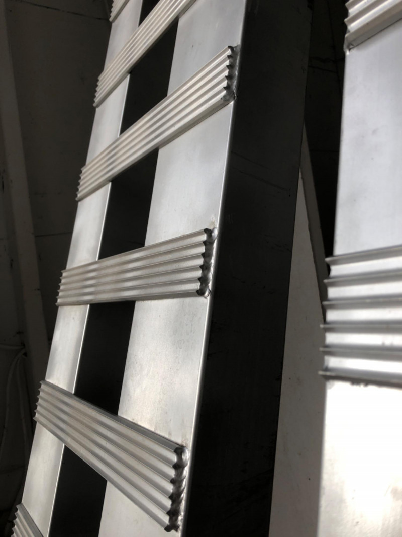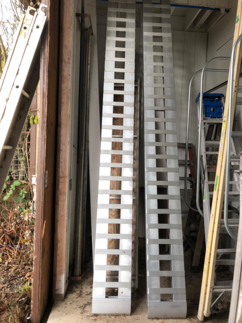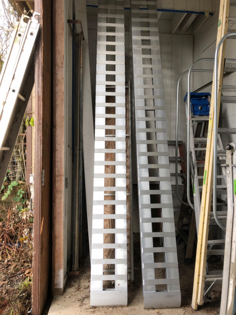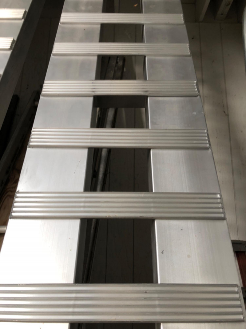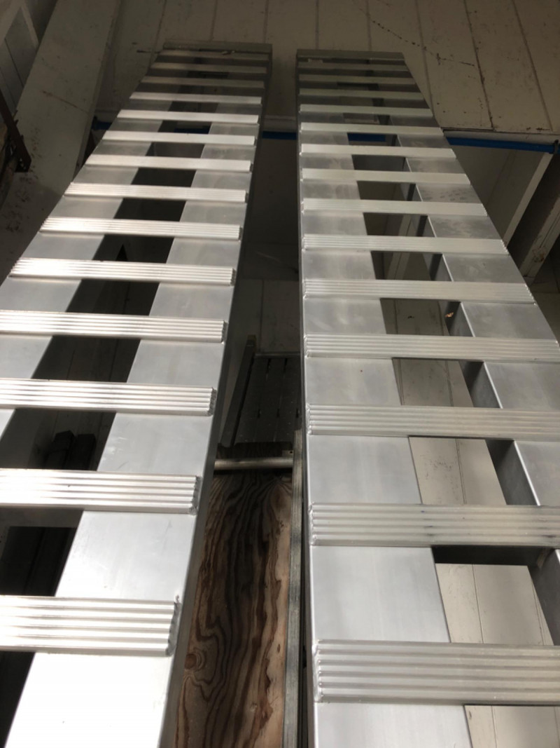 Pair of large aluminum loading ramps. Rugged contractor utility for loading equipment, vehicles, or shop supplies with ease.