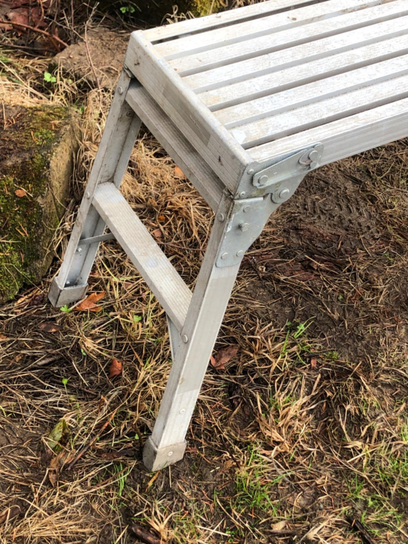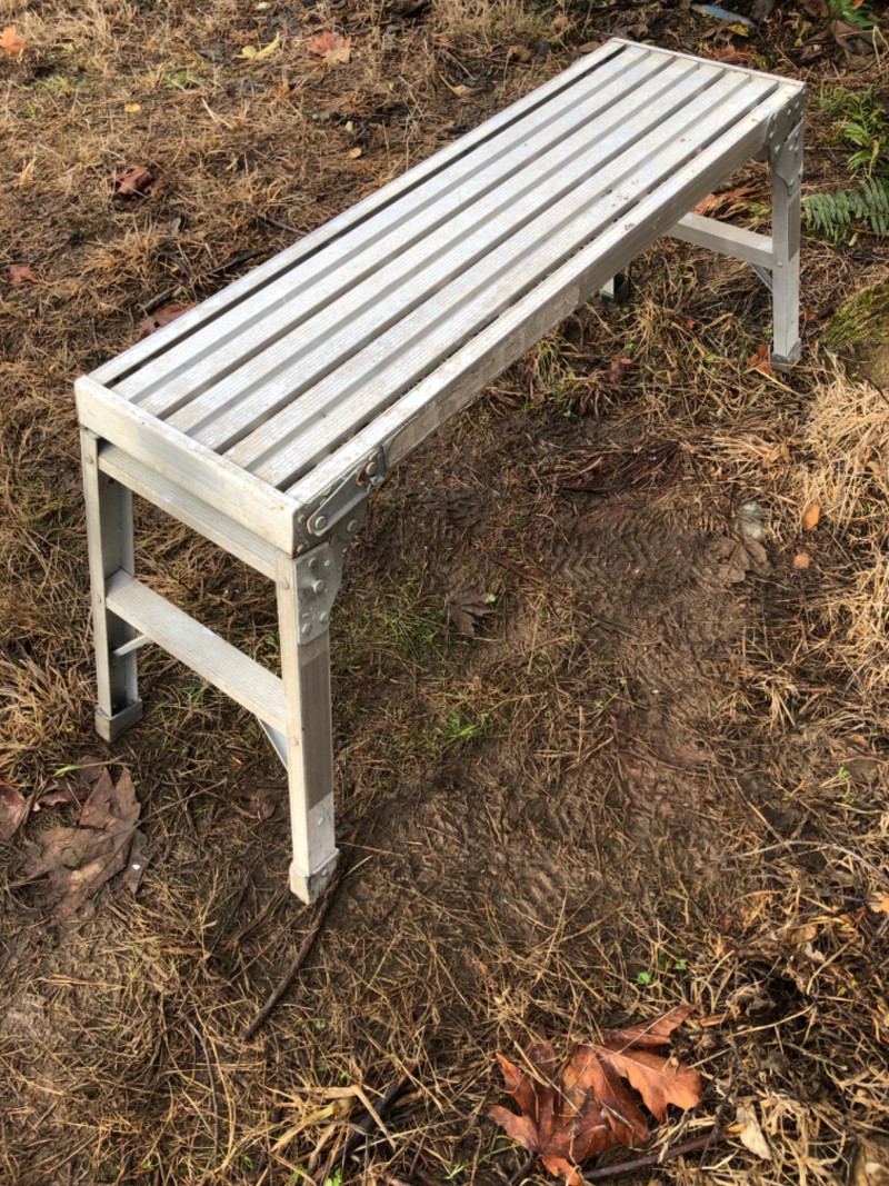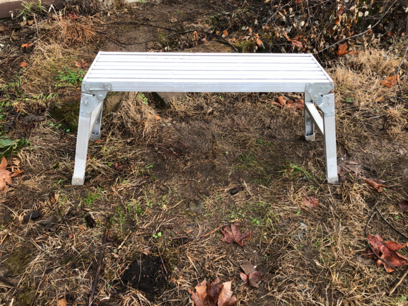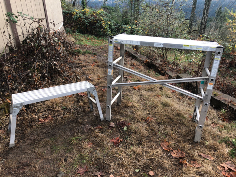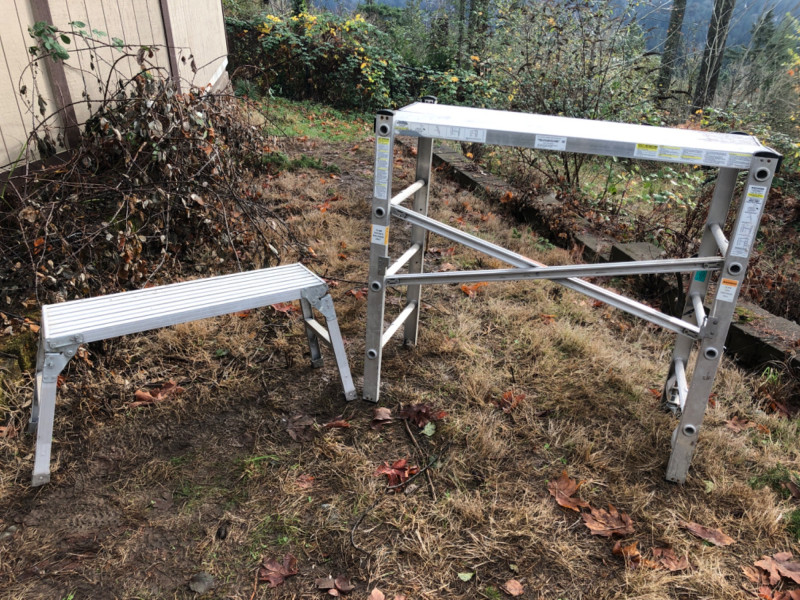 Two aluminum Werner work platforms. Durable contractor access tools for elevated shop and field projects. Both collapse and break down for easy storage Large Platform Dimensions: 48" H x 20" W x 52" L Smaller Platform Dimensions: 22" H x 39" L x 12" W