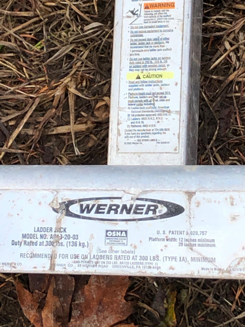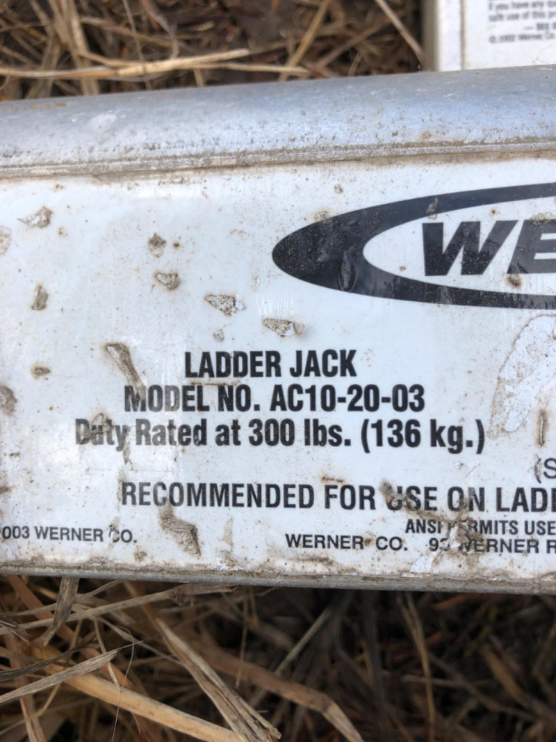 Set of two Werner ladder jacks, AC10-20-03, designed to support scaffold planks between ladders for elevated work. Durability: Heavy‑duty steel construction built to withstand contractor jobsite demands. Utility: Provides secure footing for painting, siding, roofing, and other elevated projects. Compatibility: Fits standard extension ladders, creating a stable platform for planks. Condition: Tested and ready for contractor use.