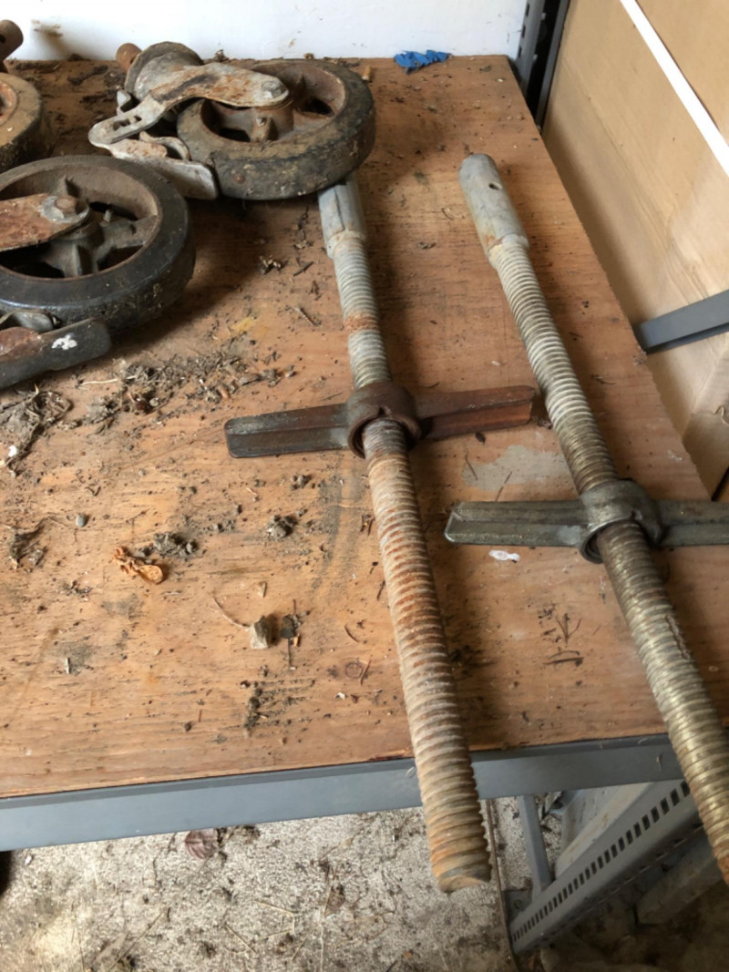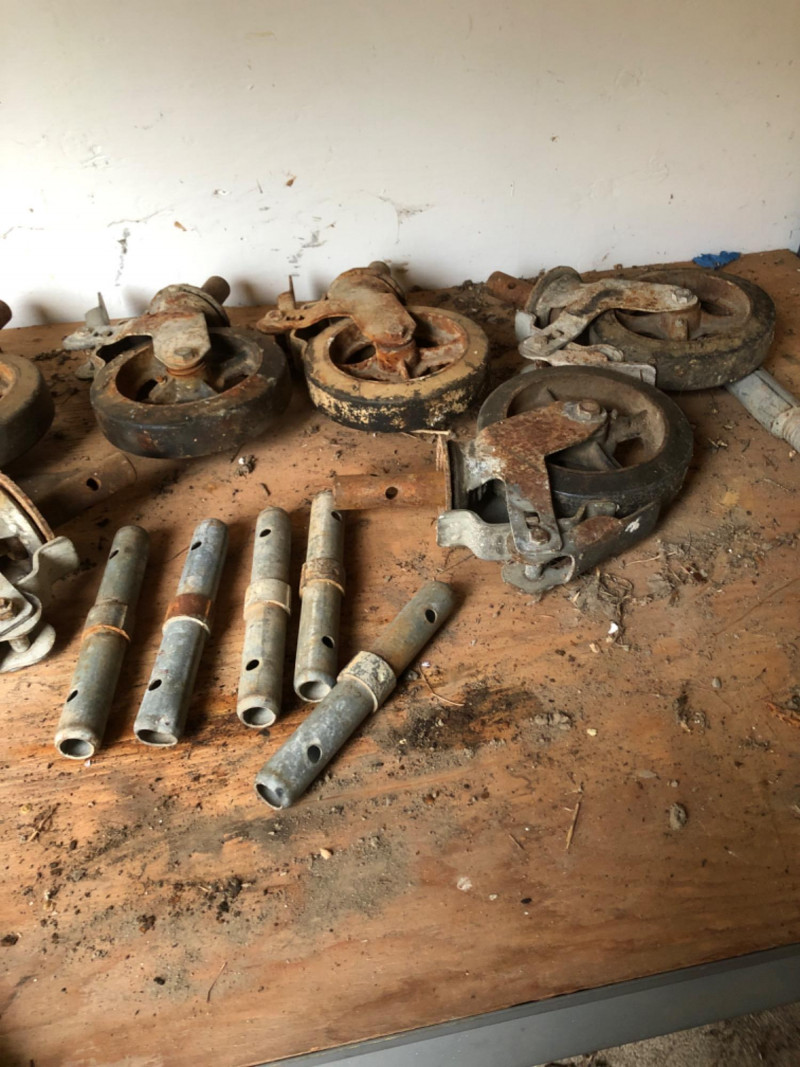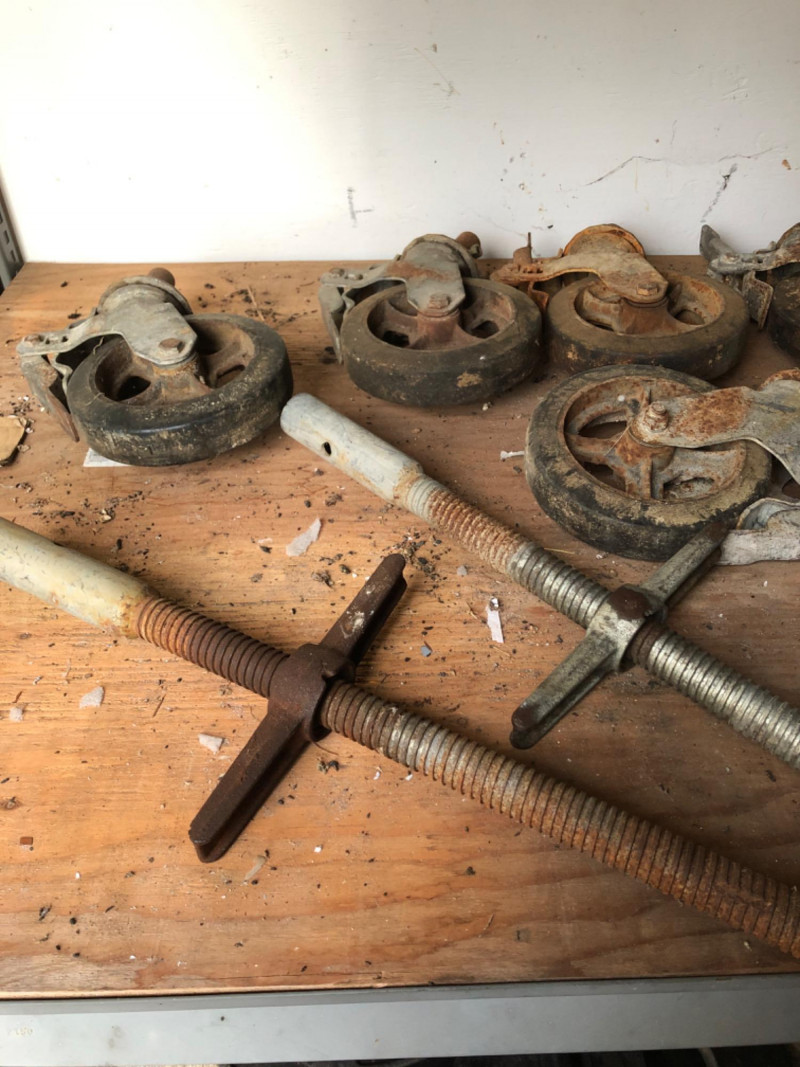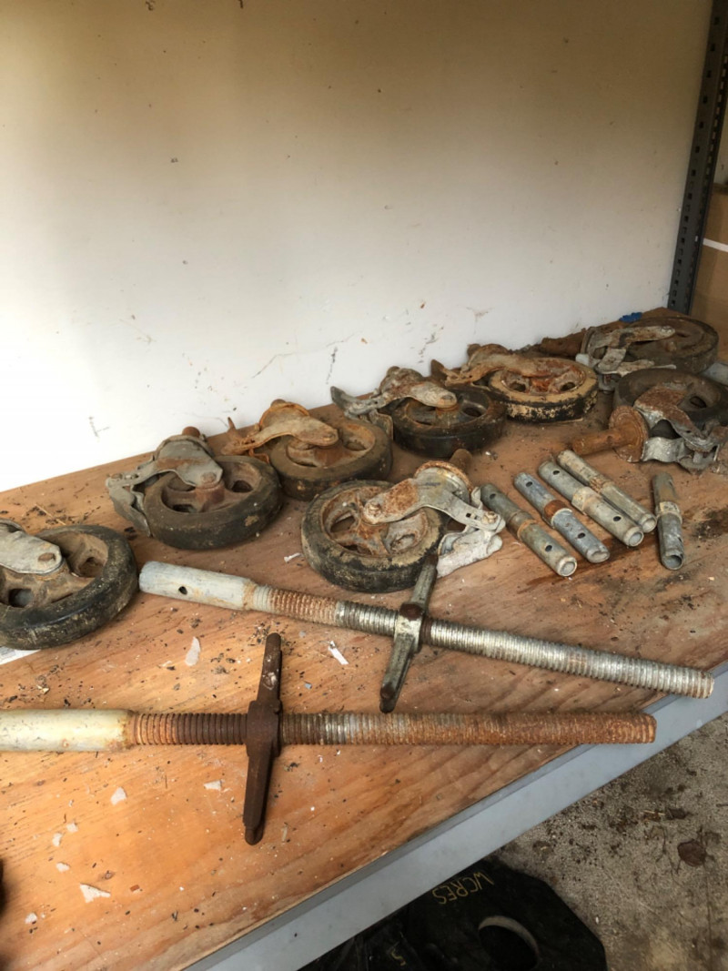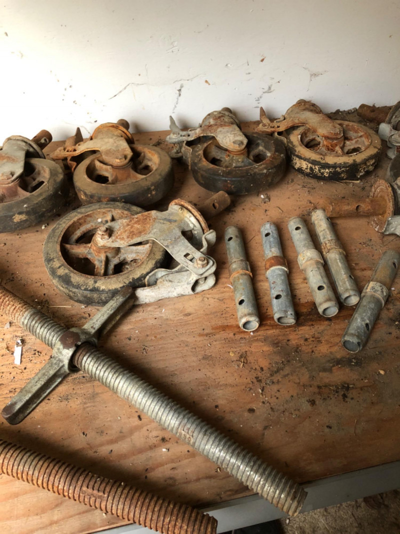 Assorted scaffolding supplies designed to support contractor access and elevated work projects. Contents: Includes mixed components such as braces, connectors, clamps, and platform accessories. Utility: Provides essential parts for assembling, repairing, or extending scaffolding systems.