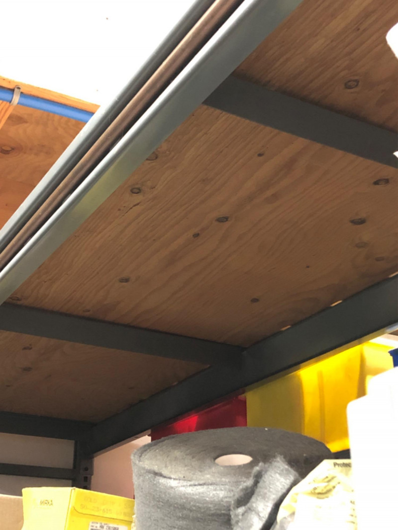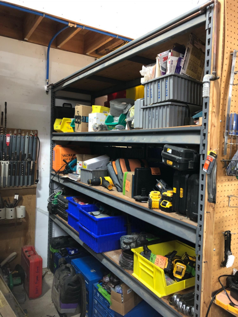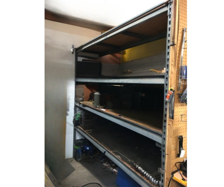 Heavy‑duty Husky style industrial shelving unit with 4 shelves. Built for contractor shop organization and tool storage. Does not include tools or other items on shelves. Special Note: Unit appears to be assembled with interlocking rails and supports. Metal rails and removable wood shelves. Buyer disassembles unit or brings vehicle that can transport unit as is (check dimensions). Located at parking lot level and near large bay door of shop structure. Preference is for buyer to arrange for pickup early later on last day of pickups. Buyer can arrange to come at an earlier time for post auction picker sale.