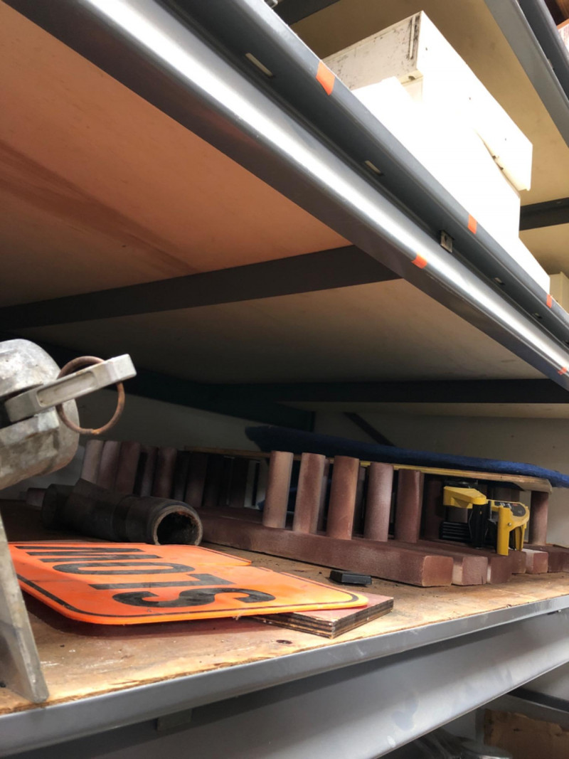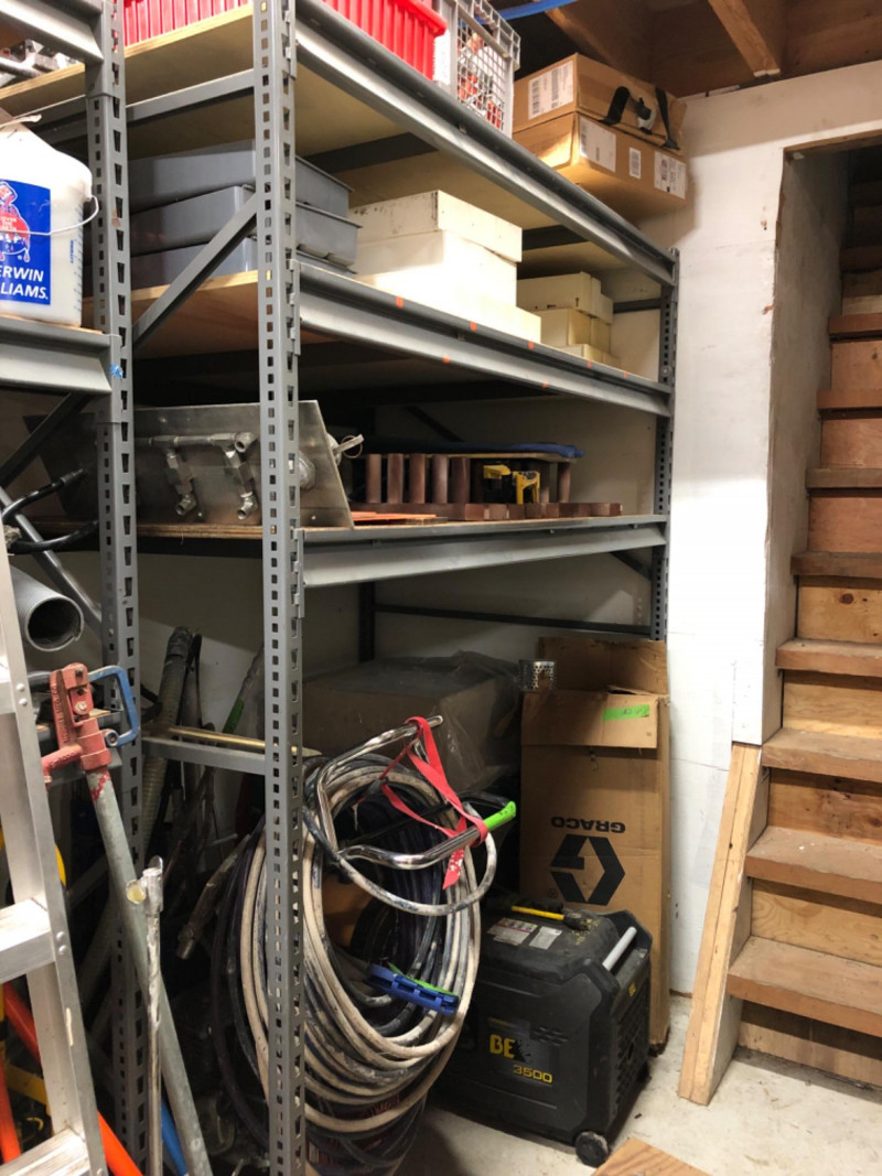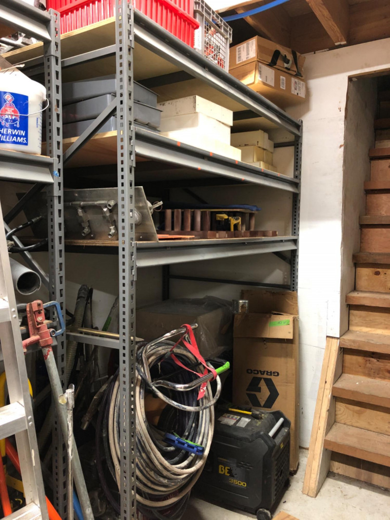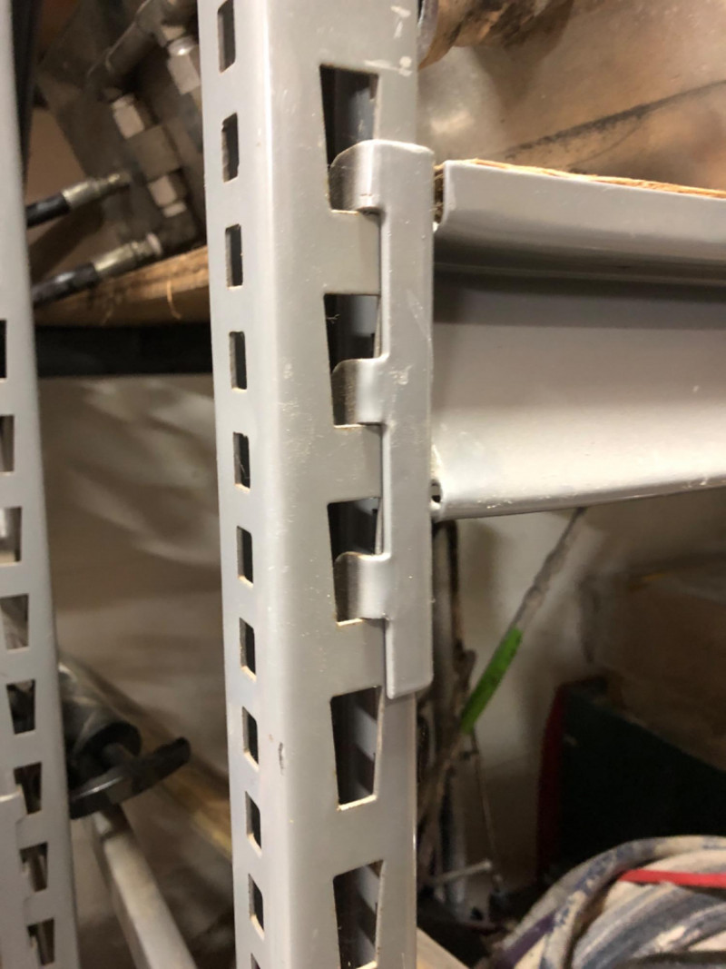 Heavy‑duty industrial shelving unit with 3 shelves. Ideal for contractor shop storage and industrial organization. Does not include any items on shelves. Organization unit only. Special Note: Unit appears to be assembled with interlocking rails and supports. Metal rails and removable wood shelves. Buyer disassembles unit or brings vehicle that can transport unit as is (see dimensions). Located at parking lot level and at back of shop structure. Preference is for buyer to arrange for pickup early on the first day of pickups or late on last day of pickups.