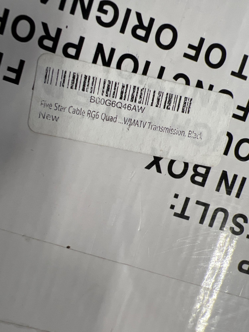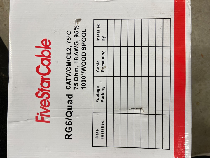 1000’ spool of CATV black cable on wood reel. Contractor utility for wiring and installation projects.