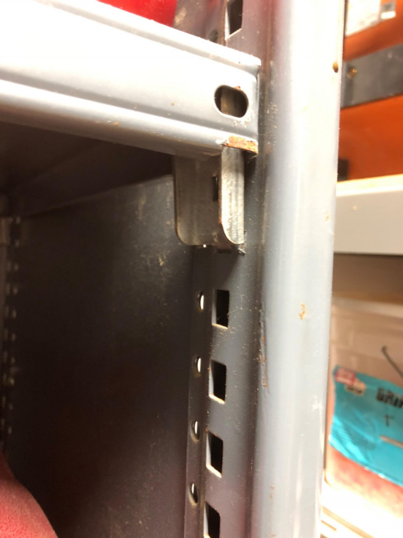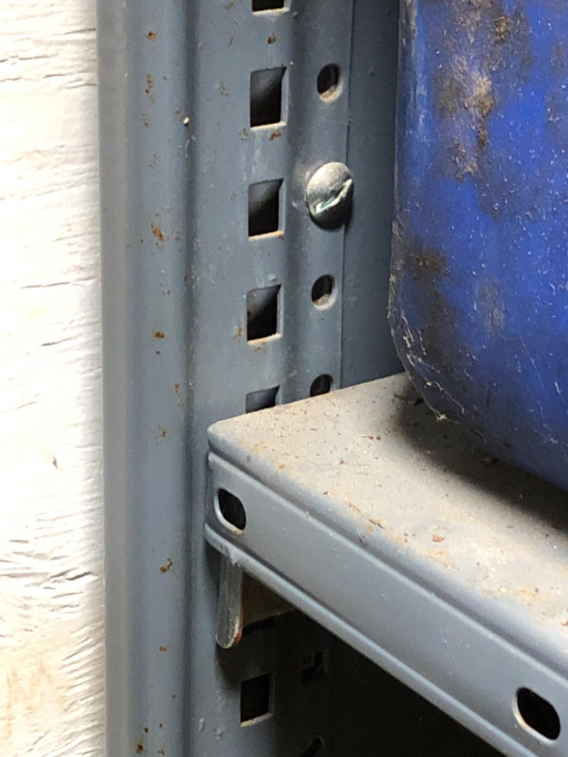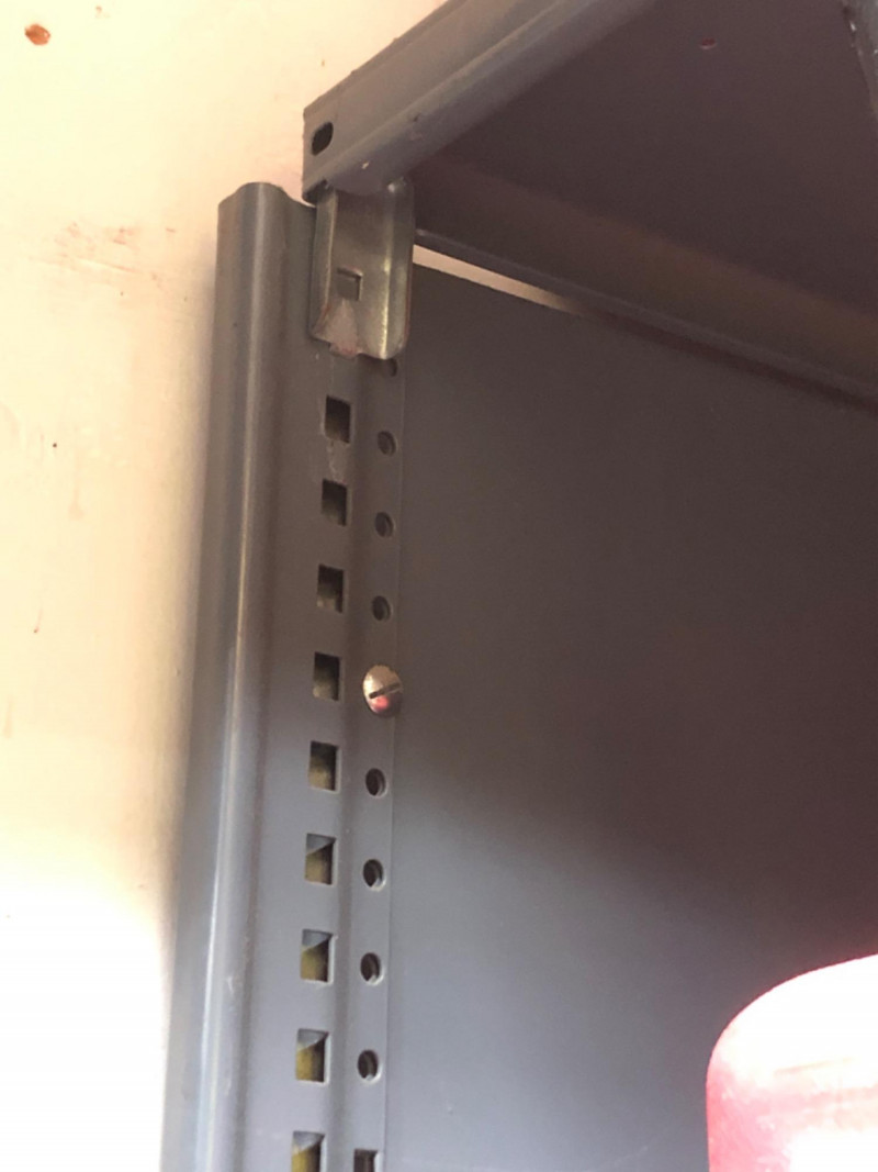 Metal organizer unit with 5 shelves. Durable steel construction for shop and warehouse organization. Includes all gas cans on shelves (approximately 20). Special Note: Unit appears to be assembled with interlocking rails and supports; however there may be screws or bolts to remove that hold shelf to wall. Metal shelves. Buyer disassembles unit or brings vehicle that can transport unit as is (see dimensions). Located at parking lot level and at back of shop structure. Preference is for buyer to arrange for pickup late on last day of pickups.