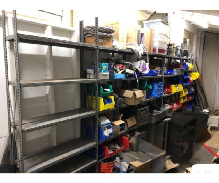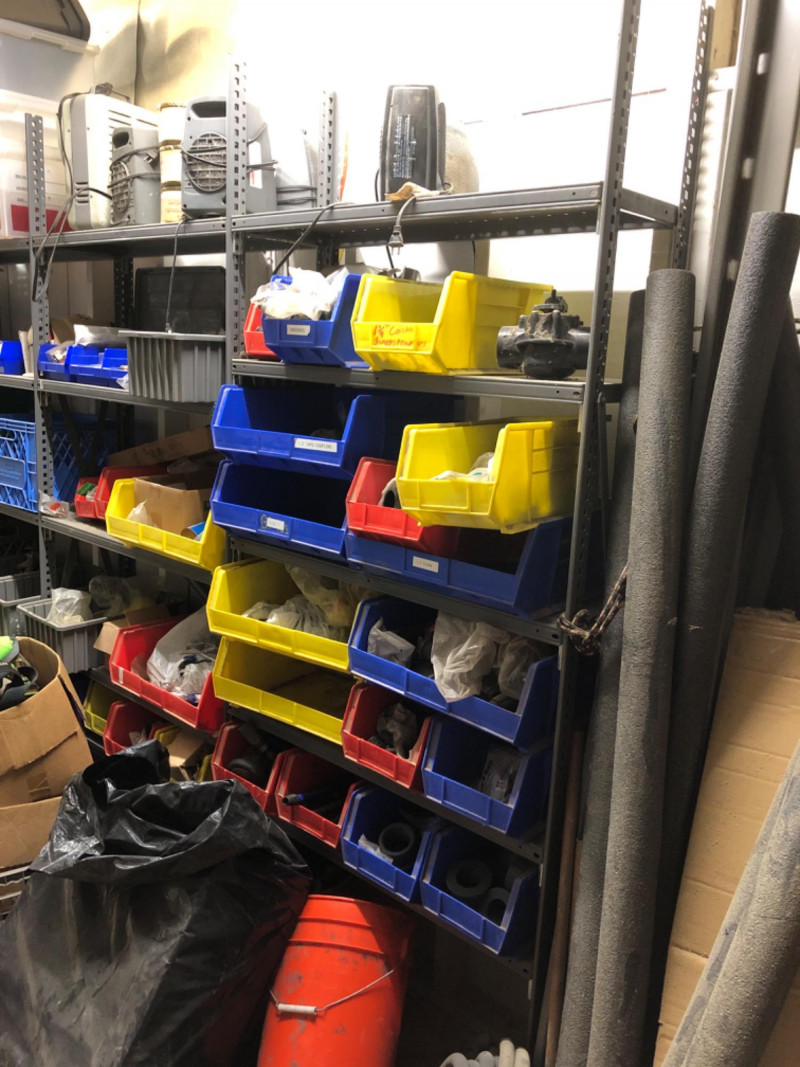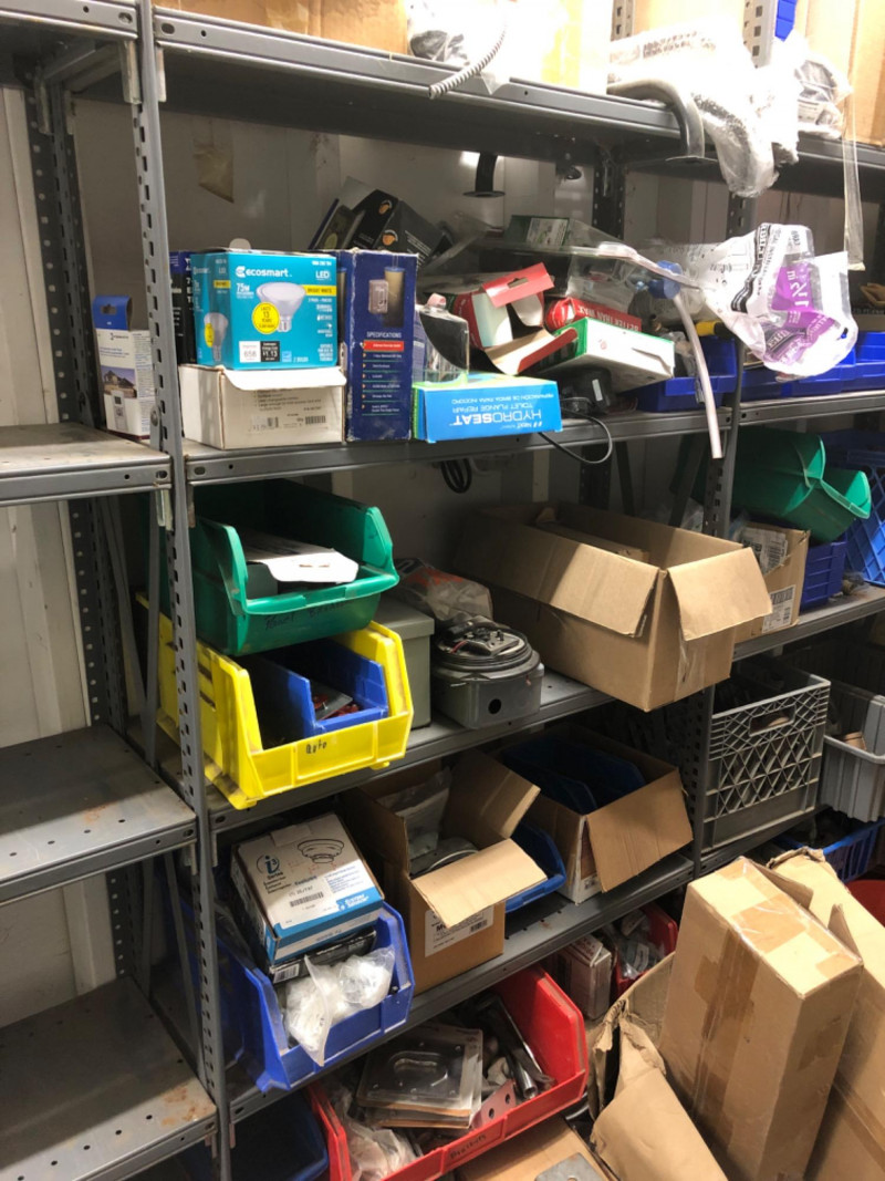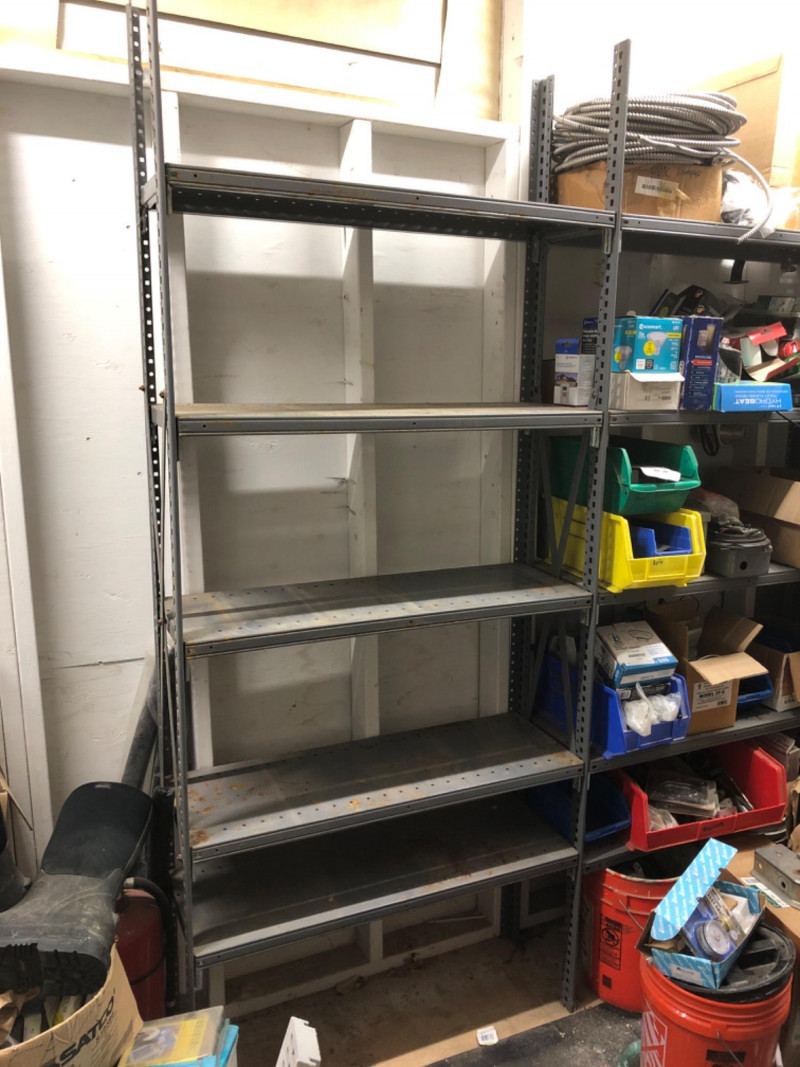 This shelving unit is in five sections and connected together to create one single organization unit. Each unit has approximately five (5) shelves. Dimensions of each shelf unit: 88" height x 36" width x 12" depth. Overall length would span 15 feet. Includes all bins and various hardware and/or tools. Items range from electronics parts and supplies to lighting, hinges, metal plumbing parts and other building materials. This shelving is located on an upper floor with steep staircase. Plan time to pack and load. Later on the last day of pickups is suggested for easier access and removal. Bring additional bins or boxes to pack items.