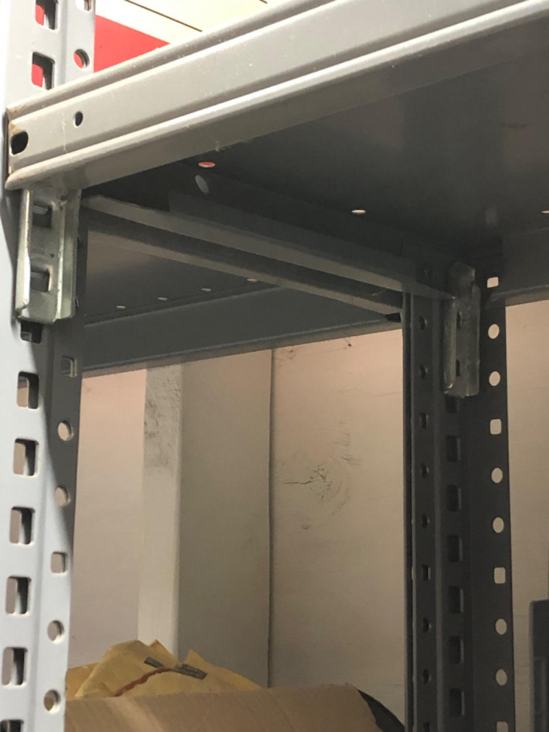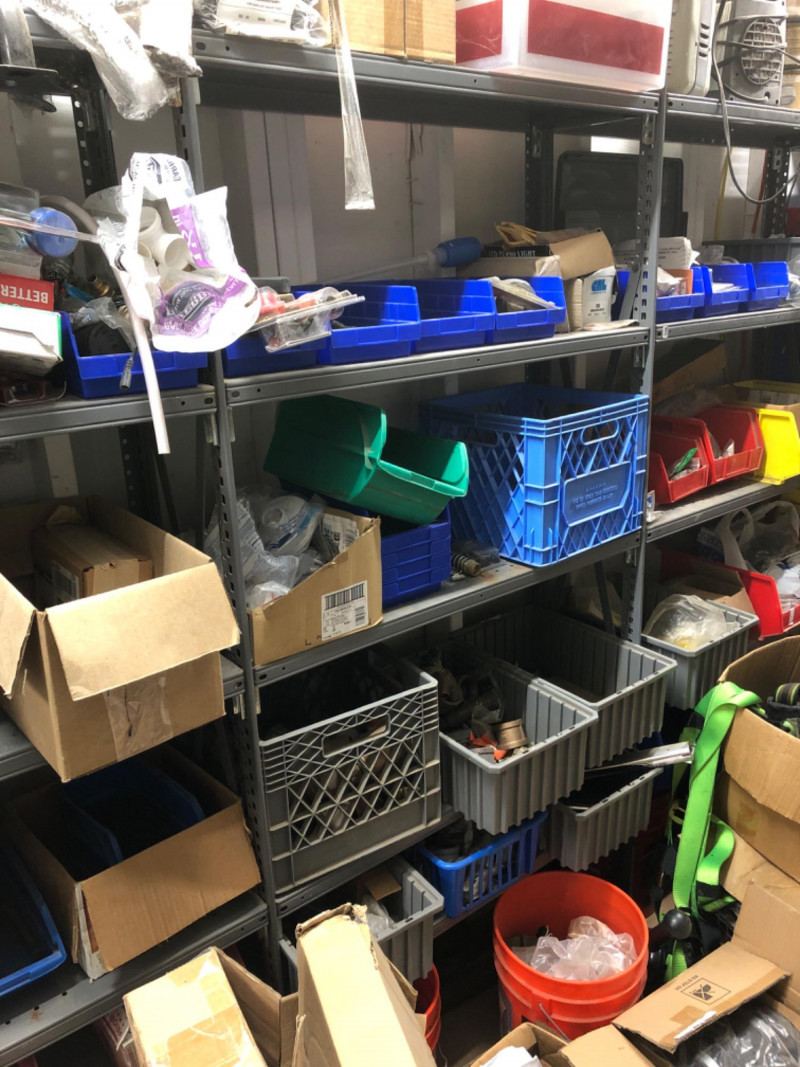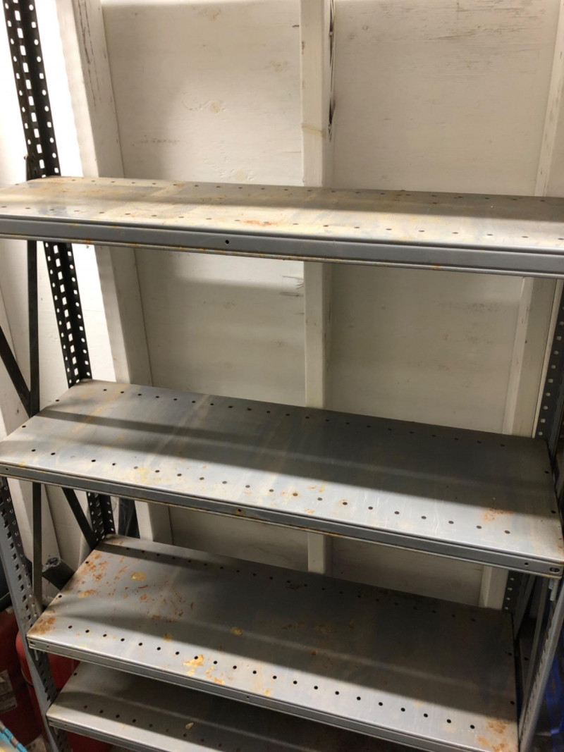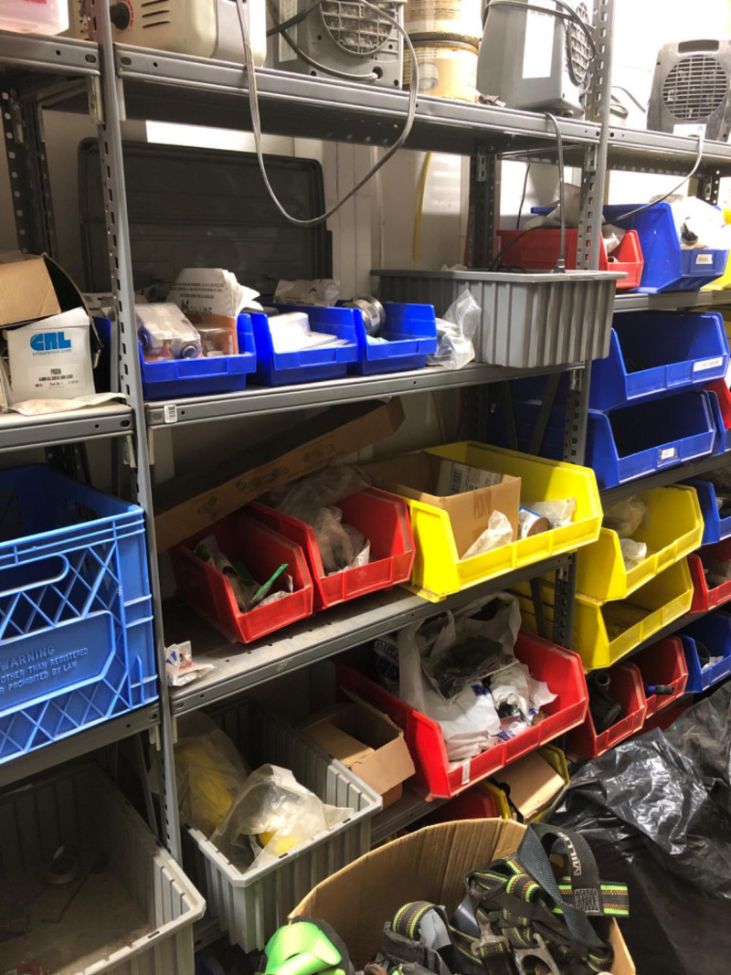 This shelving unit is in five sections and connected together to create one single organization unit. Each unit has approximately five (5) shelves. Dimensions of each shelf unit: 88" height x 36" width x 12" depth. Overall length would span 15 feet. Includes all bins and various hardware and/or tools. Items range from electronics parts and supplies to lighting, hinges, metal plumbing parts and other building materials. This shelving is located on an upper floor with steep staircase. Plan time to pack and load. Later on the last day of pickups is suggested for easier access and removal. Bring additional bins or boxes to pack items.