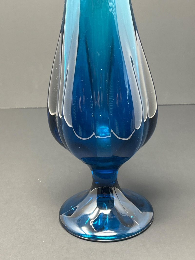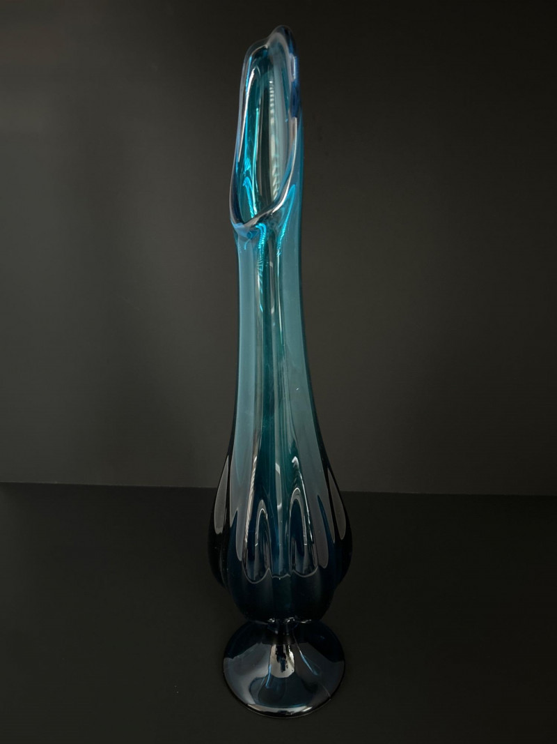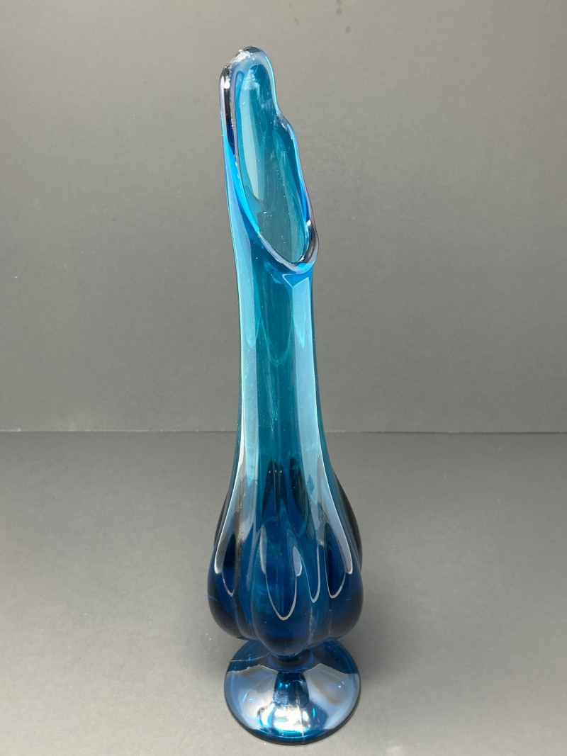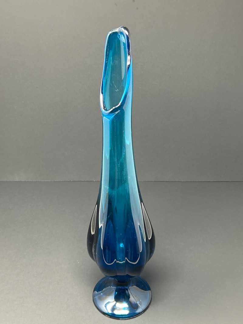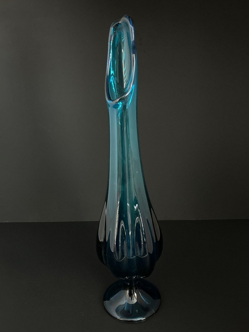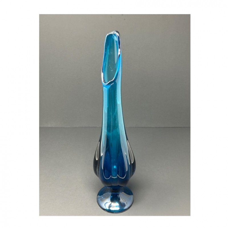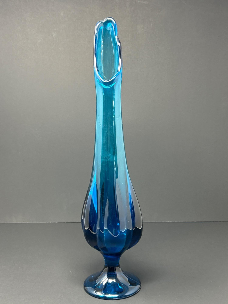 A dramatic hand-blown swung glass vase in rich gradient blue, featuring a flared asymmetrical rim and elongated neck that flows into a bulbous base. The glass transitions from pale blue at the top to deep cobalt at the base, with clear accents along the sides that catch the light beautifully. Sculptural and fluid, this piece exemplifies mid-century artistry with bold vertical presence. Height: 18" Width: Approx. 5" at widest point Base Diameter: 3.5" Hand-blown art glass Swung vase form with asymmetrical rim Gradient blue coloration with clear accents Likely mid-20th century American studio or Viking-style production UnmarkedItem Details
