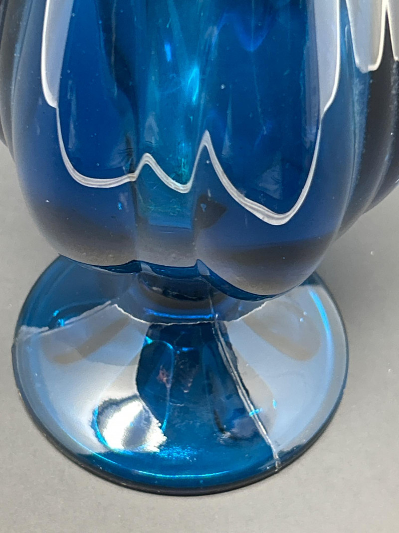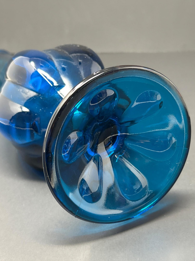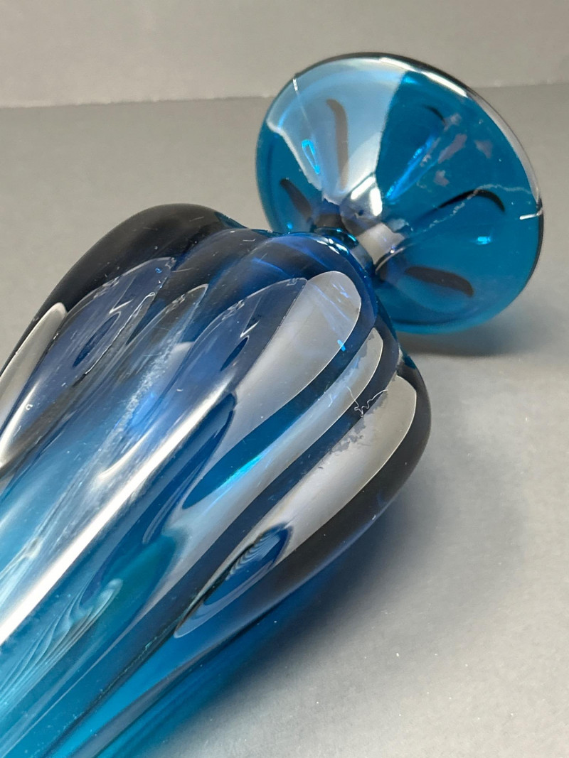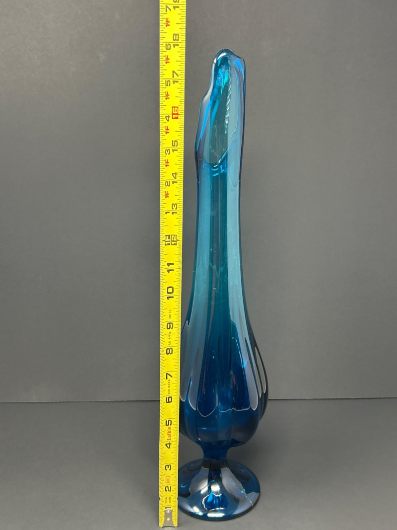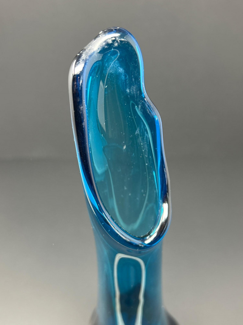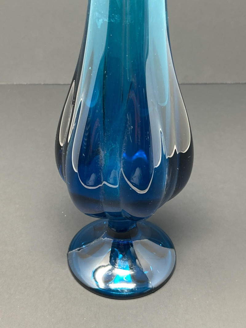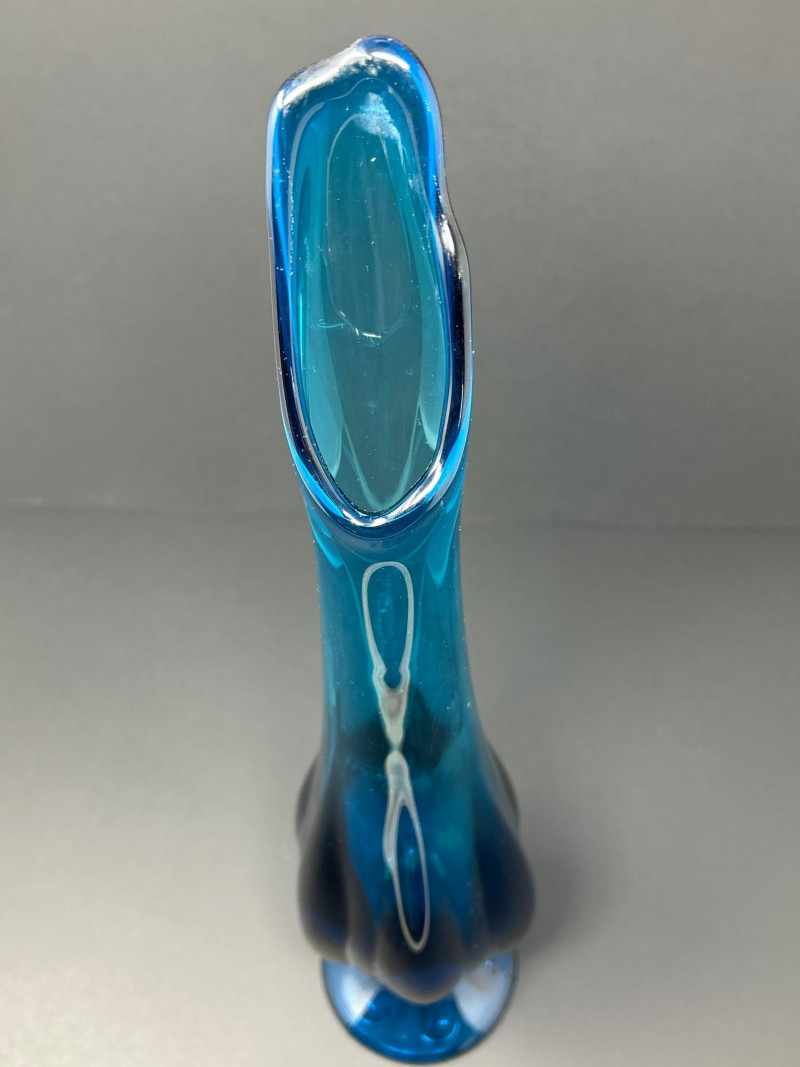 A dramatic hand-blown swung glass vase in rich gradient blue, featuring a flared asymmetrical rim and elongated neck that flows into a bulbous base. The glass transitions from pale blue at the top to deep cobalt at the base, with clear accents along the sides that catch the light beautifully. Sculptural and fluid, this piece exemplifies mid-century artistry with bold vertical presence. Height: 18" Width: Approx. 5" at widest point Base Diameter: 3.5" Hand-blown art glass Swung vase form with asymmetrical rim Gradient blue coloration with clear accents Likely mid-20th century American studio or Viking-style production UnmarkedItem Details