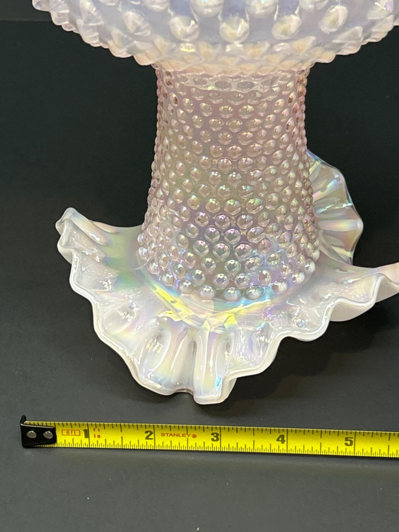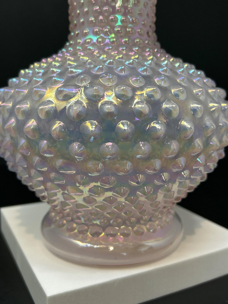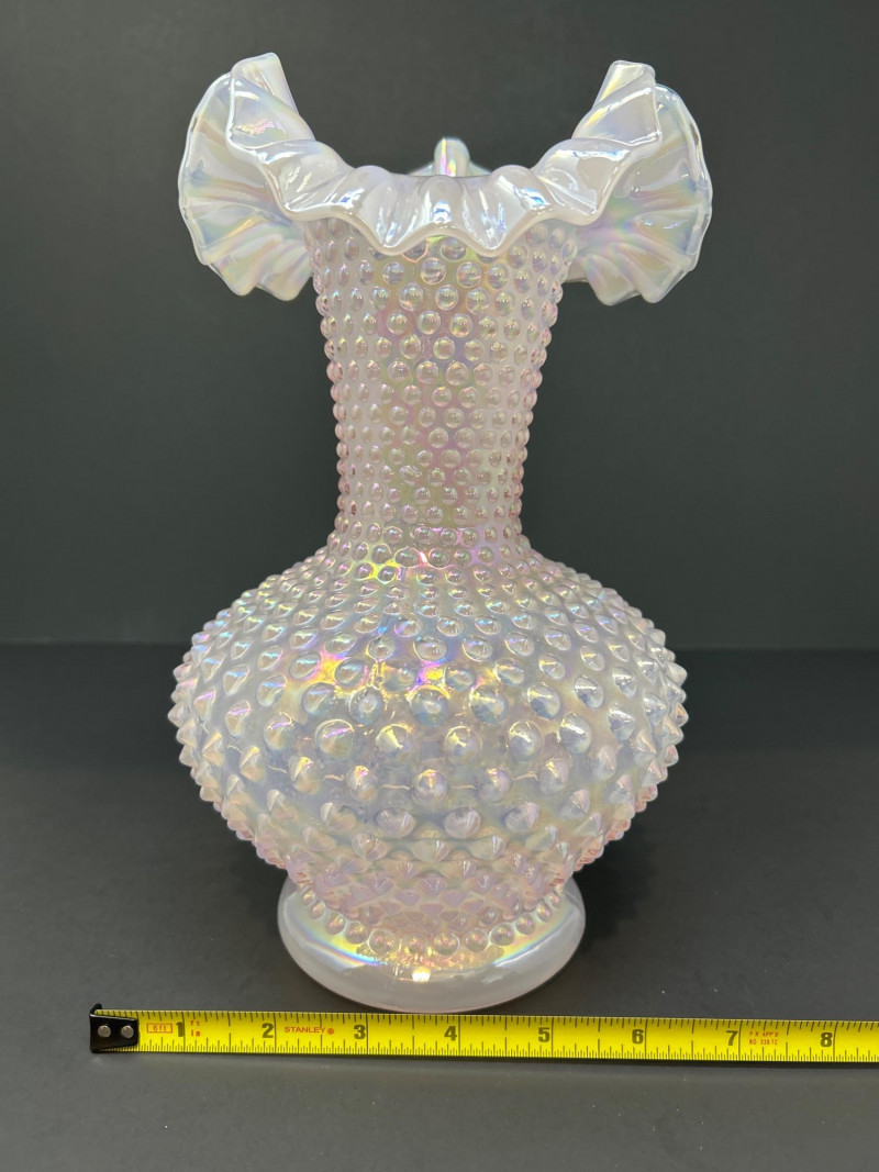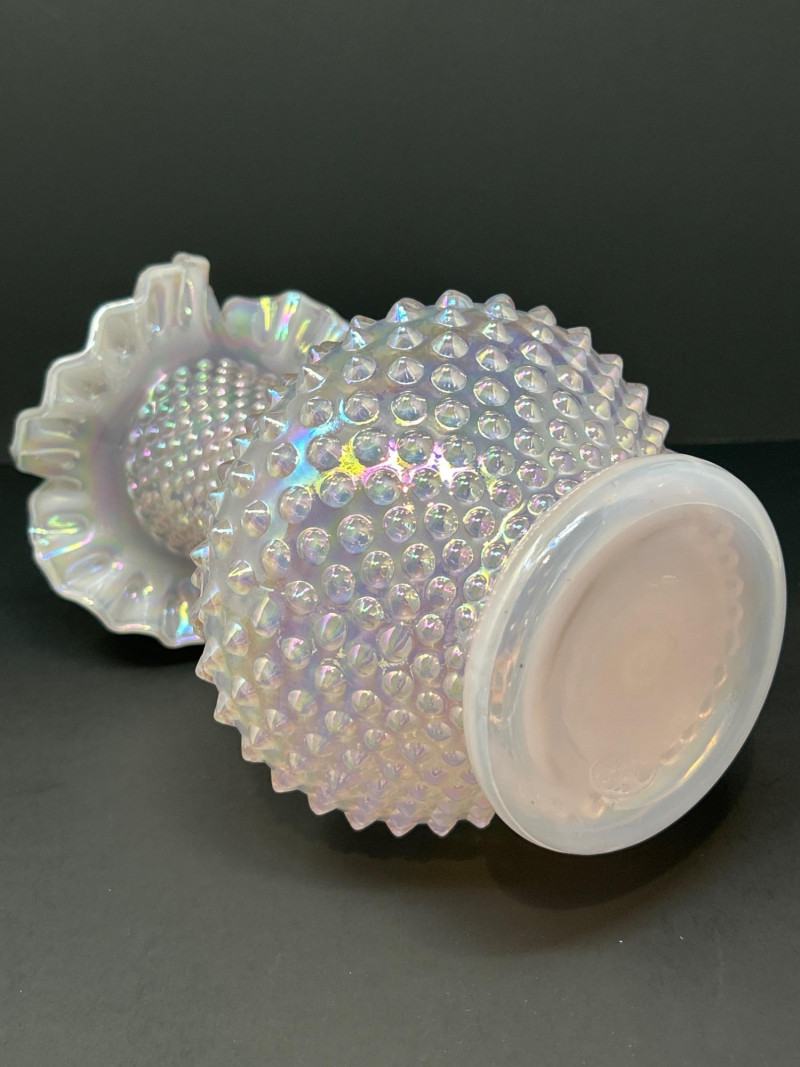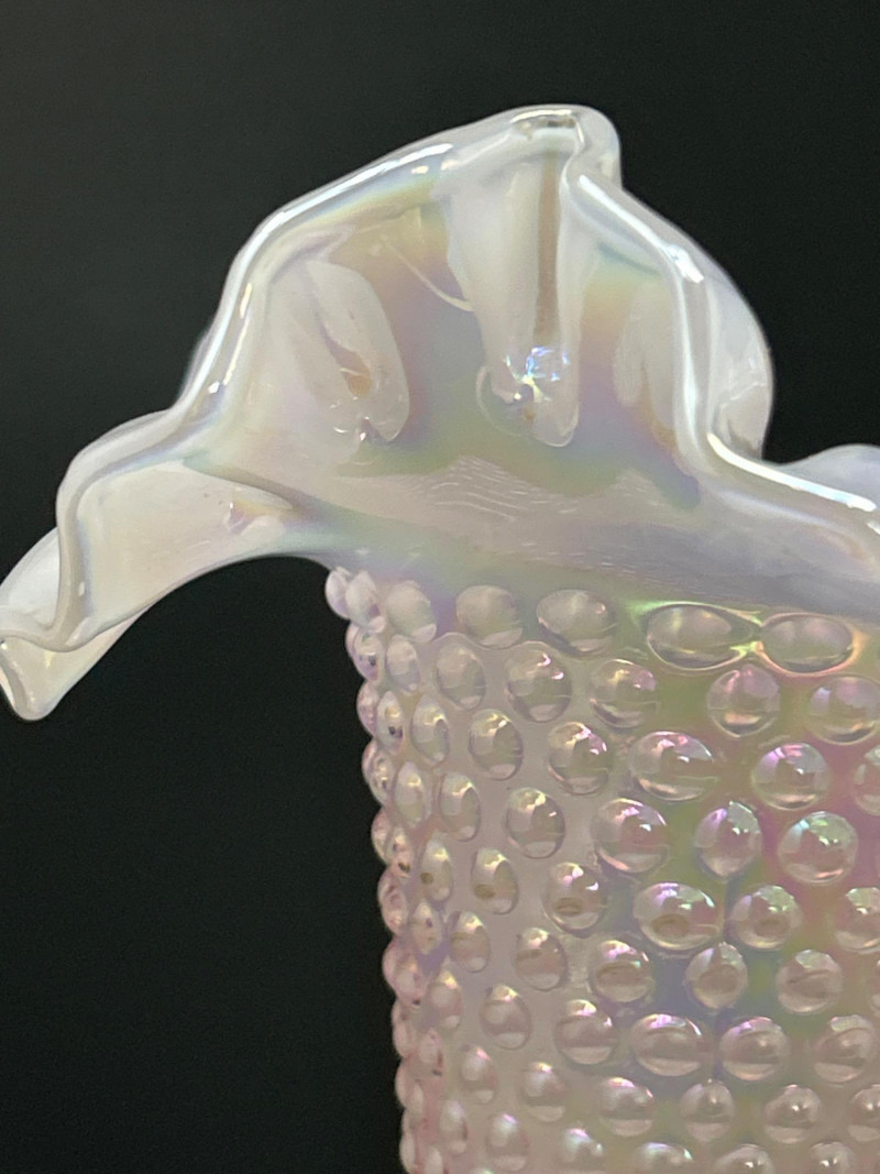 A luminous Fenton Art Glass hobnail vase in soft pink with a radiant iridescent finish. This tall, mould-blown piece features a bulbous hobnail-textured body that tapers into a slender neck and flares into a wide ruffled rim measuring 5" across. The shimmering surface reflects pastel hues, adding depth and vintage charm. A standout example of mid-century Fenton craftsmanship—elegant, tactile, and unmistakably collectible. Maker: Fenton Art Glass Company Date: Circa 1950s Height: 12" Rim Width: 5" Color: Pink iridescent Form: Hobnail body with ruffled rim Technique: Mould-blown and hand-finished glass Condition: Excellent vintage condition; no chips or crackstem Details