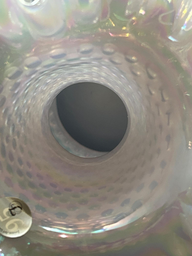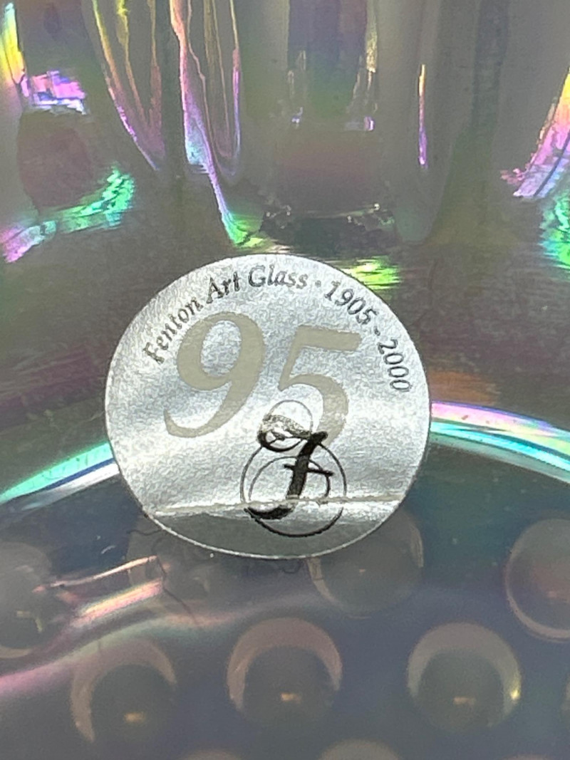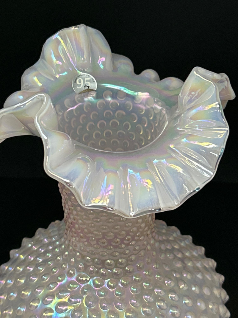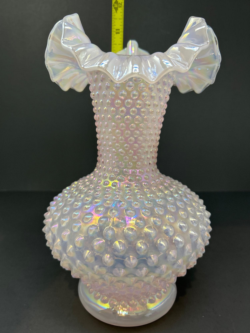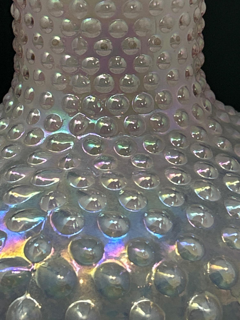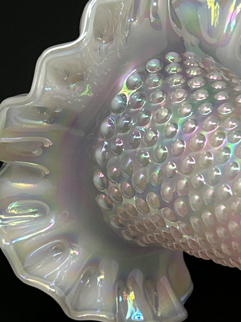 A luminous Fenton Art Glass hobnail vase in soft pink with a radiant iridescent finish. This tall, mould-blown piece features a bulbous hobnail-textured body that tapers into a slender neck and flares into a wide ruffled rim measuring 5" across. The shimmering surface reflects pastel hues, adding depth and vintage charm. A standout example of mid-century Fenton craftsmanship—elegant, tactile, and unmistakably collectible. Maker: Fenton Art Glass Company Date: Circa 1950s Height: 12" Rim Width: 5" Color: Pink iridescent Form: Hobnail body with ruffled rim Technique: Mould-blown and hand-finished glass Condition: Excellent vintage condition; no chips or crackstem Details