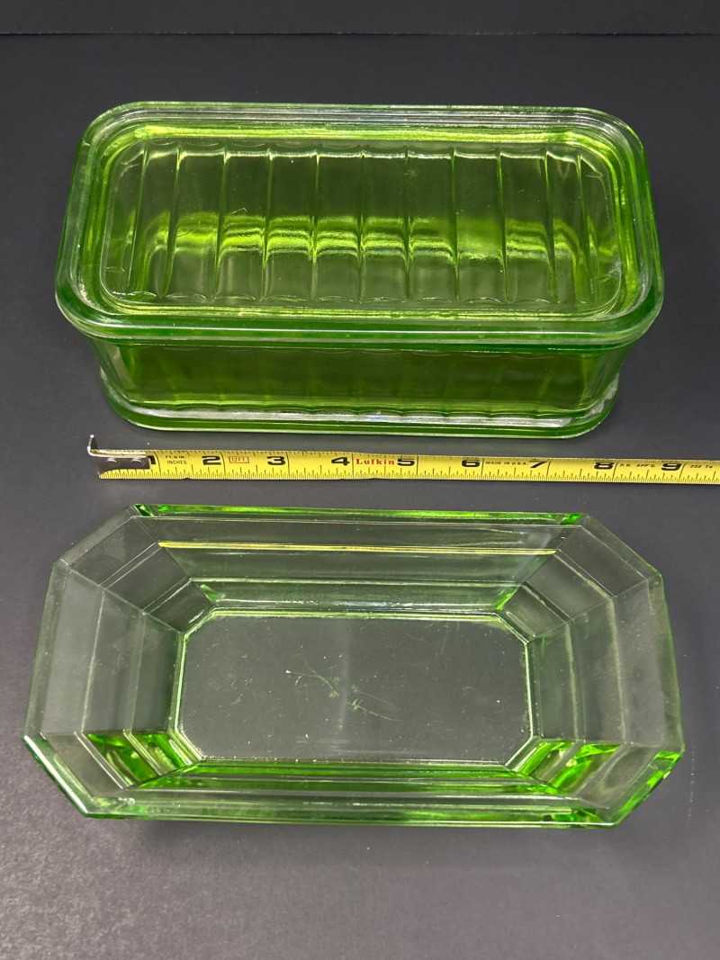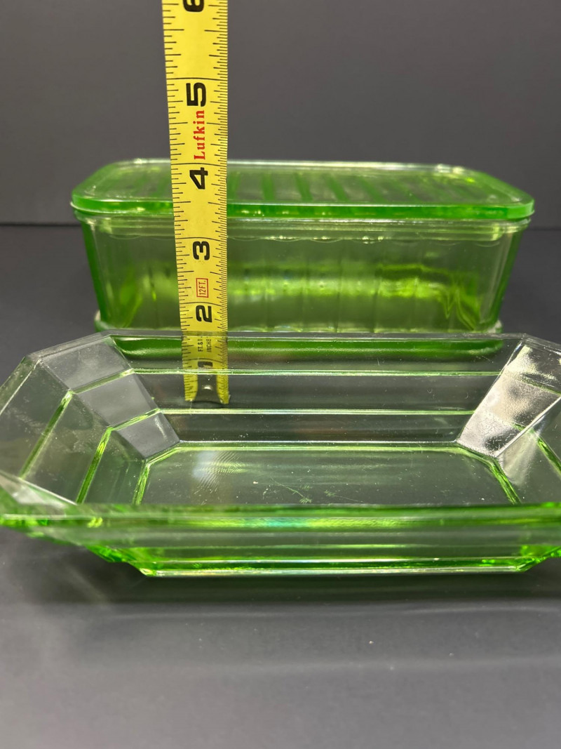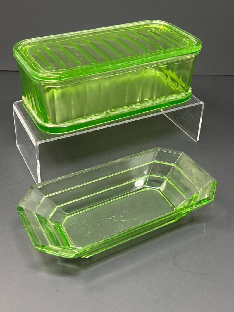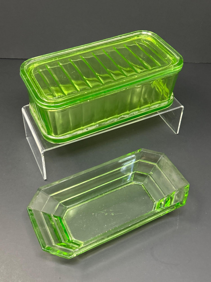 Lot # 8 - Uranium Glass Fridgie Dish with Lid and Divided Relish Dish