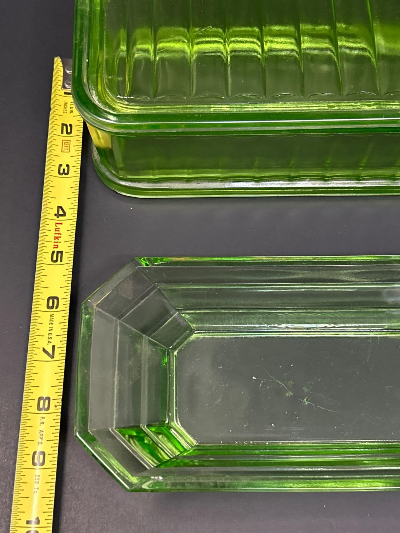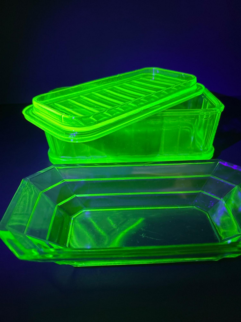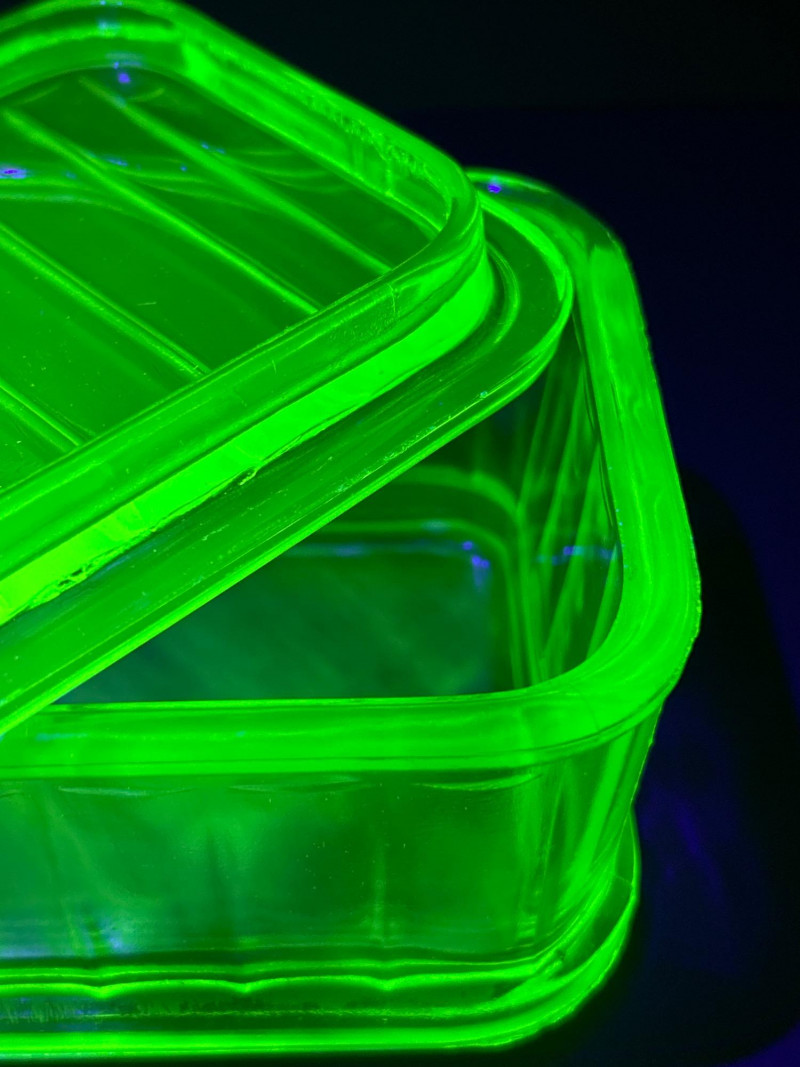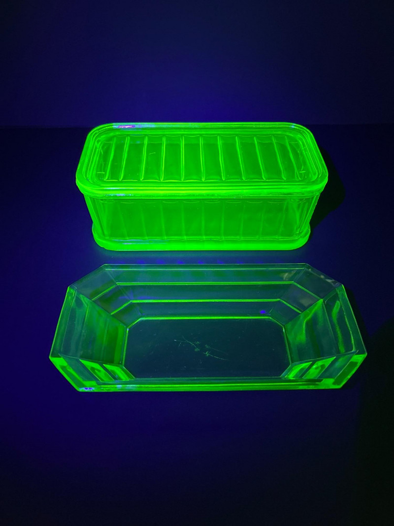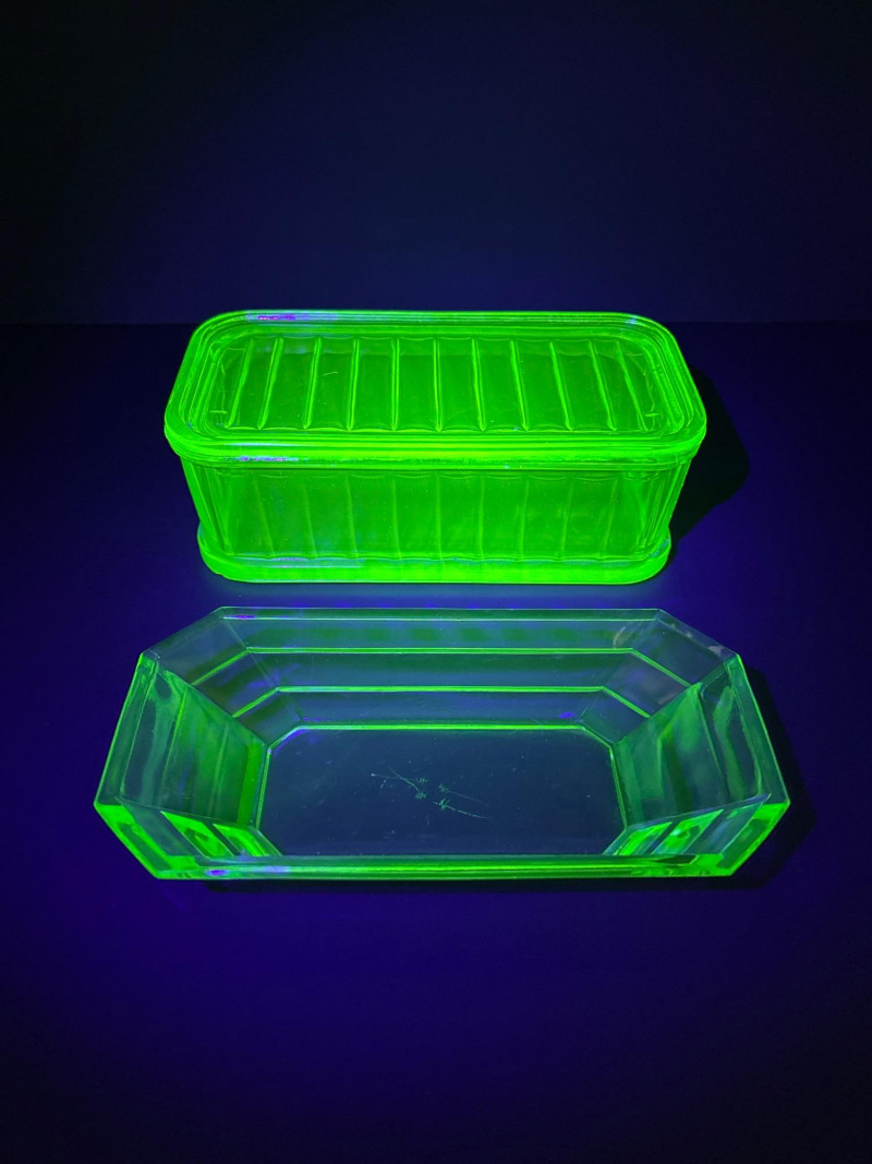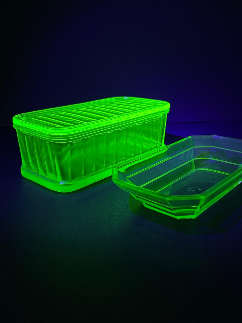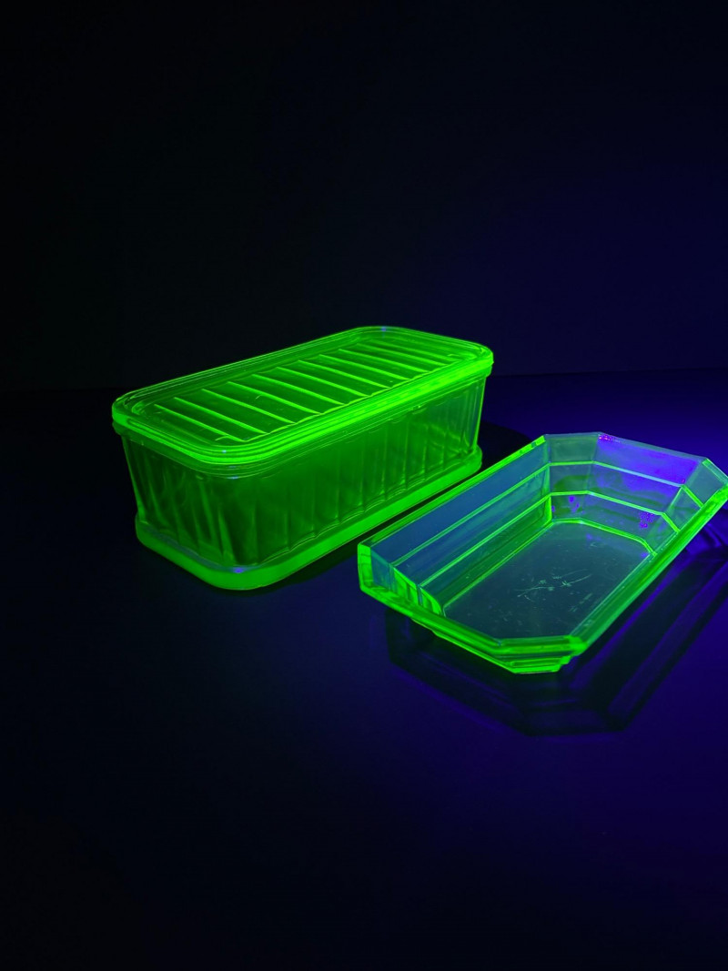 A glowing pair of uranium glass tableware pieces from the Depression era, featuring a divided relish dish and a rectangular Fridgie with matching lid. Both pieces display the signature yellow-green hue of Vaseline glass and emit a brilliant neon glow under UV light. The relish dish has a crisp octagonal form with an interior divider, while the Fridgie shows classic ribbed sides and a fitted lid—an elegant and functional duo that beautifully represents early 20th-century American glass craftsmanship. Maker: Unmarked (likely Indiana Glass or Anchor Hocking)Item Details