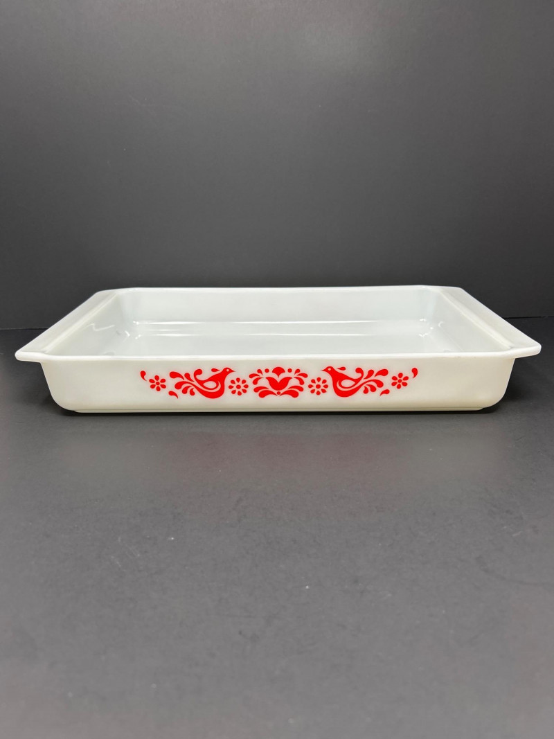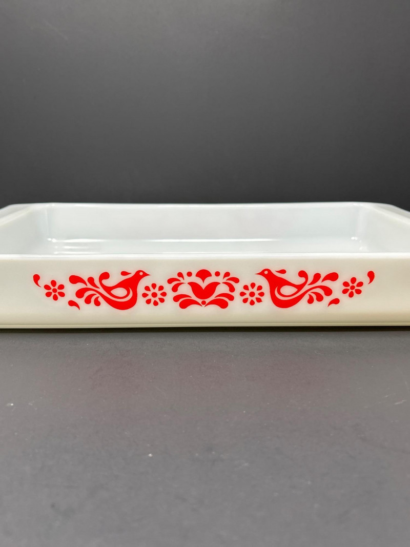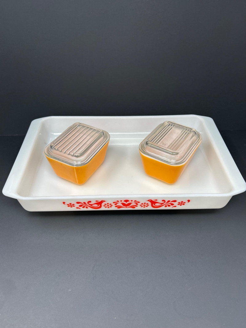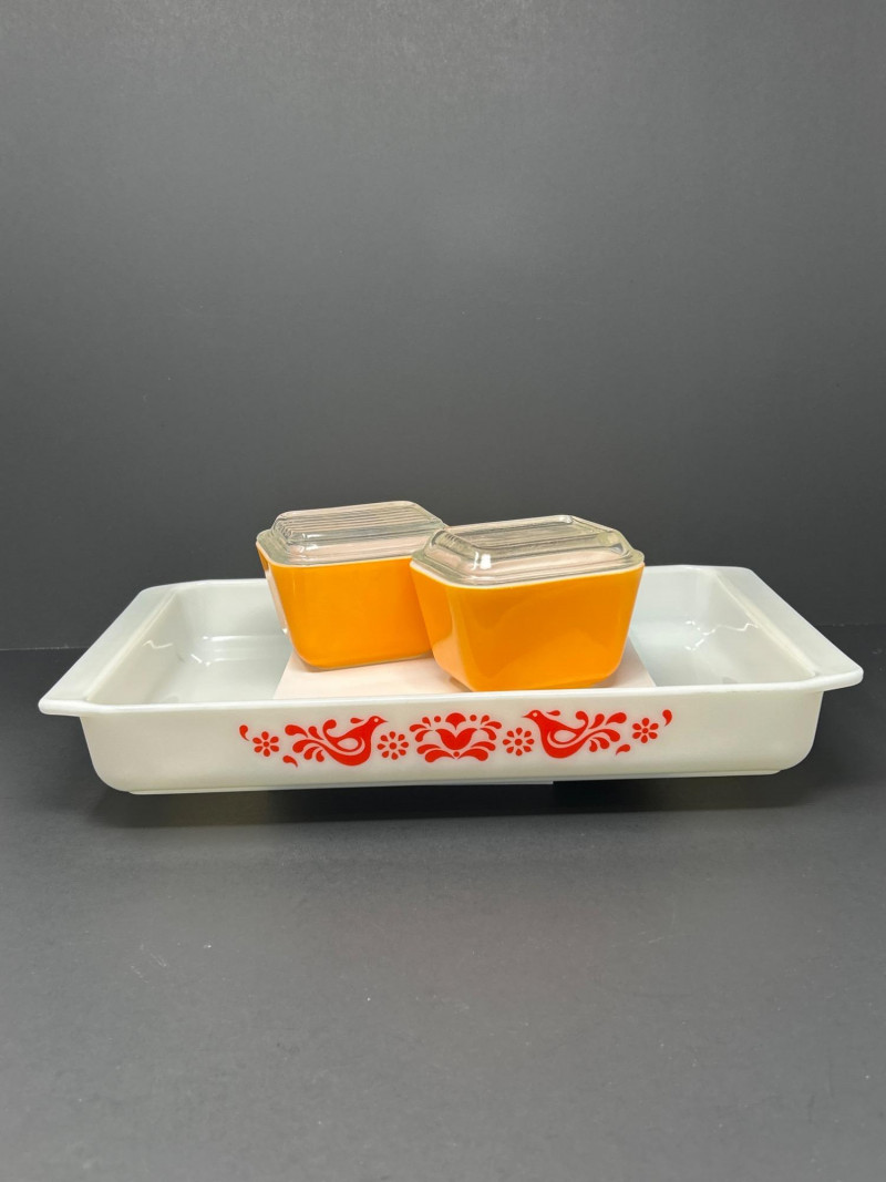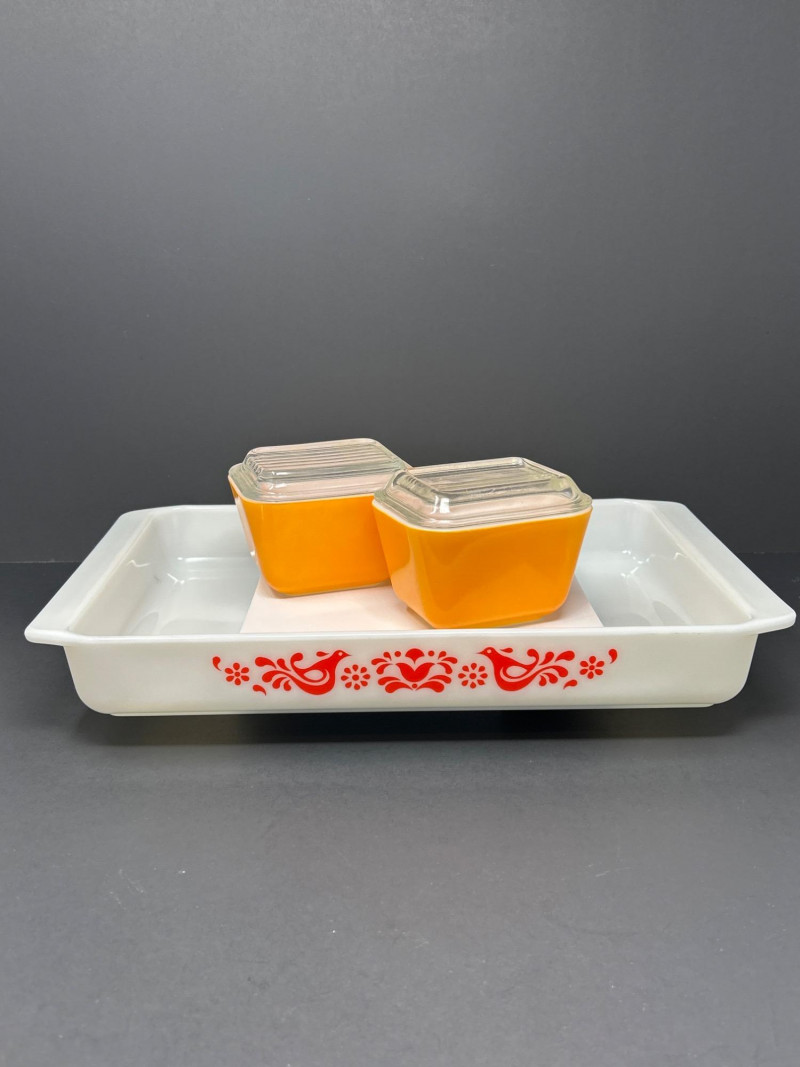 A cheerful Pyrex “Friendship” 933 Lasagna Pan paired with two coordinating 501-B orange Fridgies with glass lids, showcasing one of Pyrex’s most beloved mid-century designs. The 933 pan features the iconic red bird and floral motif on white opal glass, part of the Friendship pattern introduced in the early 1970s by Corning Glass Works. With its bright, optimistic design and durable construction, this set embodies both the collectible charm and everyday practicality that make vintage Pyrex so enduring. Maker: Pyrex (Corning Glass Works)Item Details: