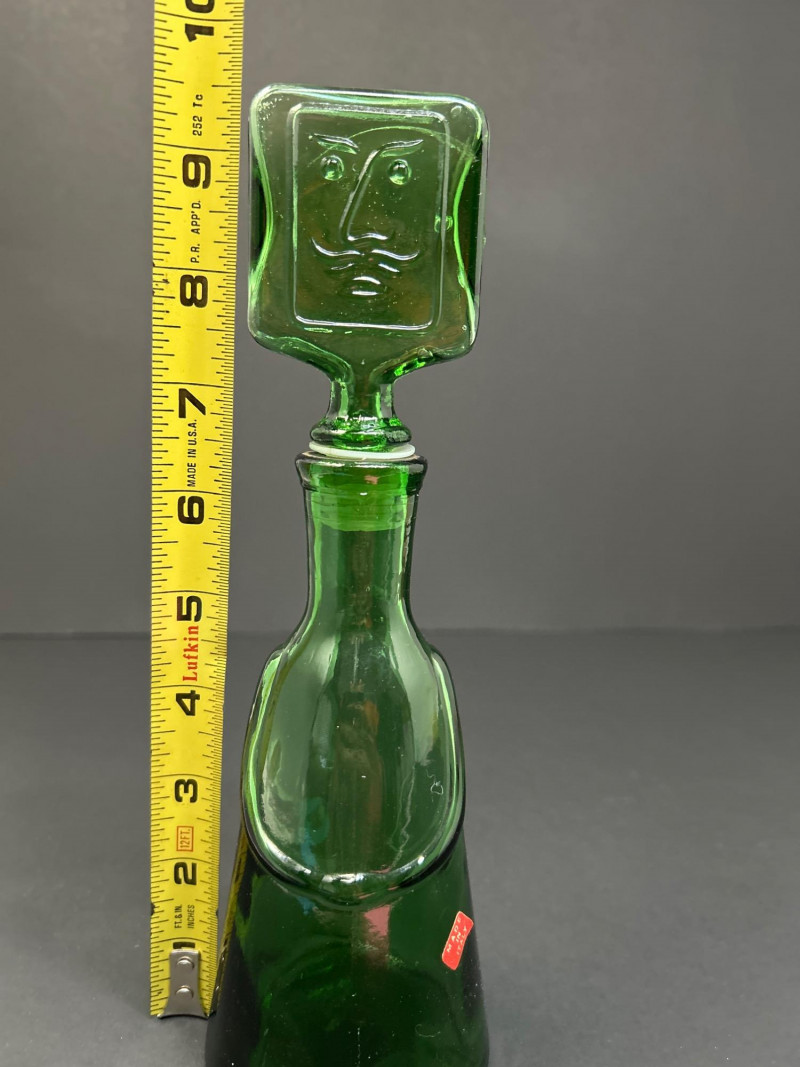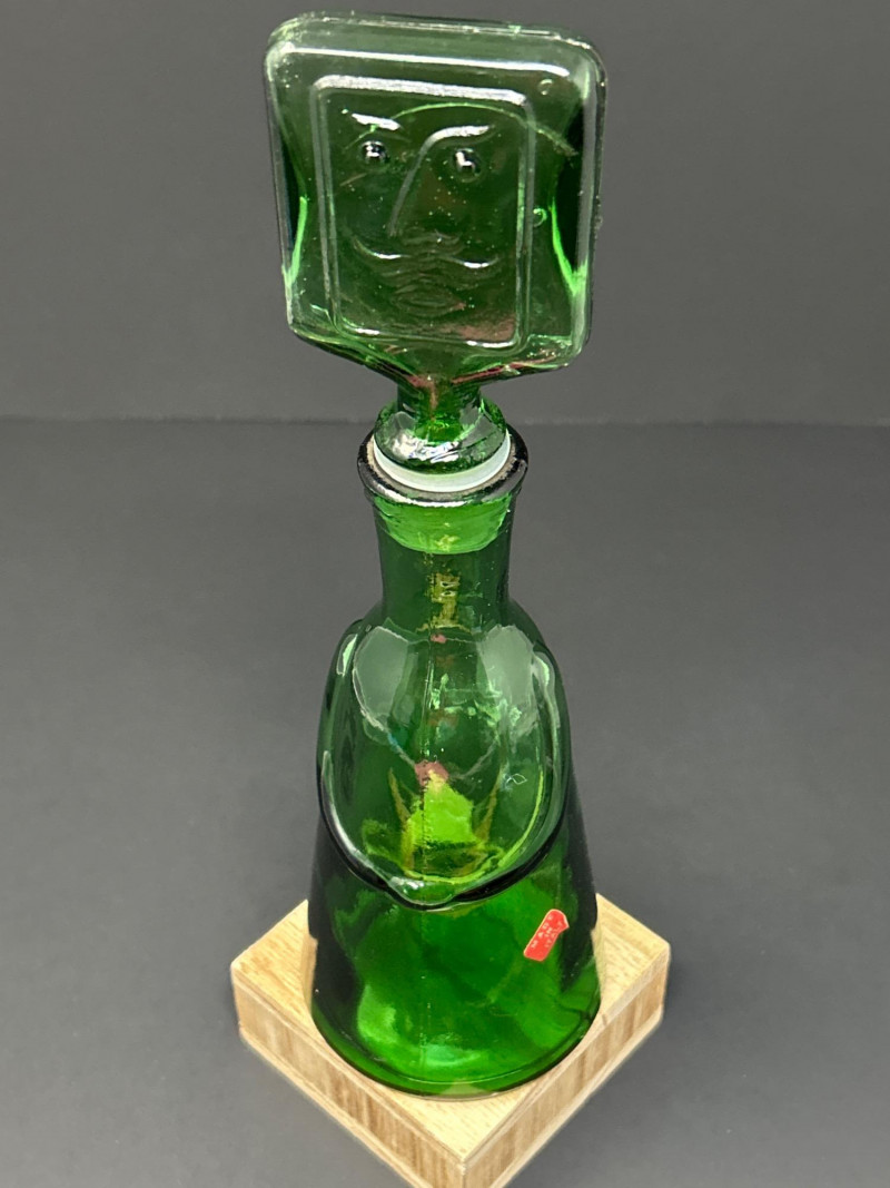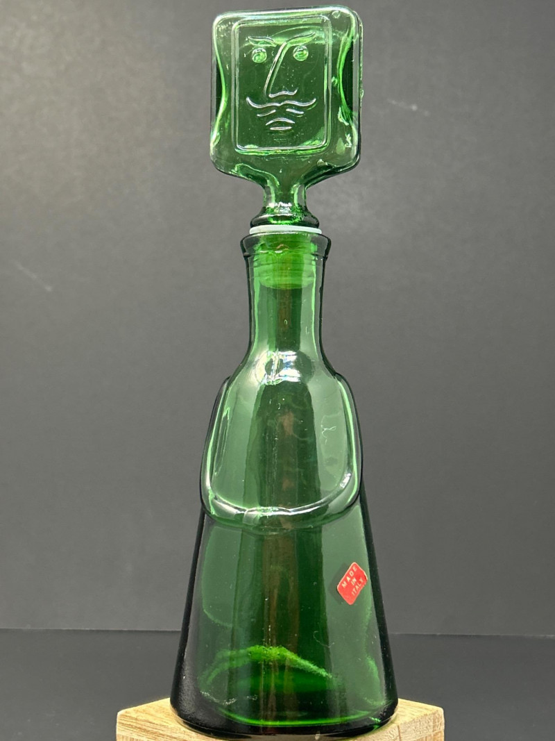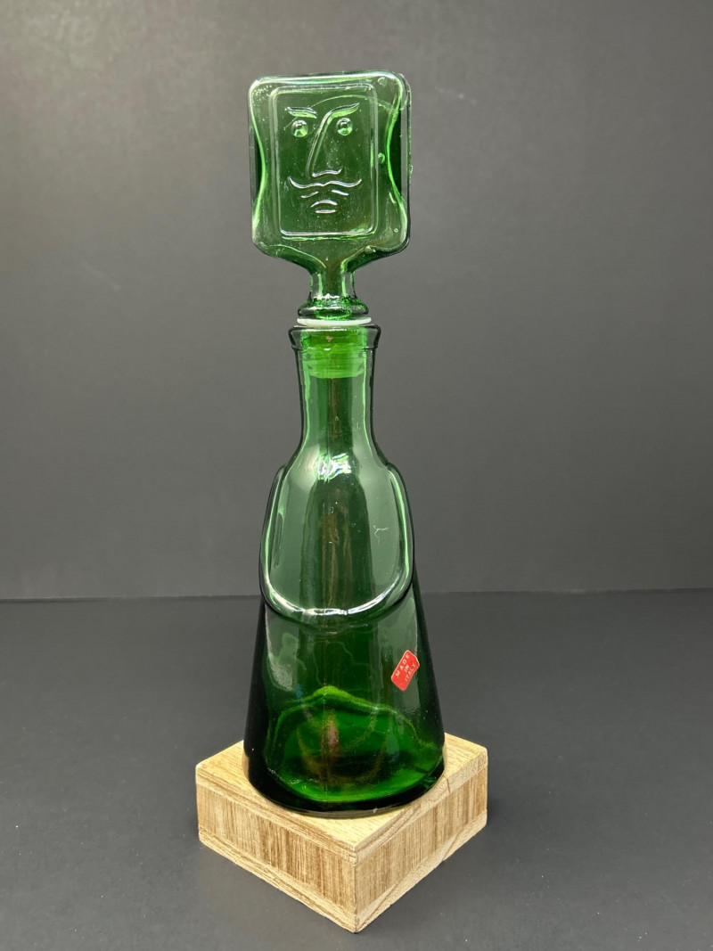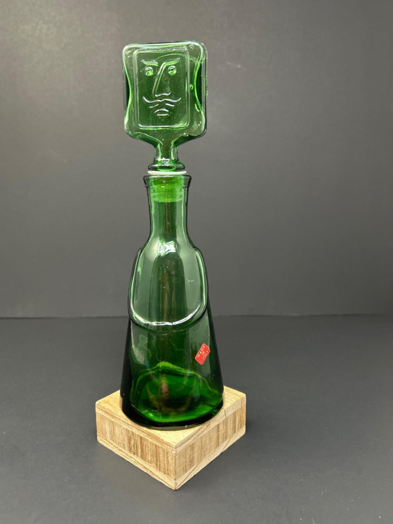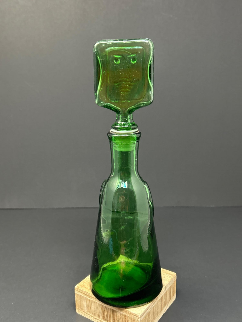 A rare mid-century modern green glass decanter designed by Erik Höglund for Kosta Boda, Sweden, featuring the artist’s iconic sculpted “man face” stopper. The geometric head stopper with stylized features sits atop a fluidly shaped bottle base, hand-blown in deep emerald glass. A hallmark of Scandinavian modern design, this piece embodies Höglund’s playful yet primitive aesthetic and his innovative approach to art glass during the 1950s–60s. Item Details: Designer: Erik Höglund (1932–1998) Maker: Kosta Boda Glassworks, Sweden Pattern/Series: “Man Bottle” / People Series Material: Hand-blown glass Color: Emerald green Dimensions: Approx. 9¾″ H × 4″ W Date: Circa 1950s–1960s Origin: Sweden Collecting Note: Erik Höglund’s People Series decanters were created in multiple colors and expressive face styles. Each stopper was uniquely molded, often representing men, women, or abstract visages. These pieces are highly collectible and emblematic of the Swedish mid-century glass movement.