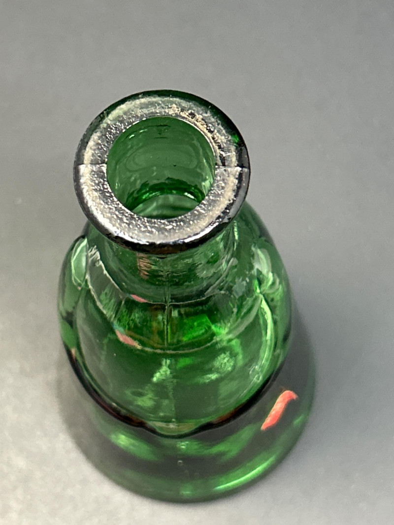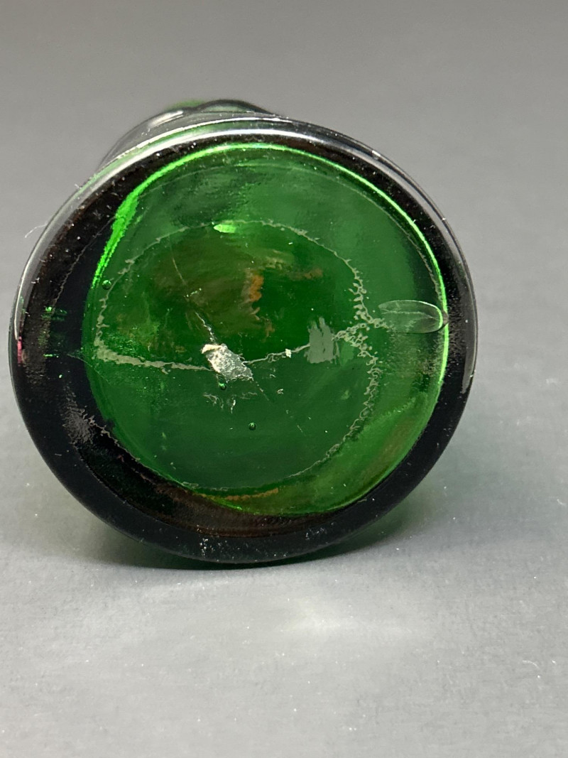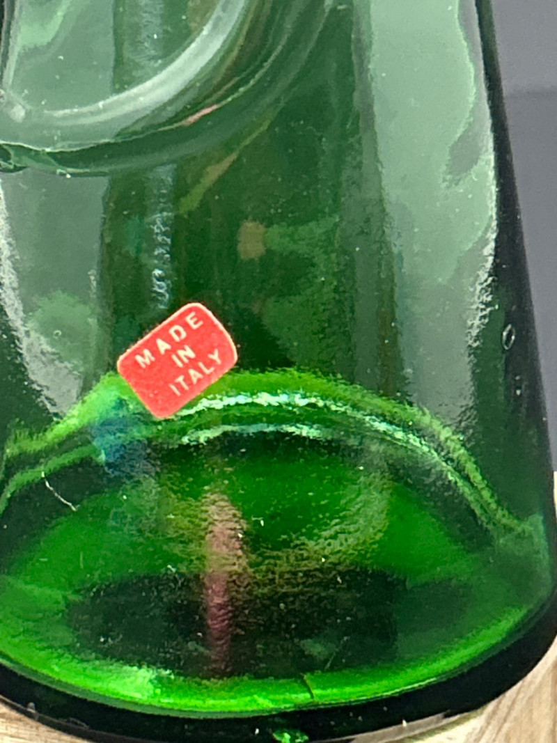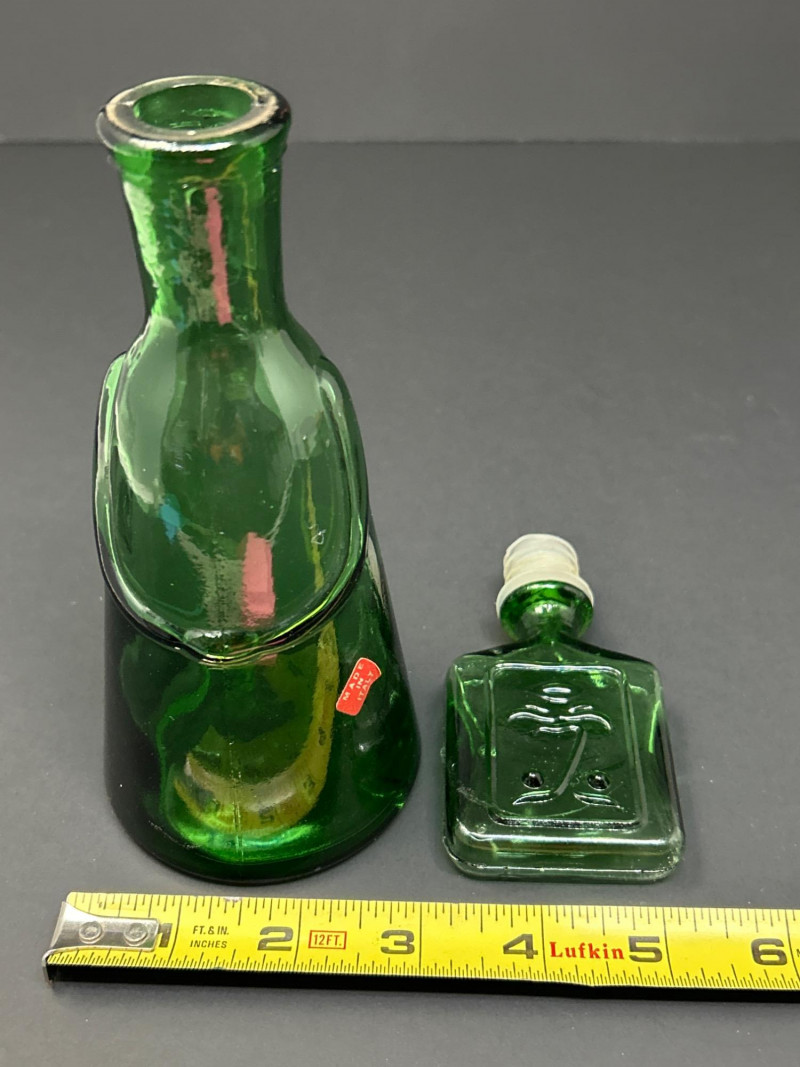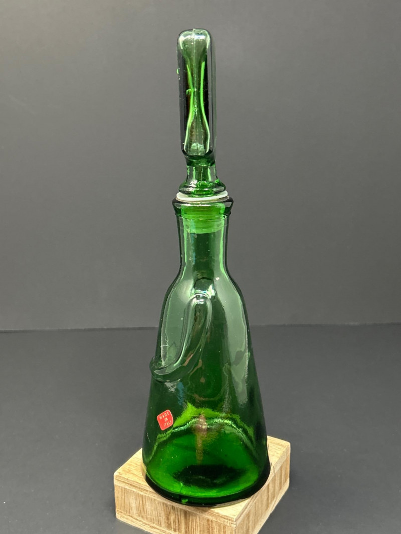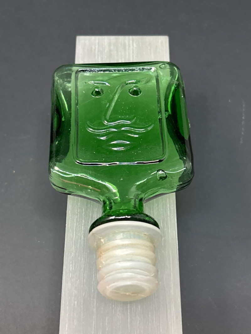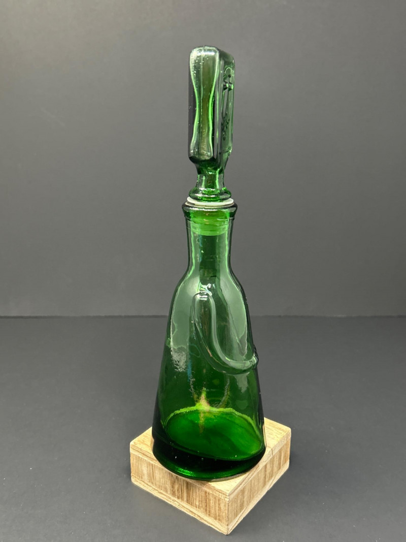 A rare mid-century modern green glass decanter designed by Erik Höglund for Kosta Boda, Sweden, featuring the artist’s iconic sculpted “man face” stopper. The geometric head stopper with stylized features sits atop a fluidly shaped bottle base, hand-blown in deep emerald glass. A hallmark of Scandinavian modern design, this piece embodies Höglund’s playful yet primitive aesthetic and his innovative approach to art glass during the 1950s–60s. Item Details: Designer: Erik Höglund (1932–1998) Maker: Kosta Boda Glassworks, Sweden Pattern/Series: “Man Bottle” / People Series Material: Hand-blown glass Color: Emerald green Dimensions: Approx. 9¾″ H × 4″ W Date: Circa 1950s–1960s Origin: Sweden Collecting Note: Erik Höglund’s People Series decanters were created in multiple colors and expressive face styles. Each stopper was uniquely molded, often representing men, women, or abstract visages. These pieces are highly collectible and emblematic of the Swedish mid-century glass movement.