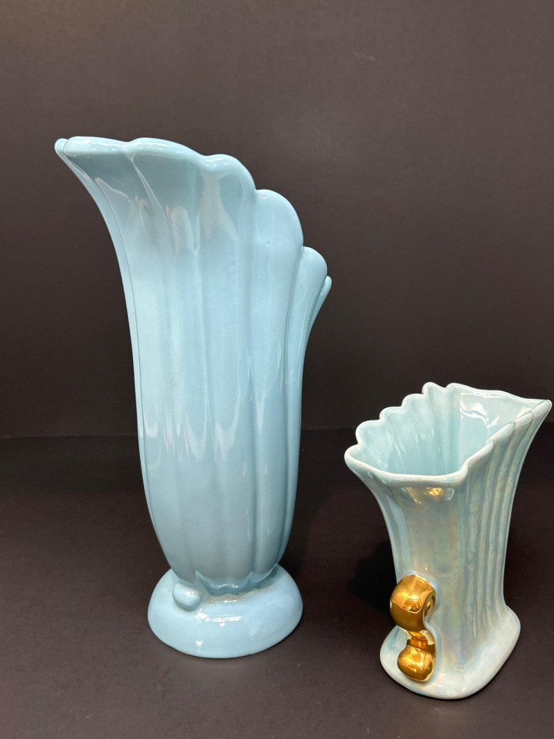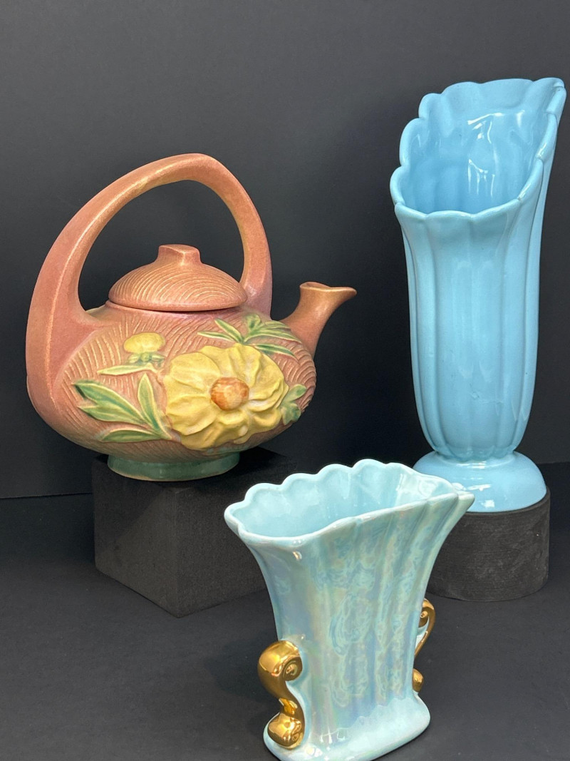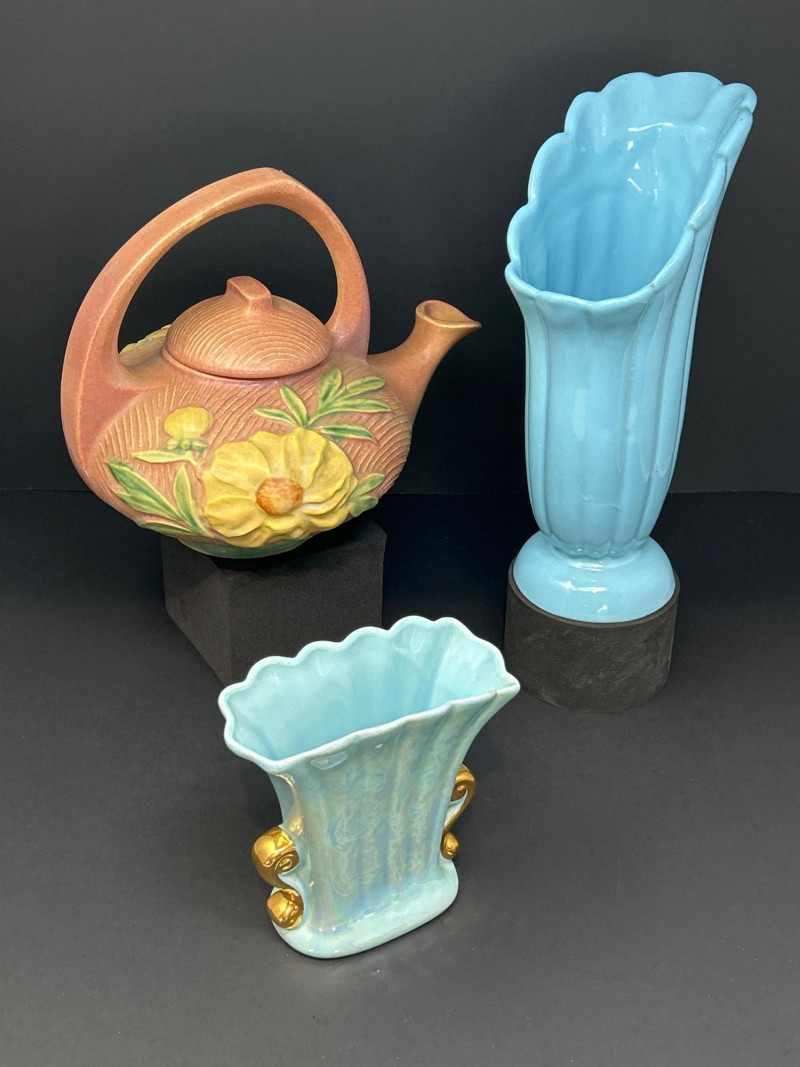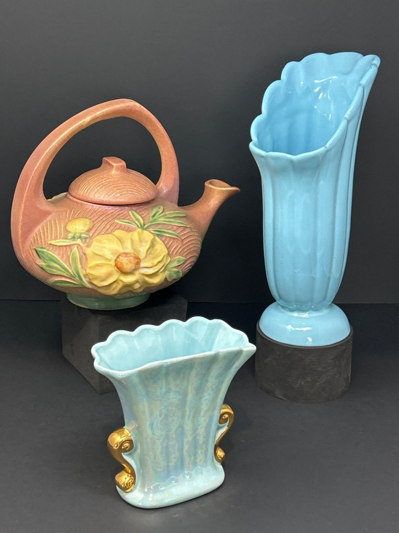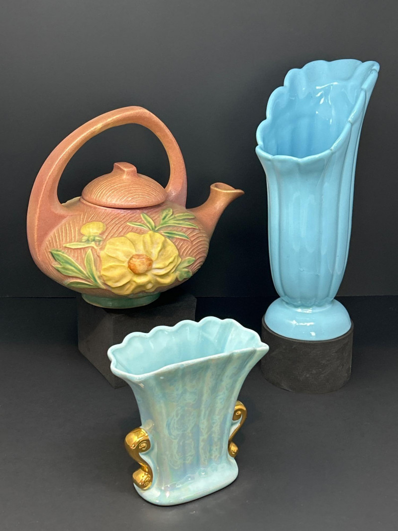 A refined trio of American art pottery featuring a Roseville Pottery Peony teapot, a tall Abingdon Pottery vase in soft powder blue, and an Iridescent Fan Vase with 22K Gold handles. Together, they highlight the artistry and color palette of 1940s–1950s American ceramics, uniting sculpted matte relief, Deco curves, and shimmering luster finishes. Roseville Pottery Teapot Abingdon Pottery Vase Iridescent Fan Vase with 22K GoldItem Details: