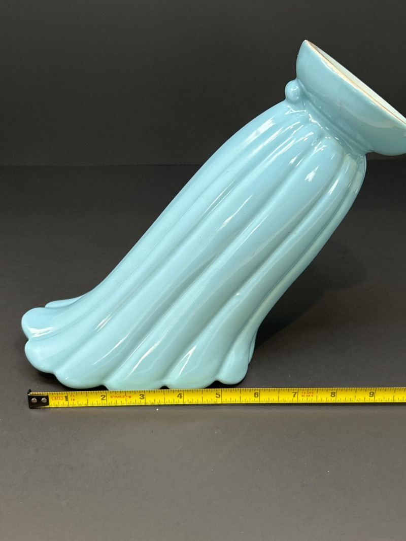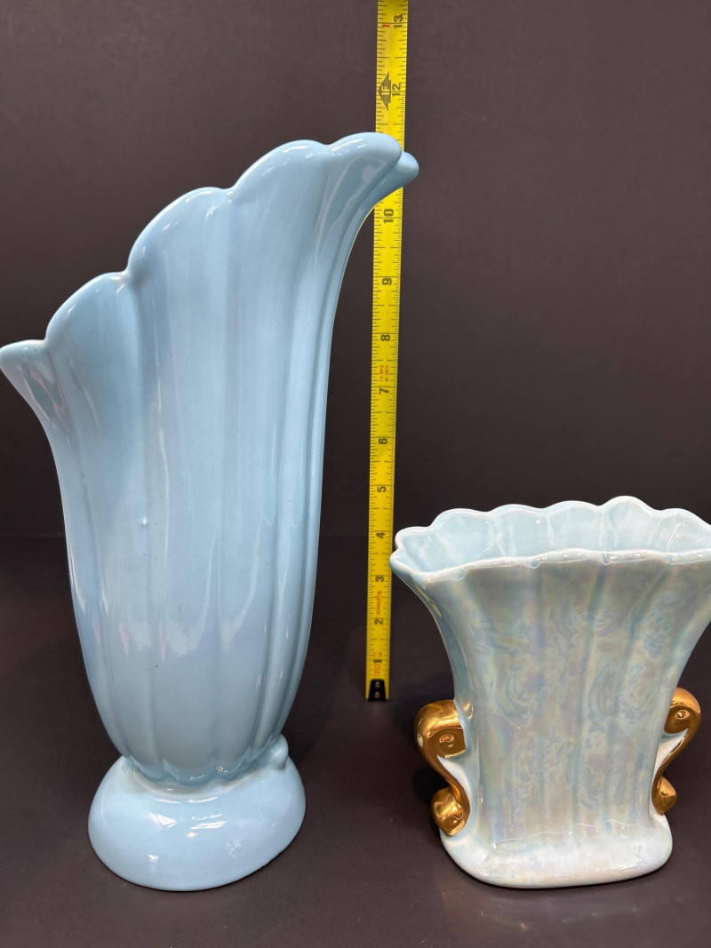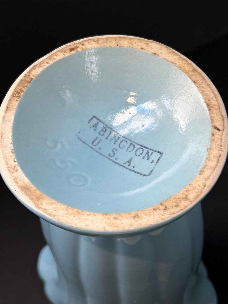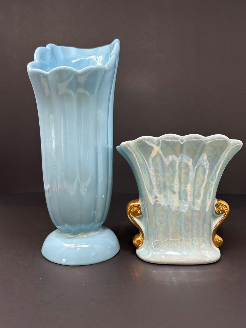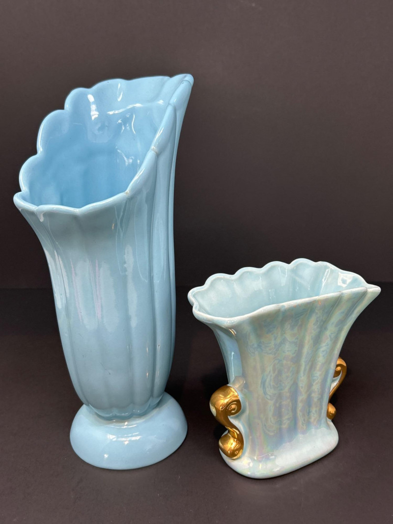 A refined trio of American art pottery featuring a Roseville Pottery Peony teapot, a tall Abingdon Pottery vase in soft powder blue, and an Iridescent Fan Vase with 22K Gold handles. Together, they highlight the artistry and color palette of 1940s–1950s American ceramics, uniting sculpted matte relief, Deco curves, and shimmering luster finishes. Roseville Pottery Teapot Abingdon Pottery Vase Iridescent Fan Vase with 22K GoldItem Details: