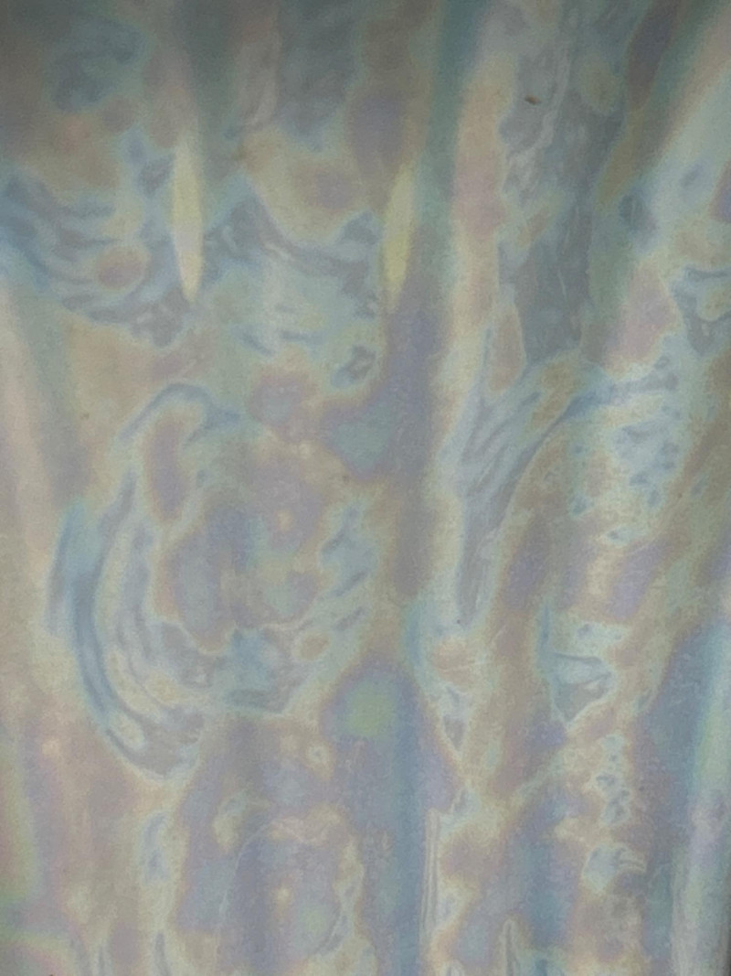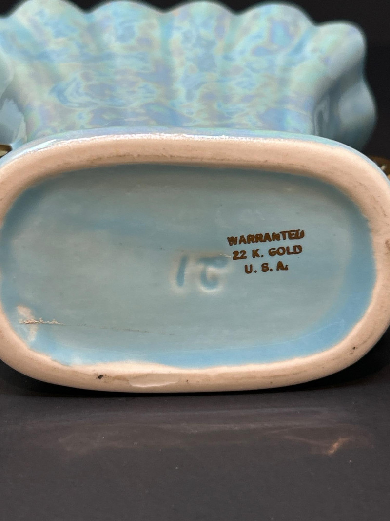 Color / Finish: Iridescent aqua glaze with gilt scroll handles
