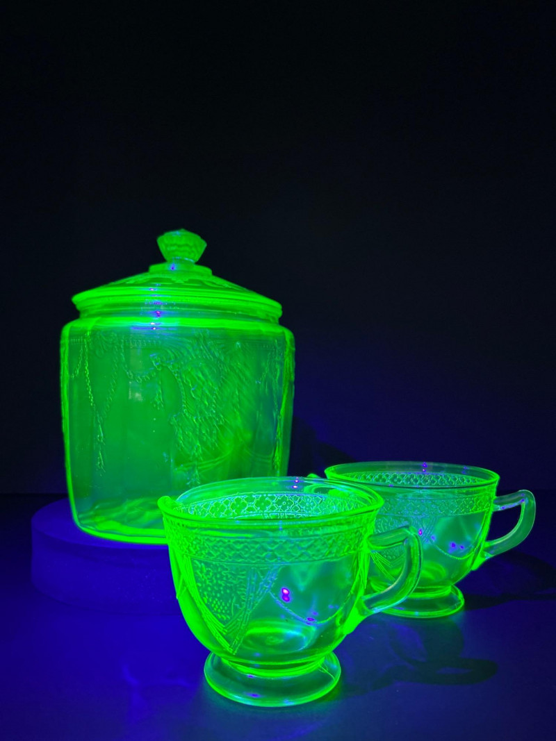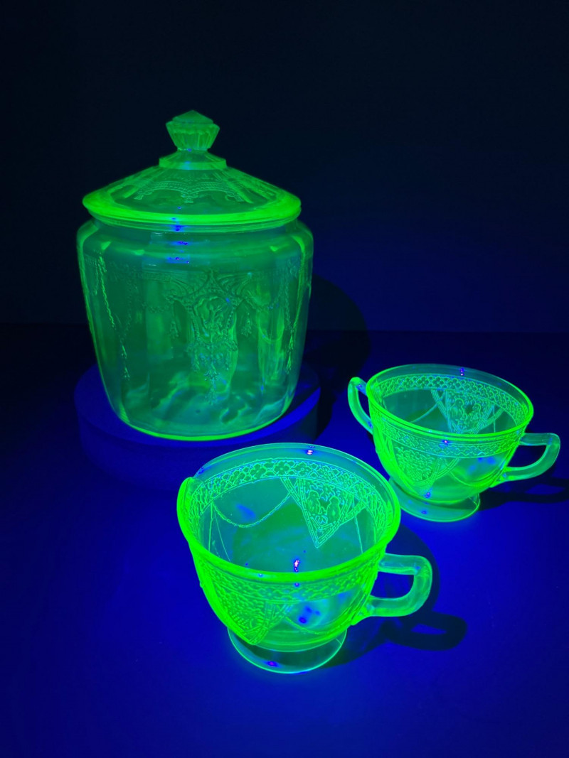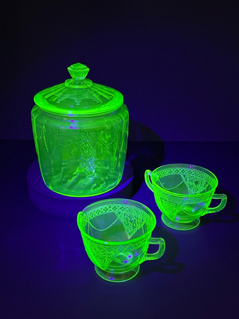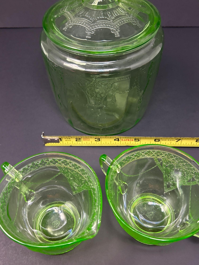 A luminous trio of Depression-era uranium glass featuring an Etched Cookie Biscuit Jar paired with a Federal Glass “Georgian Lovebirds” Creamer and Sugar Bowl. Each piece glows vividly under ultraviolet light, radiating the brilliant neon-green hue characteristic of authentic Vaseline glass. The jar showcases an elegant etched draped-garland motif with a domed lid and faceted finial, while the creamer and sugar display Federal’s classic Lovebirds pattern of stylized birds framed within garlanded triangles. Together, they capture the charm and craftsmanship of 1930s American pressed glass artistry. Etched Cookie Biscuit Jar Federal Glass Creamer & Sugar SetItem Details: