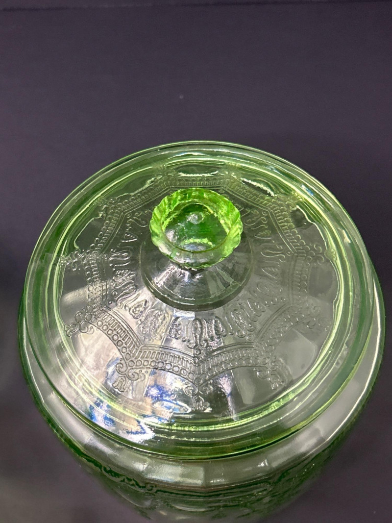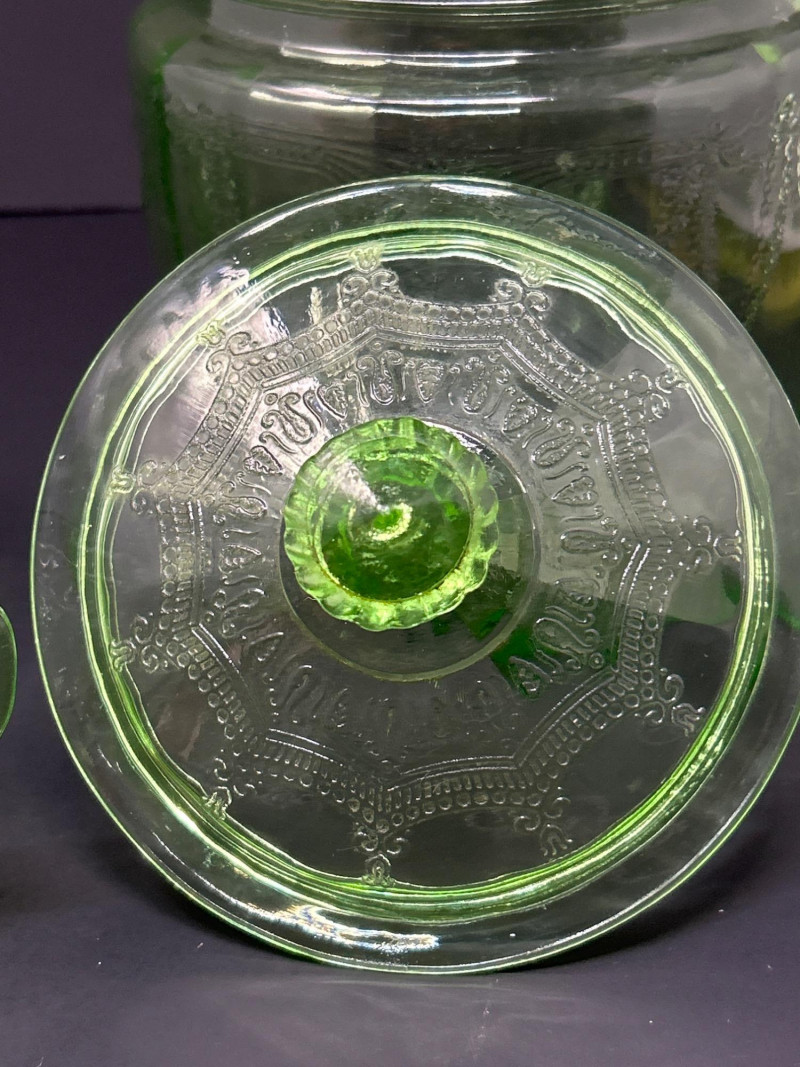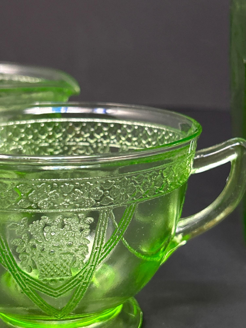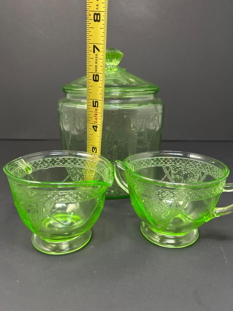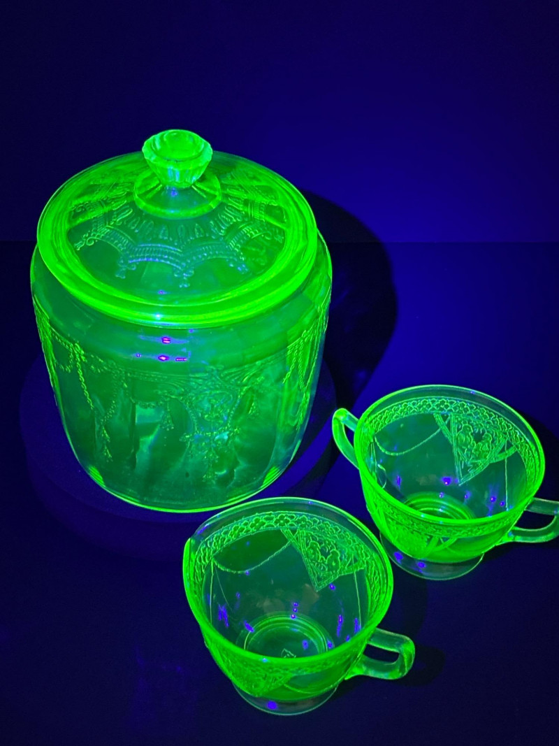 A luminous trio of Depression-era uranium glass featuring an Etched Cookie Biscuit Jar paired with a Federal Glass “Georgian Lovebirds” Creamer and Sugar Bowl. Each piece glows vividly under ultraviolet light, radiating the brilliant neon-green hue characteristic of authentic Vaseline glass. The jar showcases an elegant etched draped-garland motif with a domed lid and faceted finial, while the creamer and sugar display Federal’s classic Lovebirds pattern of stylized birds framed within garlanded triangles. Together, they capture the charm and craftsmanship of 1930s American pressed glass artistry. Etched Cookie Biscuit Jar Federal Glass Creamer & Sugar SetItem Details: