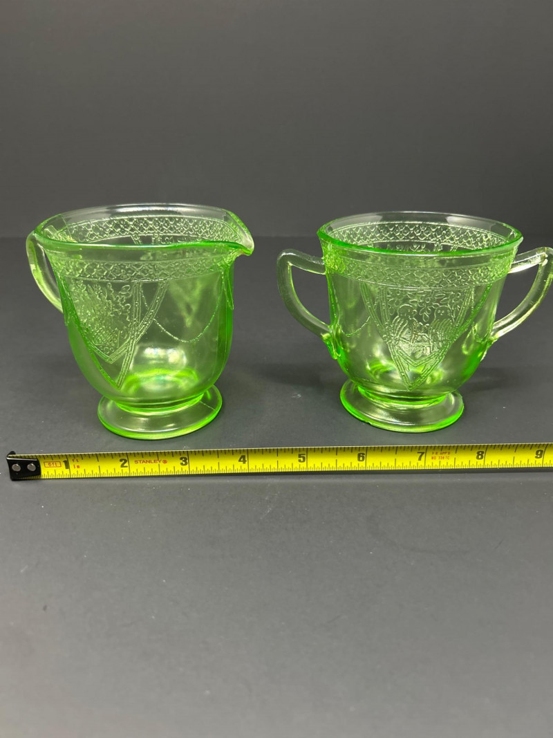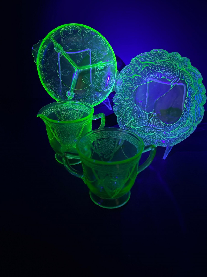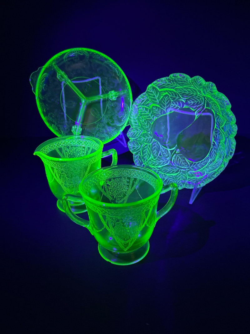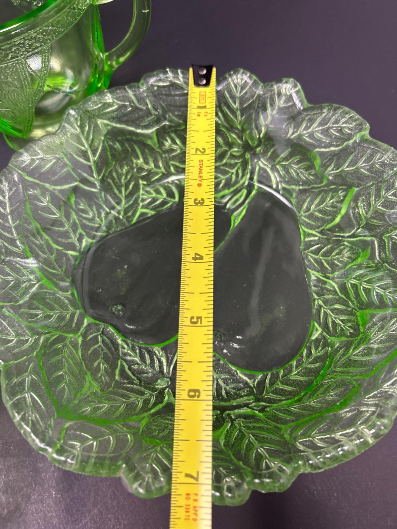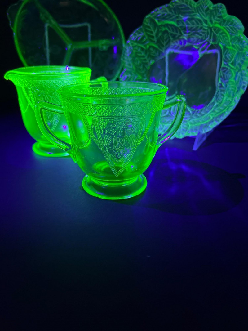 A glowing four-piece collection of Depression-era uranium glass, each piece emitting a brilliant neon-green fluorescence under UV light. This curated set brings together classic American pressed glass patterns from the 1930s: • Federal Glass “Lovebirds” Pattern – Creamer and sugar set featuring detailed etched songbirds framed by floral and geometric borders. A beloved motif from the Georgian period, these pieces are sought after for their delicate artistry and uniform glow. Item Details: Makers: Federal Glass Co. & Indiana Glass Co. (unmarked) Patterns: “Lovebirds” (Georgian), “Horseshoe,” and “Pear & Leaf” Date: Circa 1930s Material: Uranium glass (Vaseline glass) Color: Bright green, fluorescent under UV light Dimensions: Creamer: approx. 3¾″ H × 4¼″ W (spout to handle) Sugar: approx. 3¾″ H × 5¼″ W (handle to handle) Divided Dish: approx. 8½″ diameter Pear Plate: approx. 7″ diameter