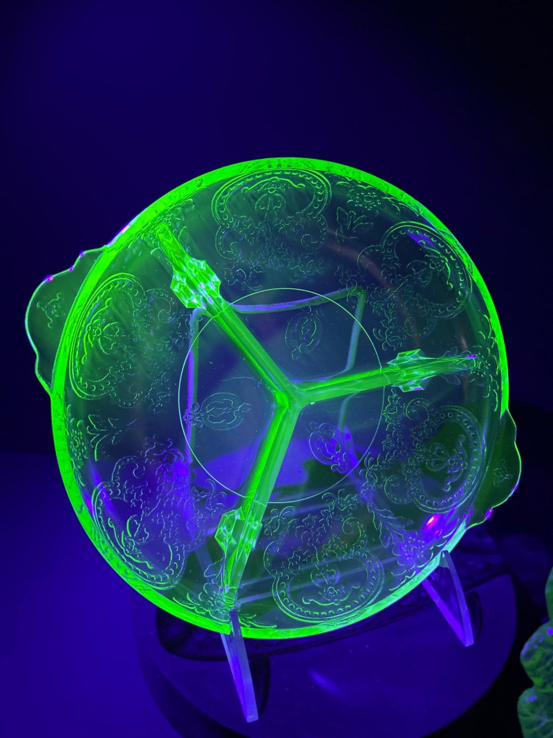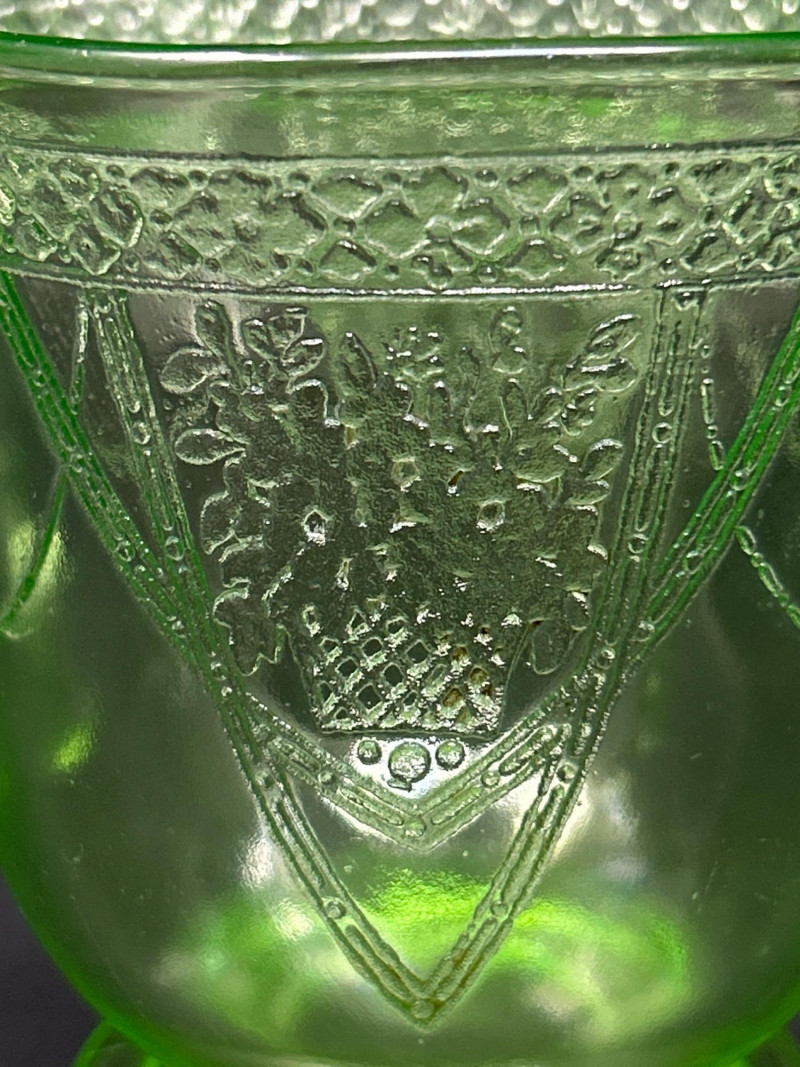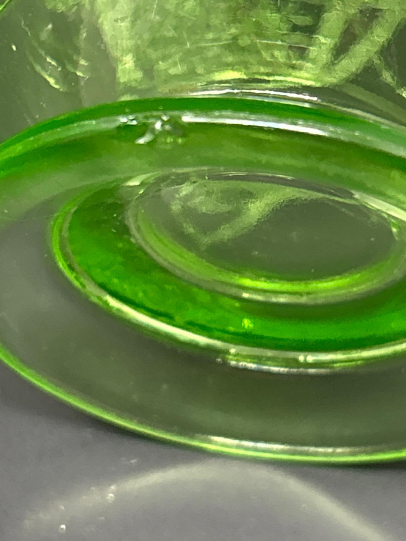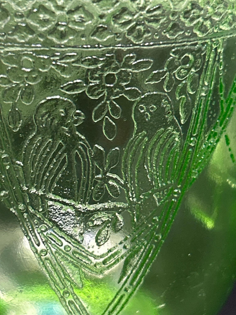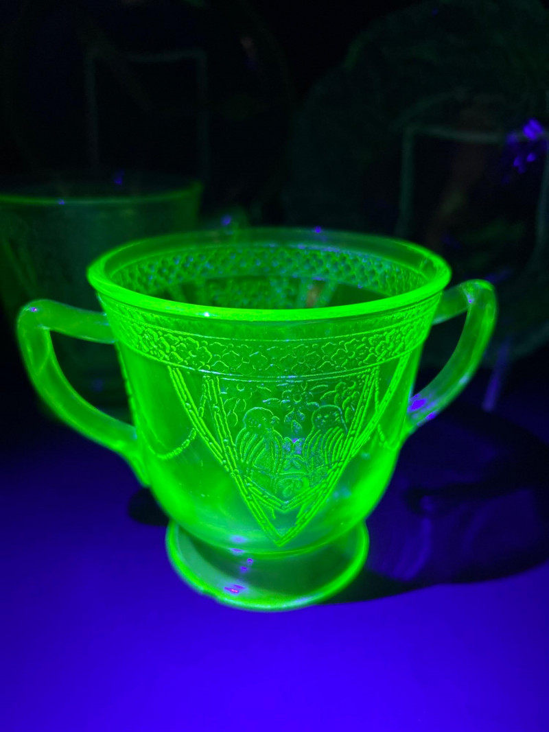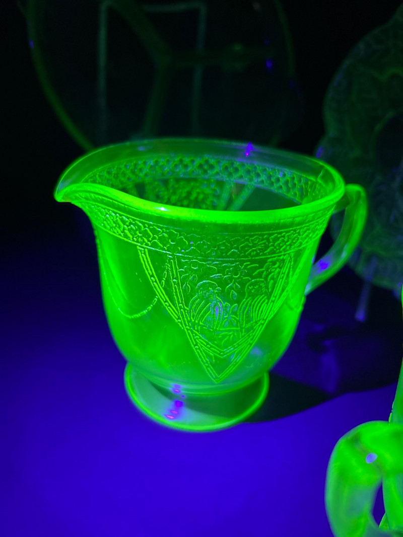 A glowing four-piece collection of Depression-era uranium glass, each piece emitting a brilliant neon-green fluorescence under UV light. This curated set brings together classic American pressed glass patterns from the 1930s: • Federal Glass “Lovebirds” Pattern – Creamer and sugar set featuring detailed etched songbirds framed by floral and geometric borders. A beloved motif from the Georgian period, these pieces are sought after for their delicate artistry and uniform glow. Item Details: Makers: Federal Glass Co. & Indiana Glass Co. (unmarked) Patterns: “Lovebirds” (Georgian), “Horseshoe,” and “Pear & Leaf” Date: Circa 1930s Material: Uranium glass (Vaseline glass) Color: Bright green, fluorescent under UV light Dimensions: Creamer: approx. 3¾″ H × 4¼″ W (spout to handle) Sugar: approx. 3¾″ H × 5¼″ W (handle to handle) Divided Dish: approx. 8½″ diameter Pear Plate: approx. 7″ diameter