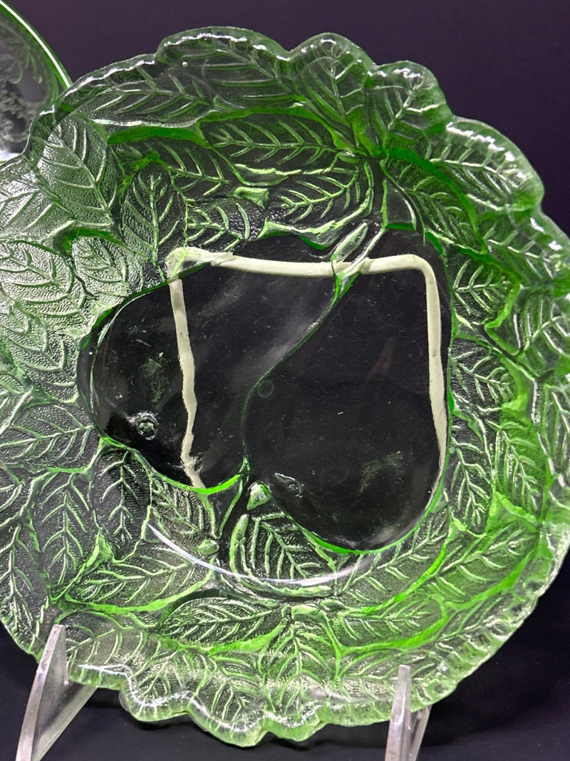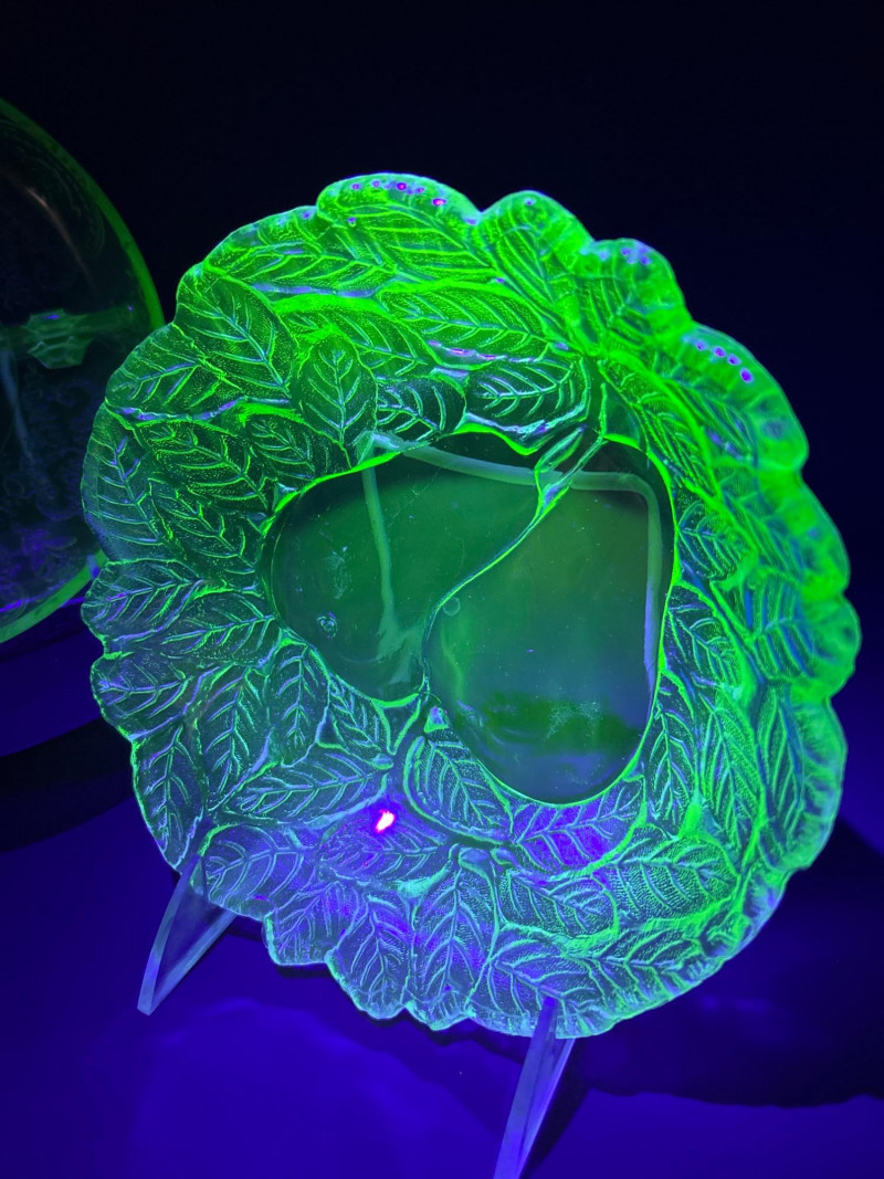• Pear & Leaf Plate – 7″ decorative dessert plate molded with raised twin pear motifs and scalloped leaf border, glowing vividly under UV light.