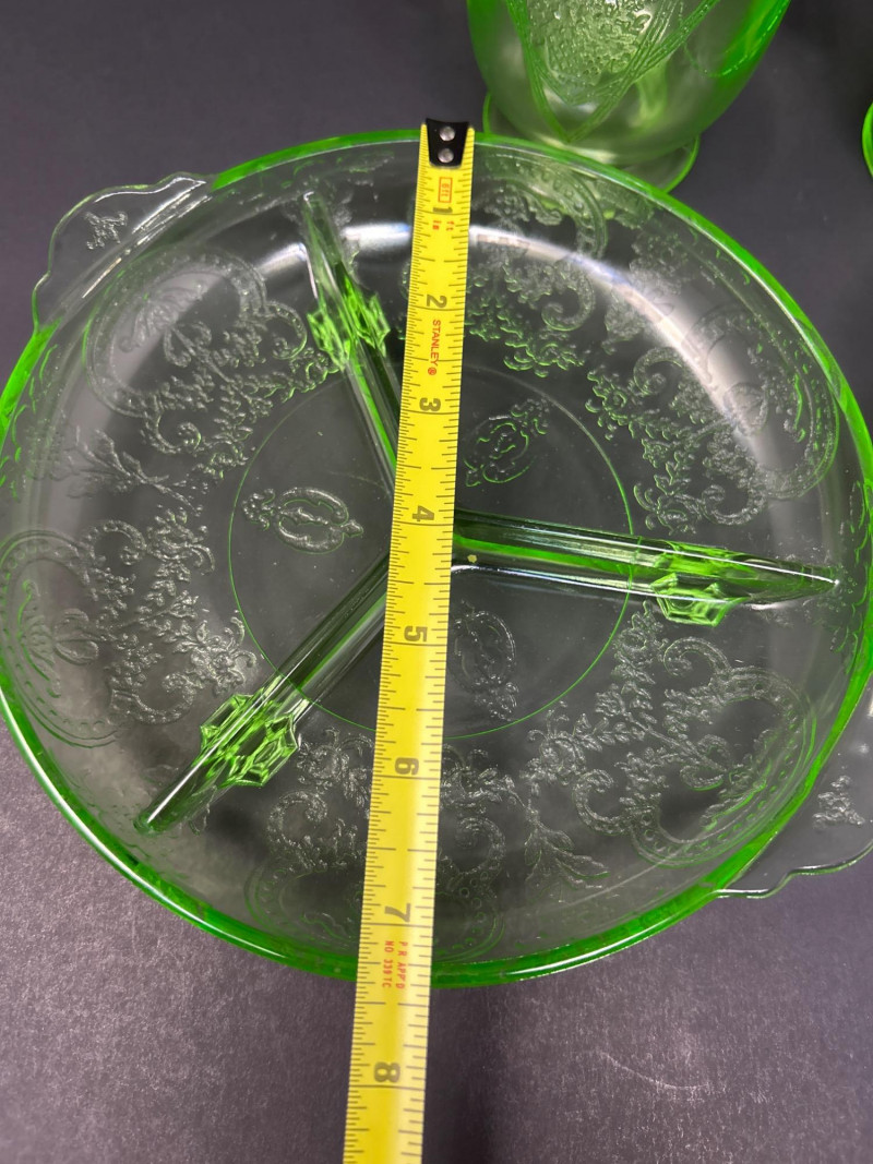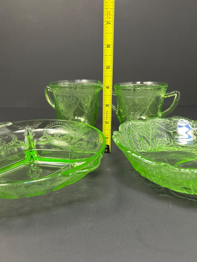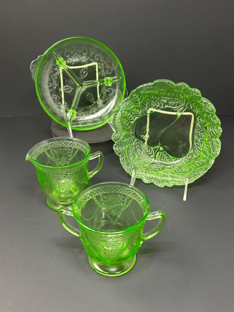 Lot # 23 - Four Uranium Depression Glass Pieces – Creamer, Sugar, Divided & Plate