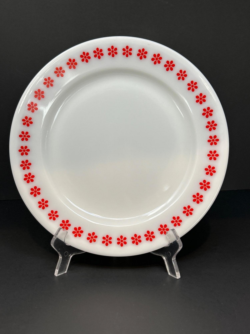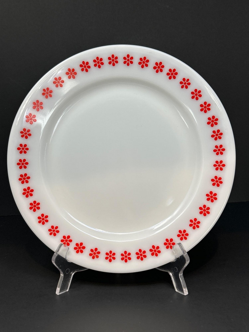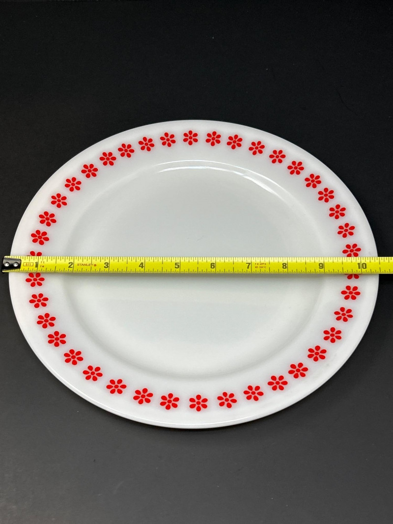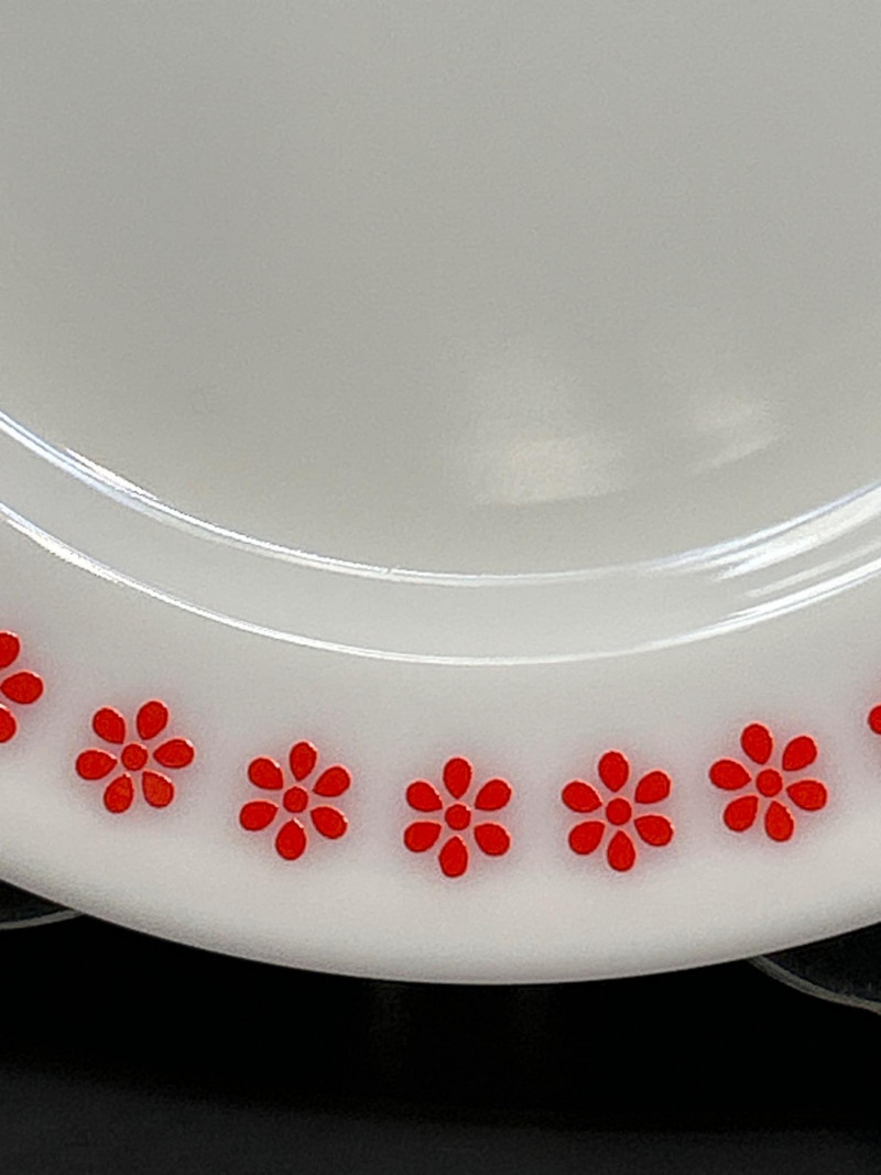 A rare vintage Pyrex Friendship Red Flower plate, showcasing a vivid ring of bright red six-petal blossoms circling the rim. Produced by Corning Glass Works in the early 1970s, this collectible from the Friendship series (No. 795)captures the joyful, welcoming spirit of Pyrex’s mid-century tableware. Crafted from durable opal (milk) glass, it pairs beautifully with other Friendship and Penn Dutch Pyrex pieces. Maker: Pyrex (by Corning Glass Works) Pattern: Friendship Red Flower – No. 795 Date: Circa 1971–1973 Material: Opal (milk) glass Color: White with red floral border Dimensions: Approx. 9¼″ diameter × 1″ high Mark: Embossed underside “PYREX Tableware by Corning – Made in USA – 795”Item Details: