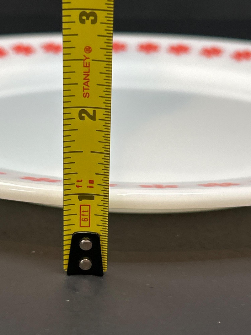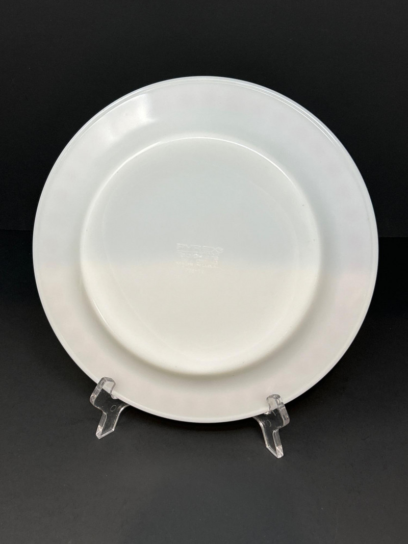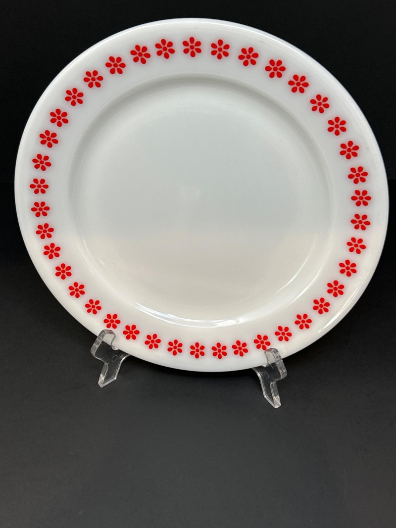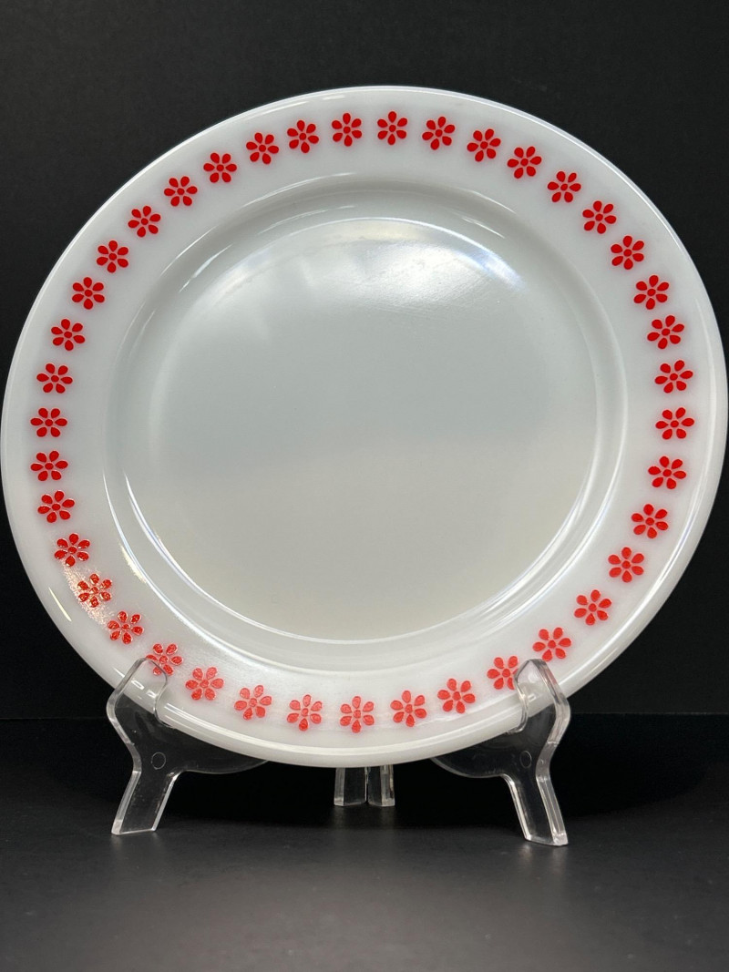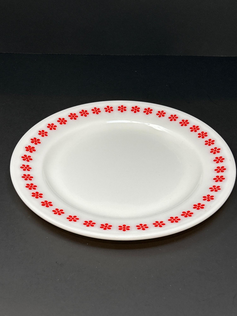 A rare vintage Pyrex Friendship Red Flower plate, showcasing a vivid ring of bright red six-petal blossoms circling the rim. Produced by Corning Glass Works in the early 1970s, this collectible from the Friendship series (No. 795)captures the joyful, welcoming spirit of Pyrex’s mid-century tableware. Crafted from durable opal (milk) glass, it pairs beautifully with other Friendship and Penn Dutch Pyrex pieces. Maker: Pyrex (by Corning Glass Works) Pattern: Friendship Red Flower – No. 795 Date: Circa 1971–1973 Material: Opal (milk) glass Color: White with red floral border Dimensions: Approx. 9¼″ diameter × 1″ high Mark: Embossed underside “PYREX Tableware by Corning – Made in USA – 795”Item Details: