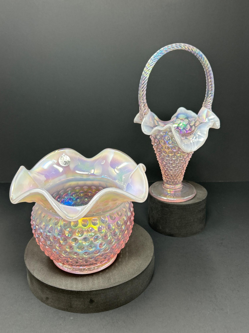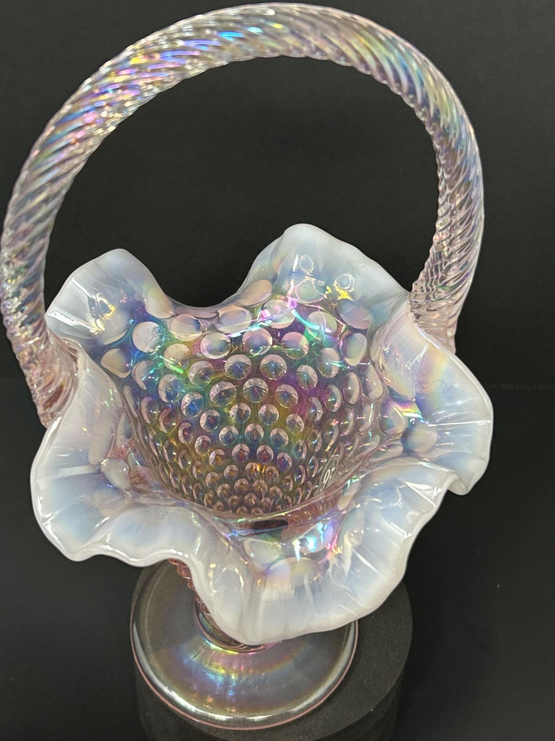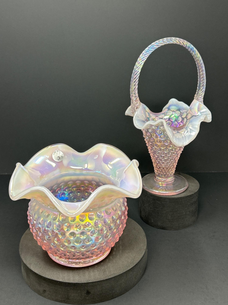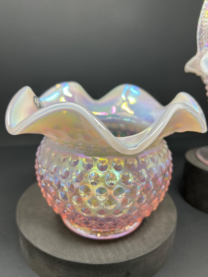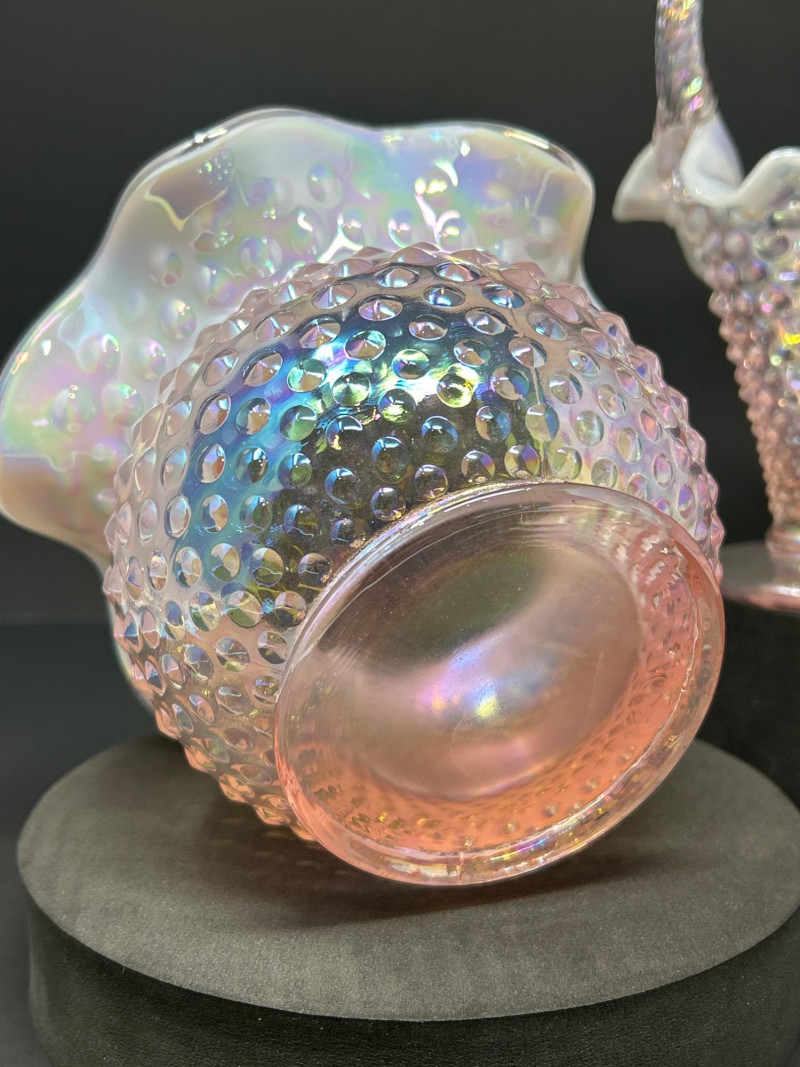 A beautiful Fenton Art Glass 95th Anniversary set (1905–2000) featuring a hobnail opalescent basket and matching ruffled bowl, both finished in a soft iridescent pink opal hue that radiates pastel tones of lavender, gold, and blue under light. The basket showcases Fenton’s signature twisted rope handle and wide, crimped rim, while the bowl features a deeply rounded body with a graceful, ruffled edge. Together they capture the timeless elegance and hand-finished artistry that define Fenton’s century-long tradition of American glassmaking excellence. Item Details: Maker: Fenton Art Glass Edition: 95th Anniversary (1905–2000) Pattern: Hobnail Color: Iridescent Pink Opalescent Material: Pressed and hand-finished art glass Mark: Embossed Fenton logo on base and silver foil “95th Anniversary” label Date: Circa 2000 Dimensions: Basket: approx. 10″ tall × 5″ wide Bowl: approx. 5″ tall × 7″ wide Design Features: Distinctive hobnail texture throughout Iridescent luster with pastel sheen Crimped and ruffled rims Twisted glass handle on basket
