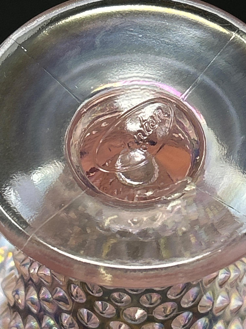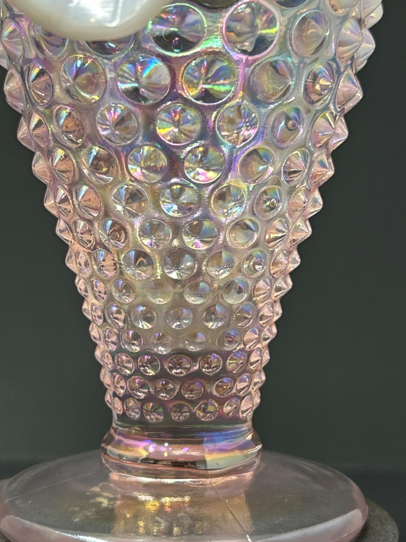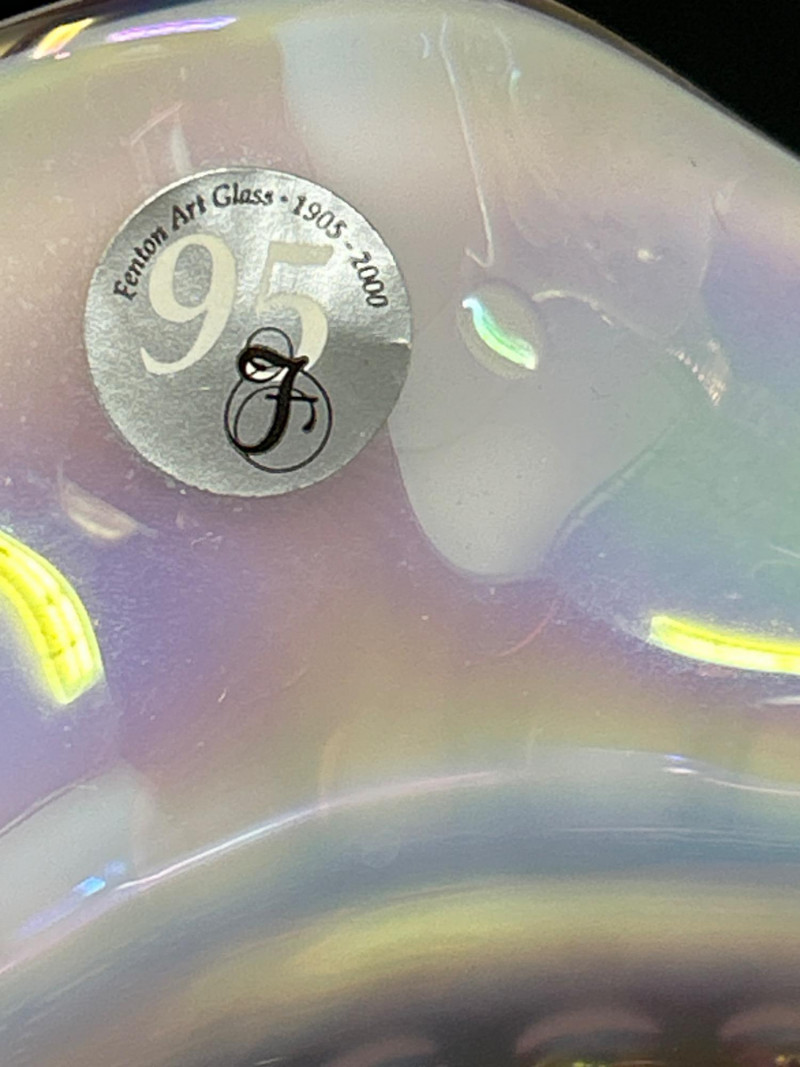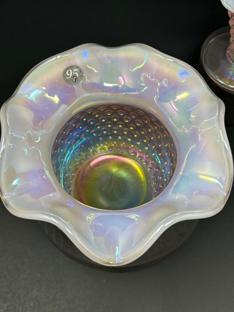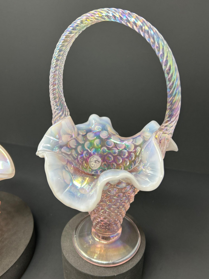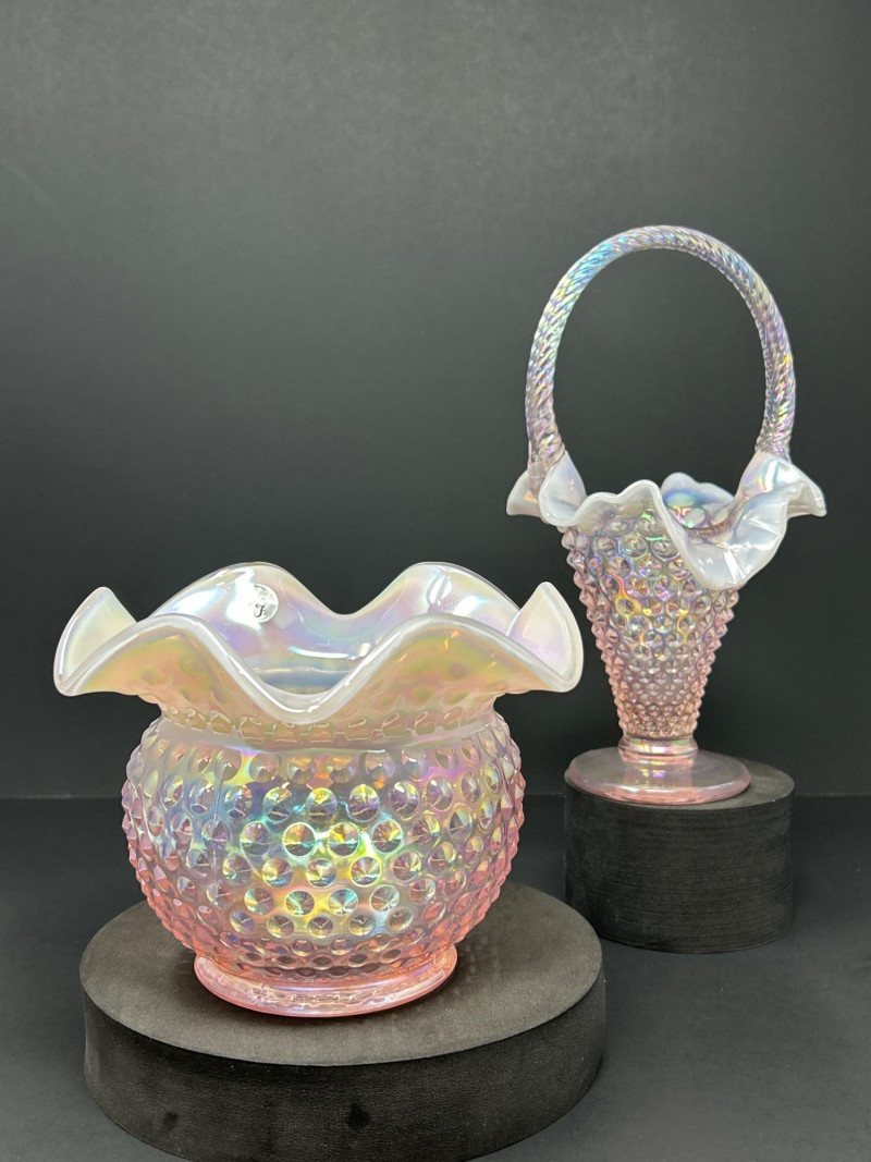 A beautiful Fenton Art Glass 95th Anniversary set (1905–2000) featuring a hobnail opalescent basket and matching ruffled bowl, both finished in a soft iridescent pink opal hue that radiates pastel tones of lavender, gold, and blue under light. The basket showcases Fenton’s signature twisted rope handle and wide, crimped rim, while the bowl features a deeply rounded body with a graceful, ruffled edge. Together they capture the timeless elegance and hand-finished artistry that define Fenton’s century-long tradition of American glassmaking excellence. Item Details: Maker: Fenton Art Glass Edition: 95th Anniversary (1905–2000) Pattern: Hobnail Color: Iridescent Pink Opalescent Material: Pressed and hand-finished art glass Mark: Embossed Fenton logo on base and silver foil “95th Anniversary” label Date: Circa 2000 Dimensions: Basket: approx. 10″ tall × 5″ wide Bowl: approx. 5″ tall × 7″ wide Design Features: Distinctive hobnail texture throughout Iridescent luster with pastel sheen Crimped and ruffled rims Twisted glass handle on basket