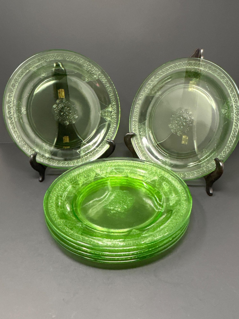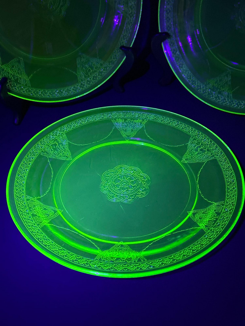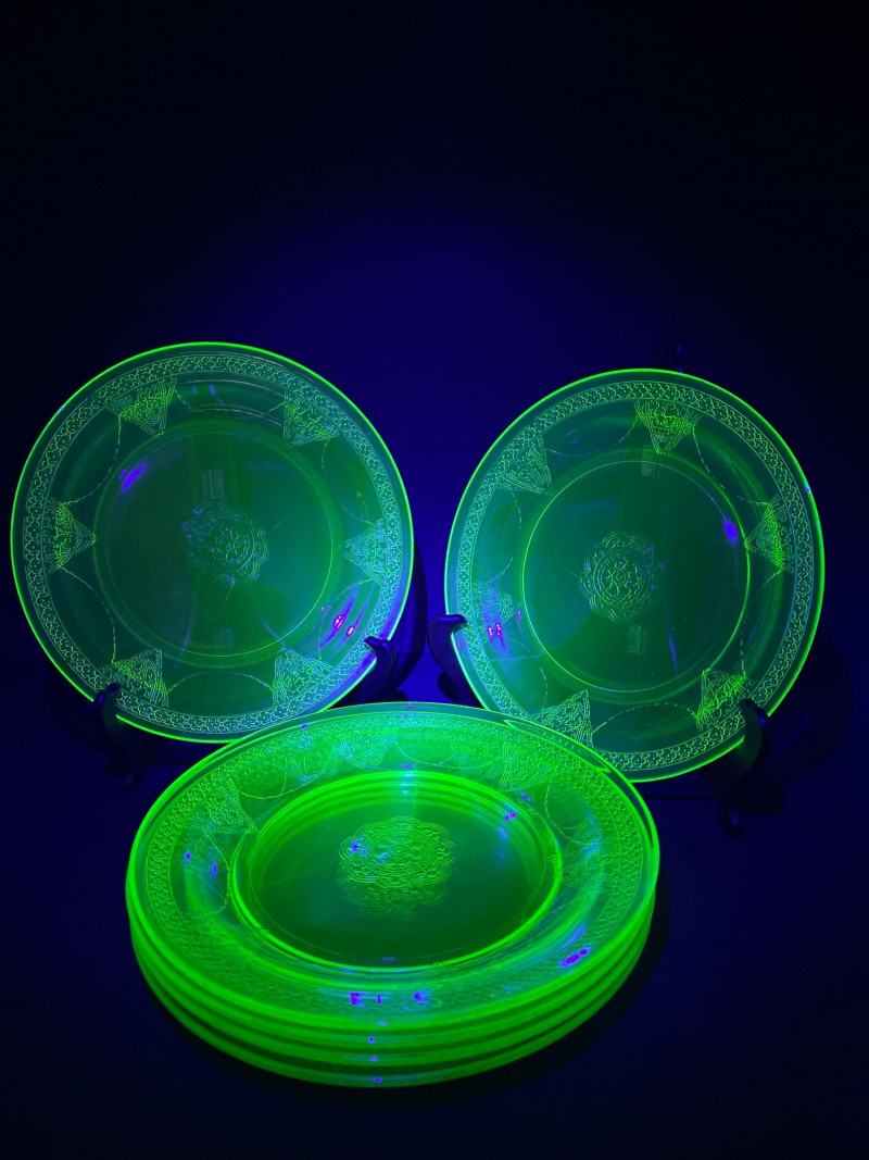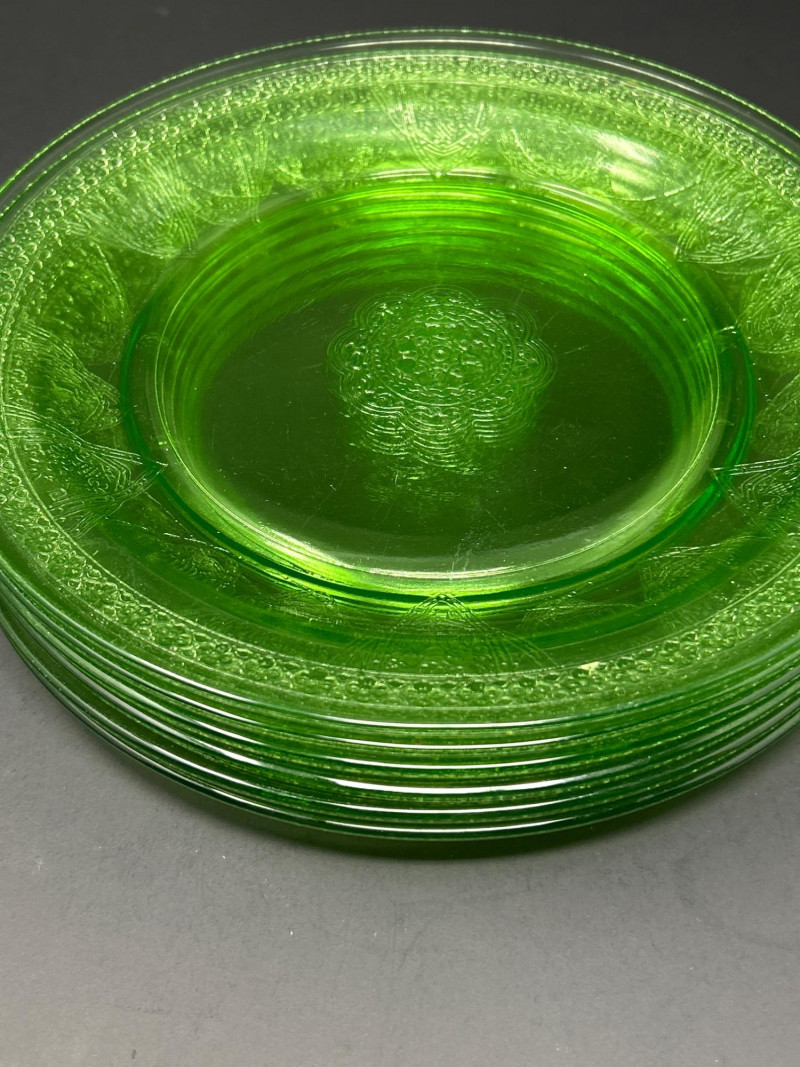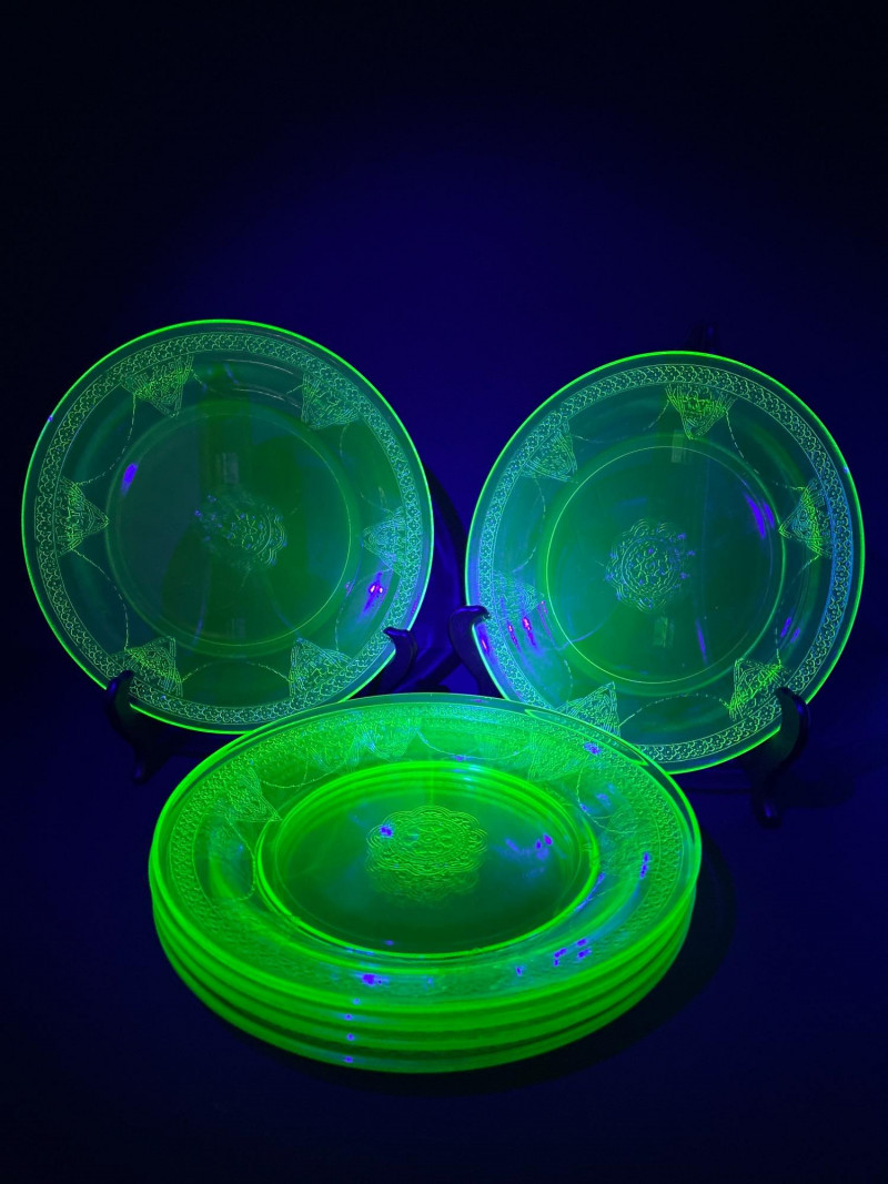 A glowing collection of six uranium green Depression glass dinner plates in the “Georgian Lovebirds”–style pattern, attributed to the 1930s Federal Glass Company era. Each plate features the distinctive etched lace triangles and central floral medallion motif, displaying a vivid neon green glow under UV light. Beautifully translucent with fine Art Deco detailing, these plates embody the craftsmanship and charm of Depression-era glassmaking. Item Details: Quantity: 6 dinner plates Maker/Attribution: Federal Glass (Georgian Lovebirds–style) Pattern: Etched floral medallion with geometric lace triangle border Material: Uranium (Vaseline) glass Color: Bright fluorescent green Date: Circa 1930s Diameter (each): approx. 9.5″ Design: Shallow form with smooth rim, ornate etched motifs, and strong UV luminescence