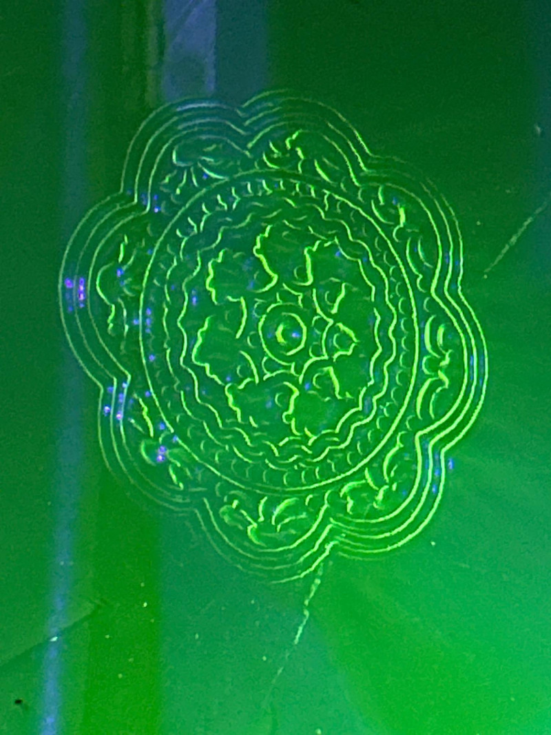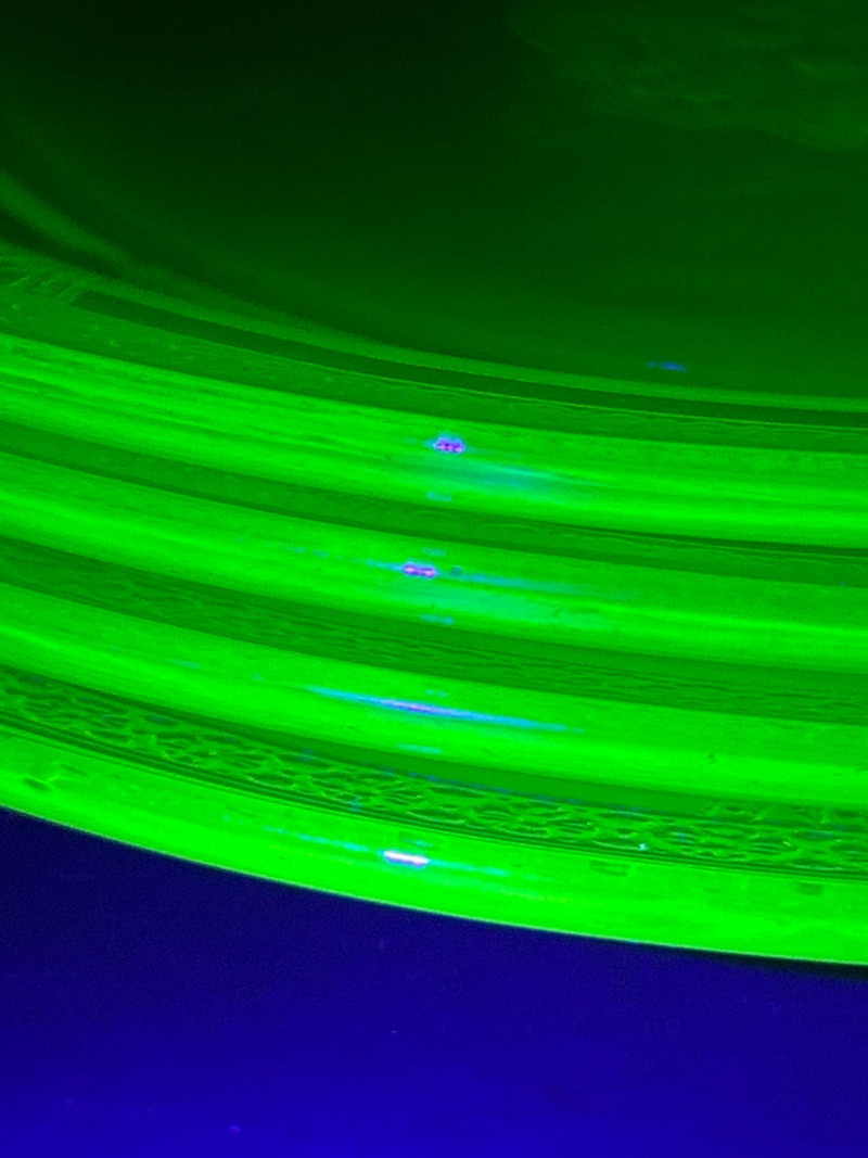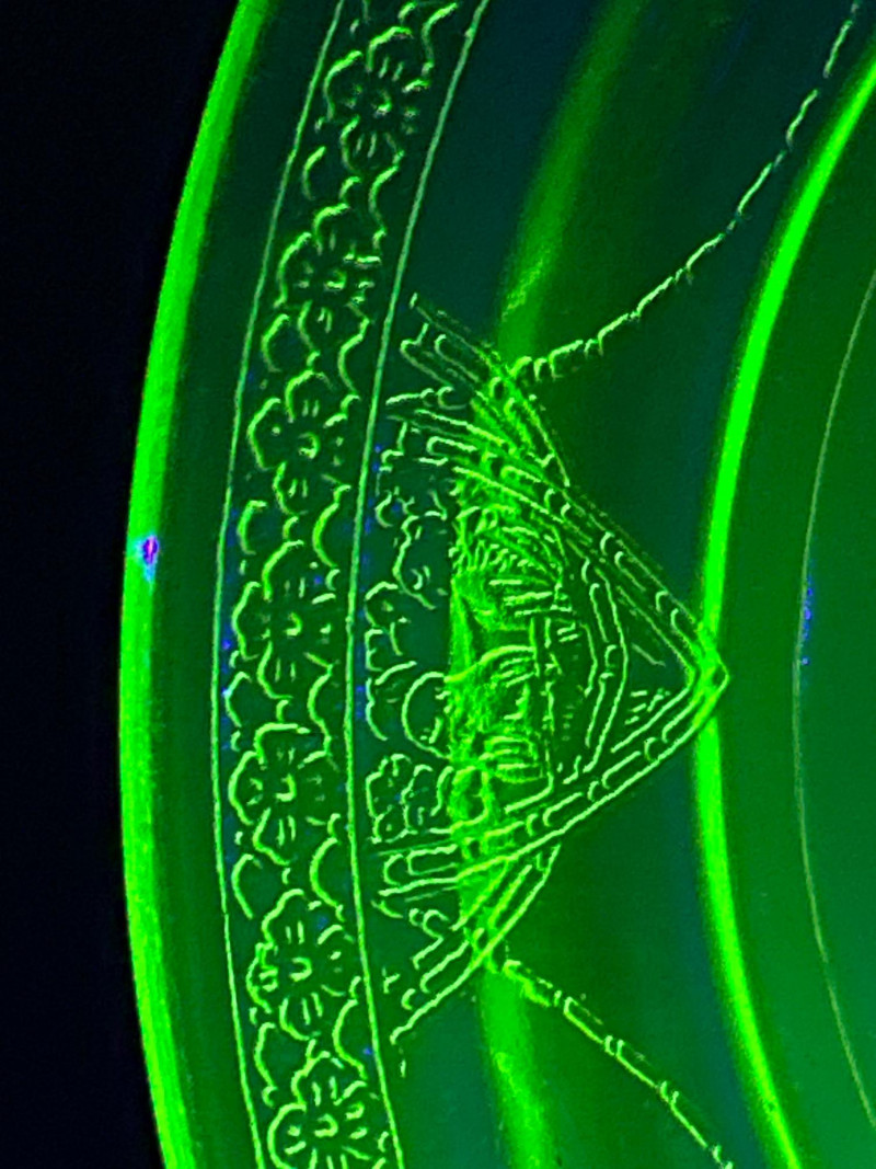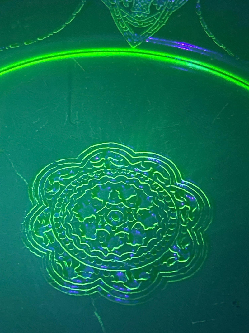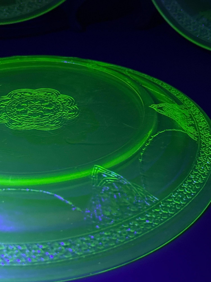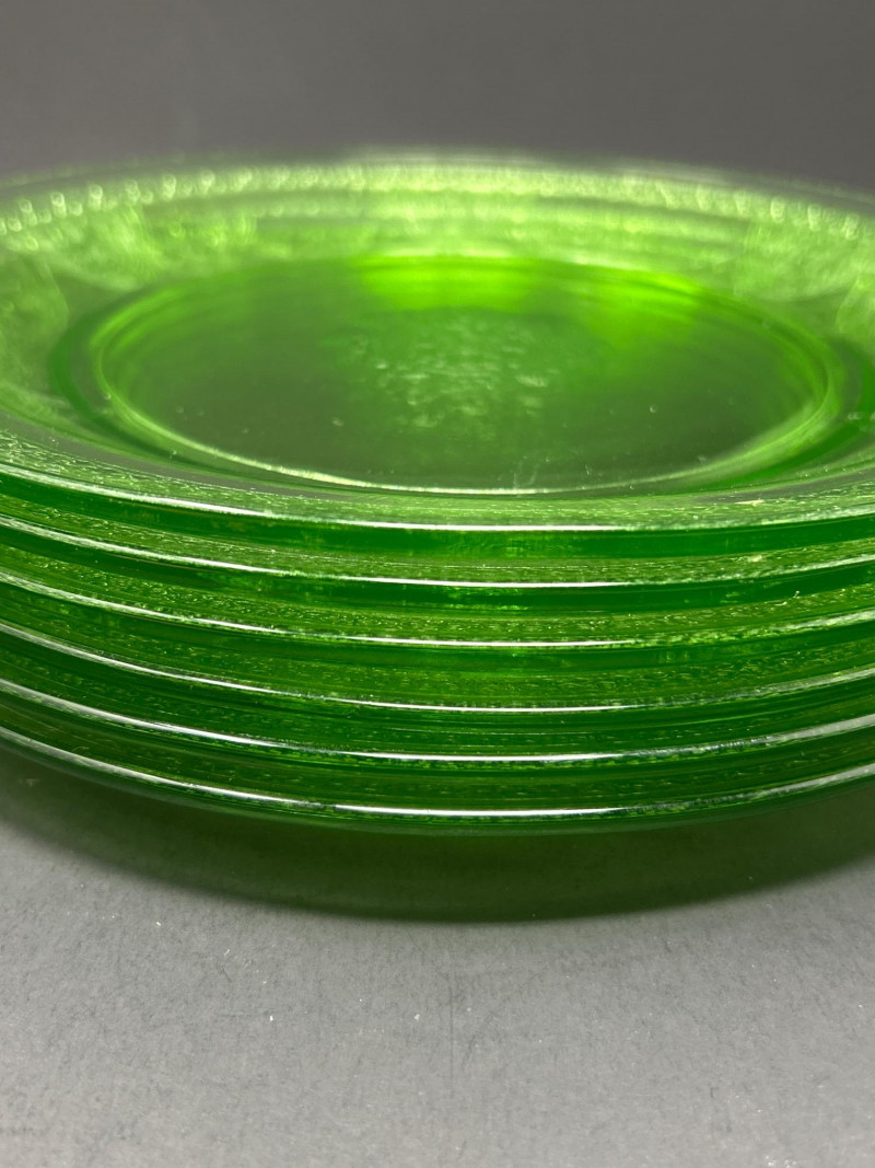 A glowing collection of six uranium green Depression glass dinner plates in the “Georgian Lovebirds”–style pattern, attributed to the 1930s Federal Glass Company era. Each plate features the distinctive etched lace triangles and central floral medallion motif, displaying a vivid neon green glow under UV light. Beautifully translucent with fine Art Deco detailing, these plates embody the craftsmanship and charm of Depression-era glassmaking. Item Details: Quantity: 6 dinner plates Maker/Attribution: Federal Glass (Georgian Lovebirds–style) Pattern: Etched floral medallion with geometric lace triangle border Material: Uranium (Vaseline) glass Color: Bright fluorescent green Date: Circa 1930s Diameter (each): approx. 9.5″ Design: Shallow form with smooth rim, ornate etched motifs, and strong UV luminescence