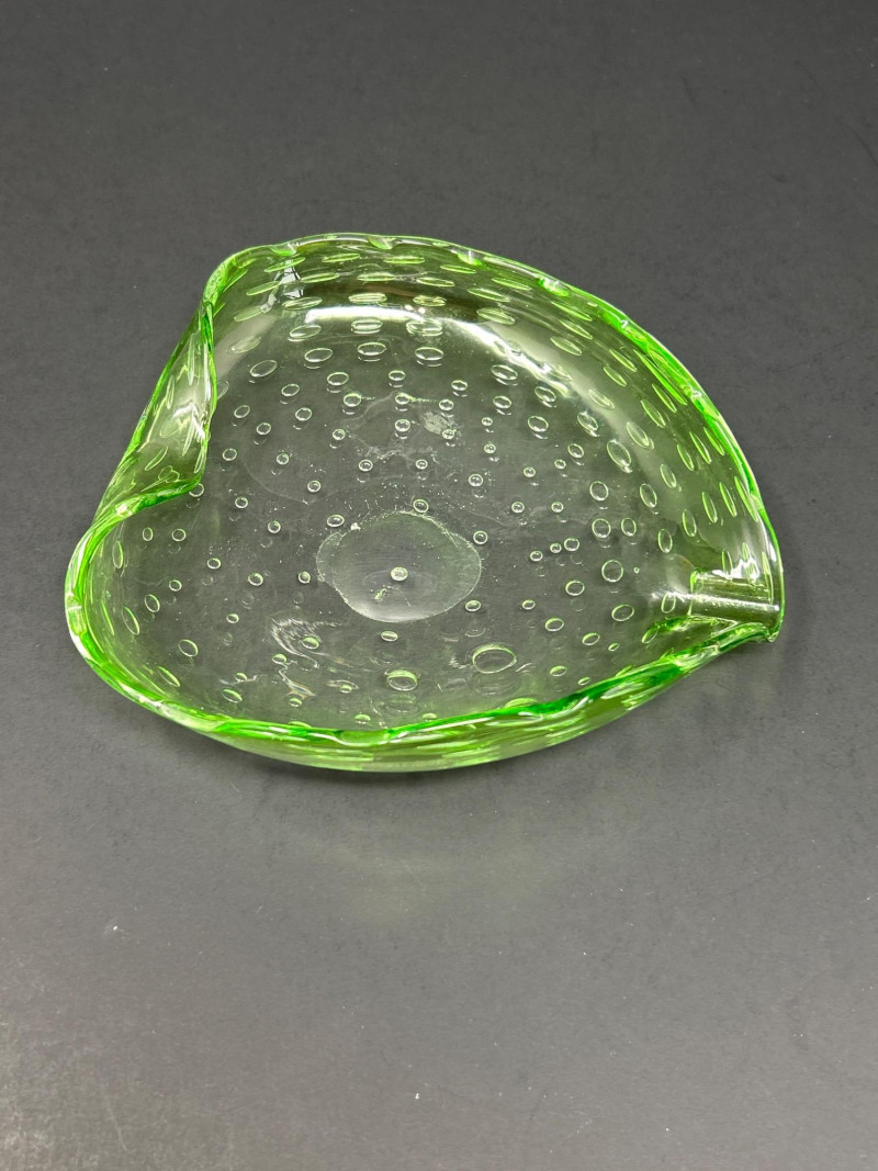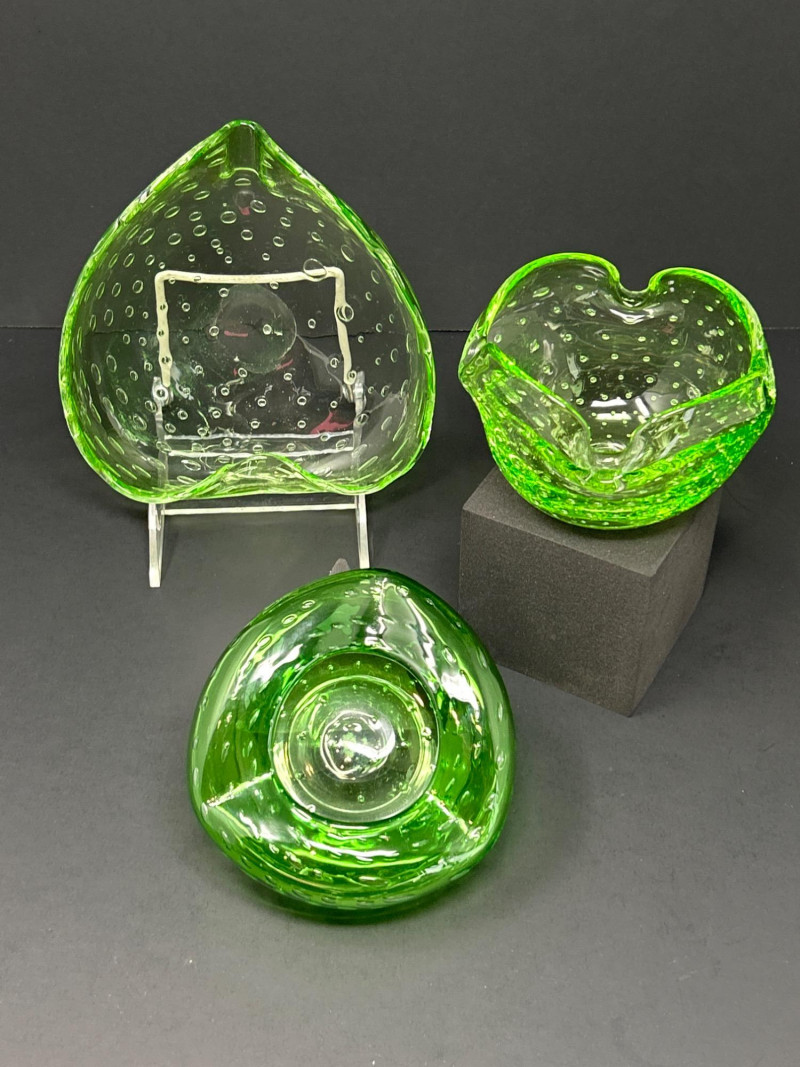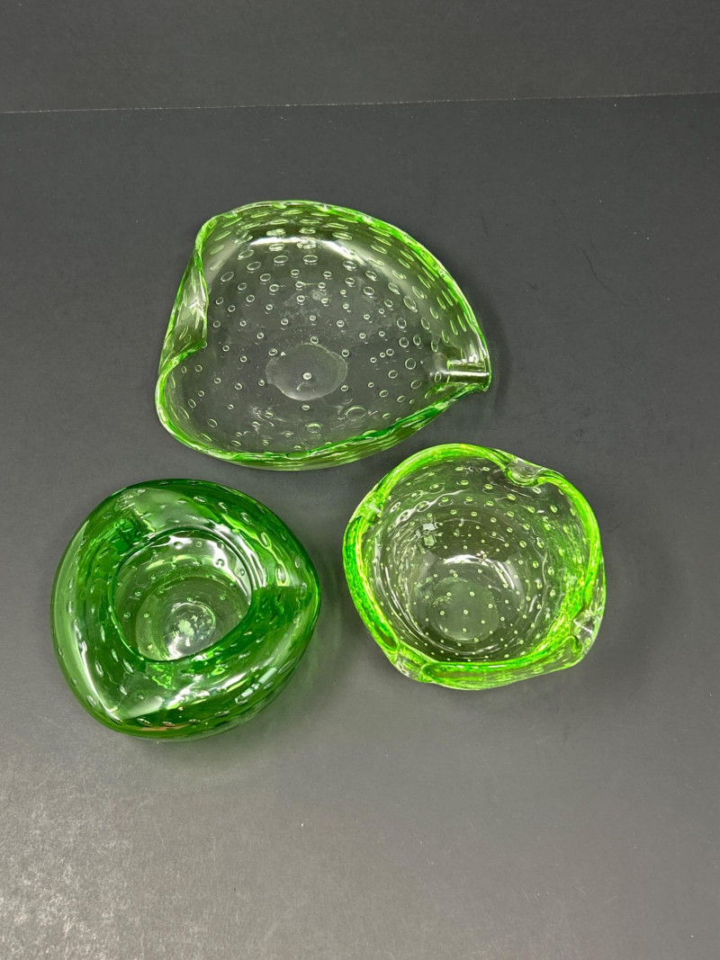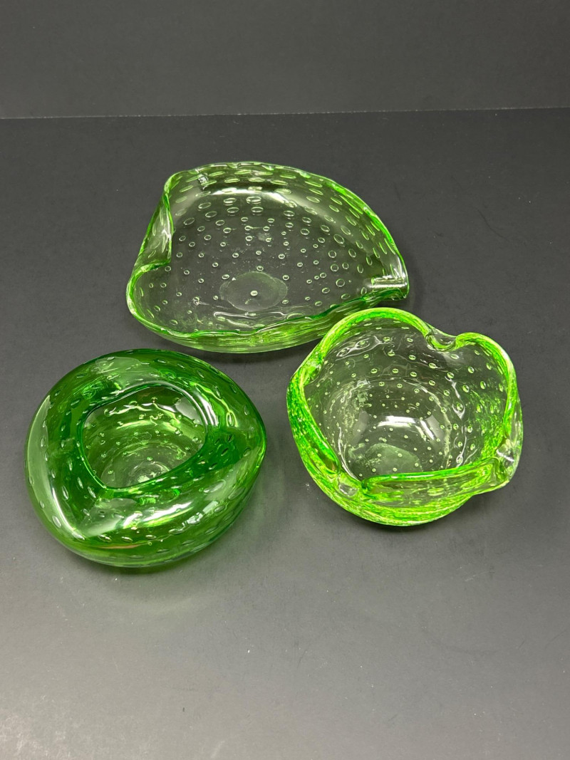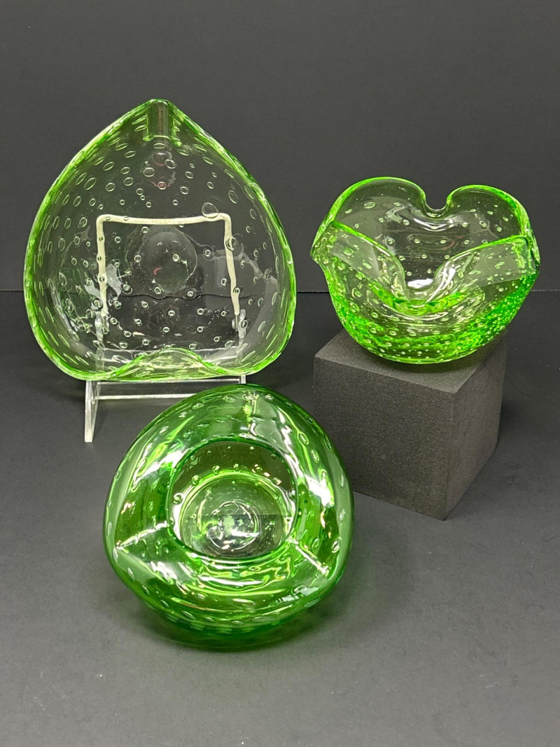 A luminous set of three hand-blown uranium green art glass bowls / ashtrays, glowing brilliantly under UV light. Each features the Murano-style bullicante (controlled bubble) technique, where air bubbles are artfully suspended within the glass for a radiant, dimensional effect. The group includes a leaf-shaped form, a softly folded freeform piece, and a rounded bowl with sculptural curves—each a fine example of mid-century Murano-style craftsmanship. Perfect for display, use as trinket dishes, or as glowing conversation pieces. Lot Details: Quantity: 3 pieces Design: Controlled bubble (bullicante) technique Style: Murano-style, mid-century art glass Color: Uranium green (UV reactive) Material: Hand-blown glass Dimensions (approx.):