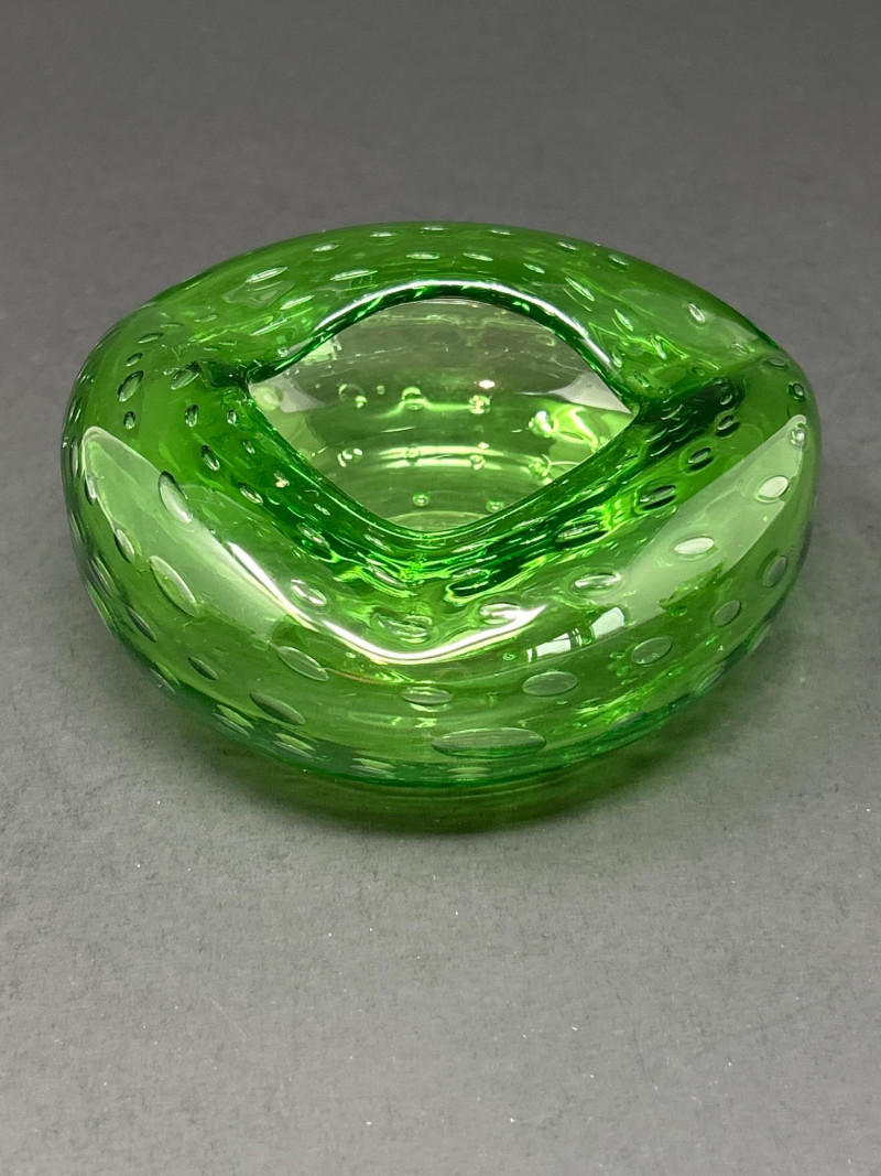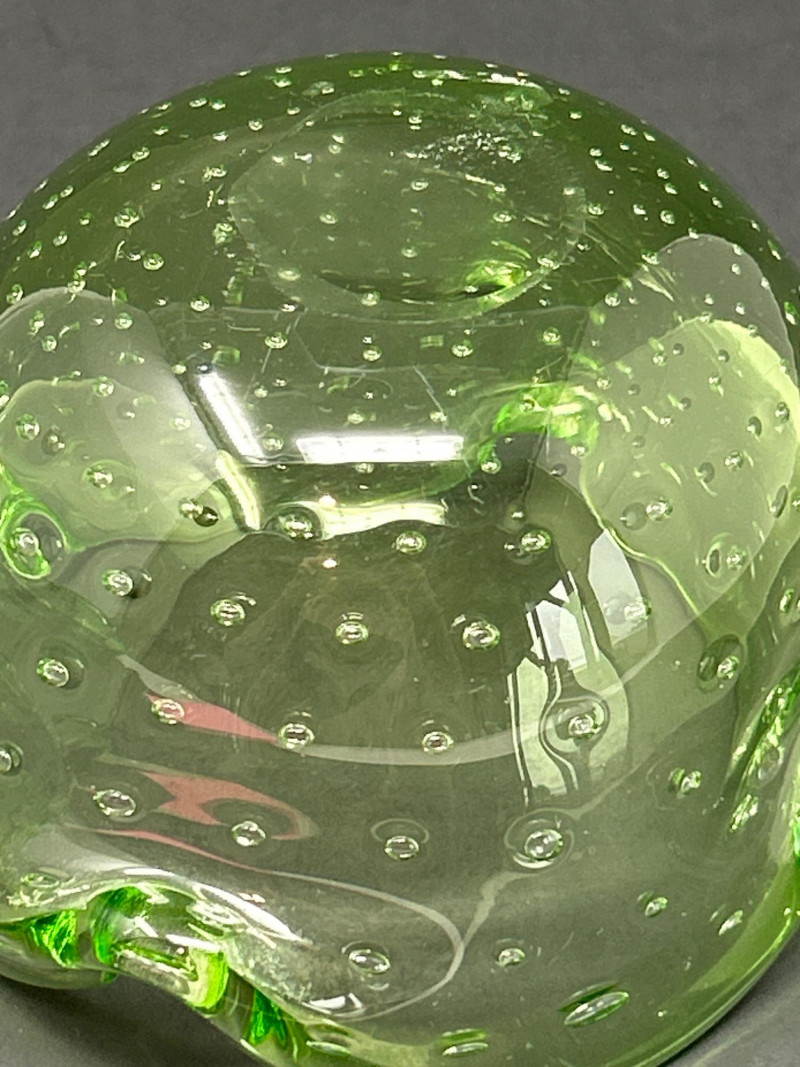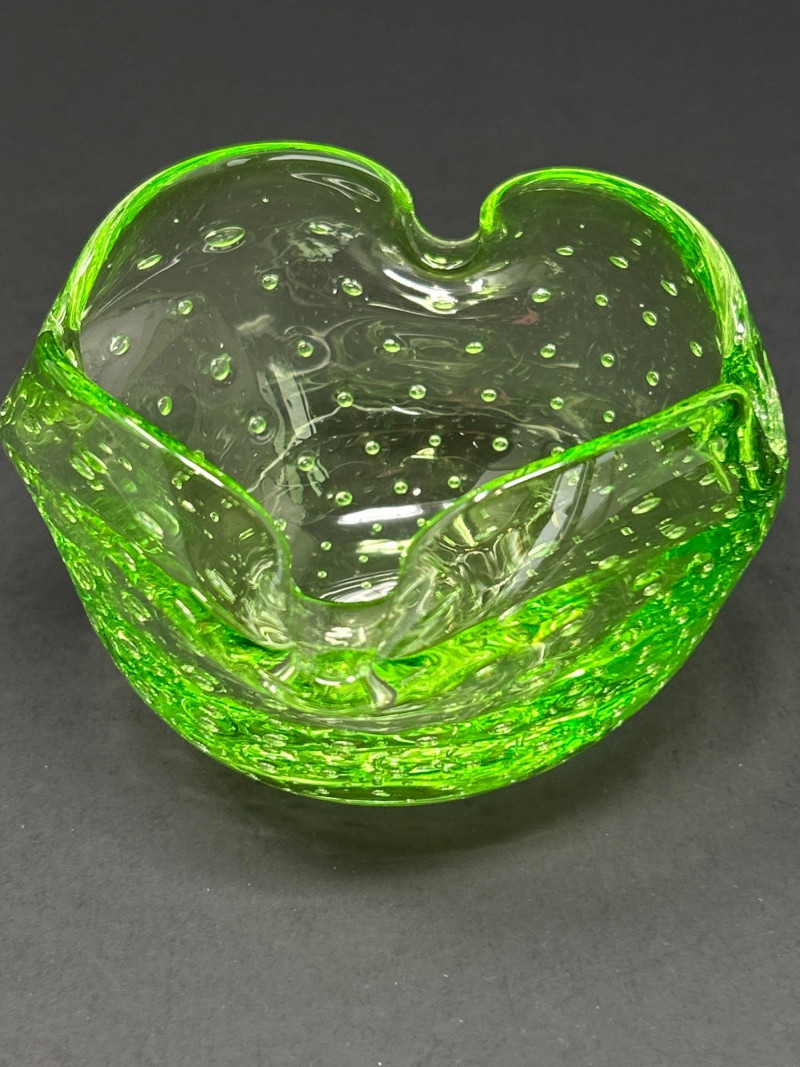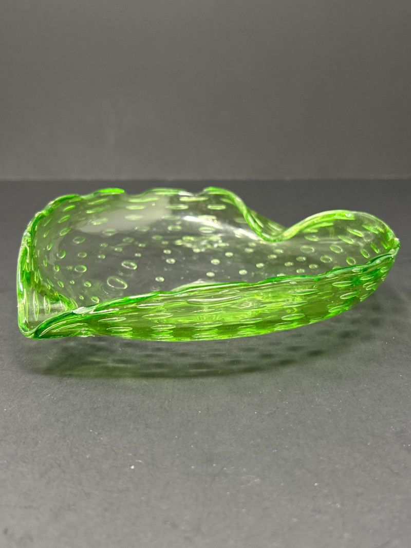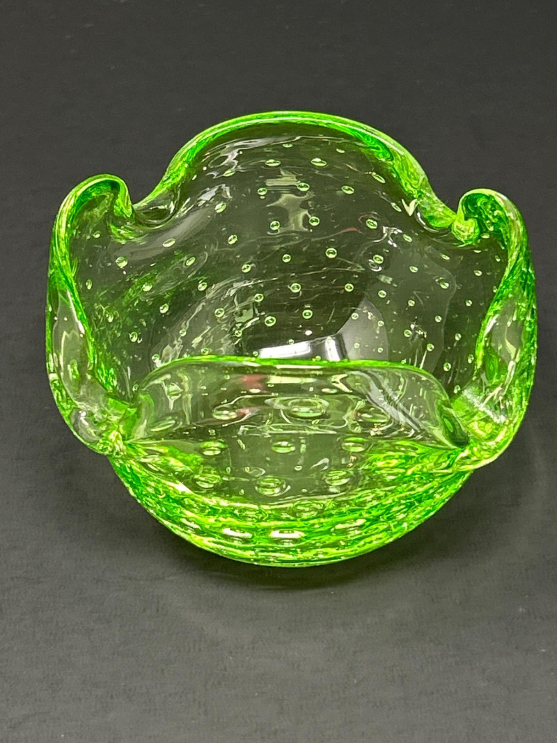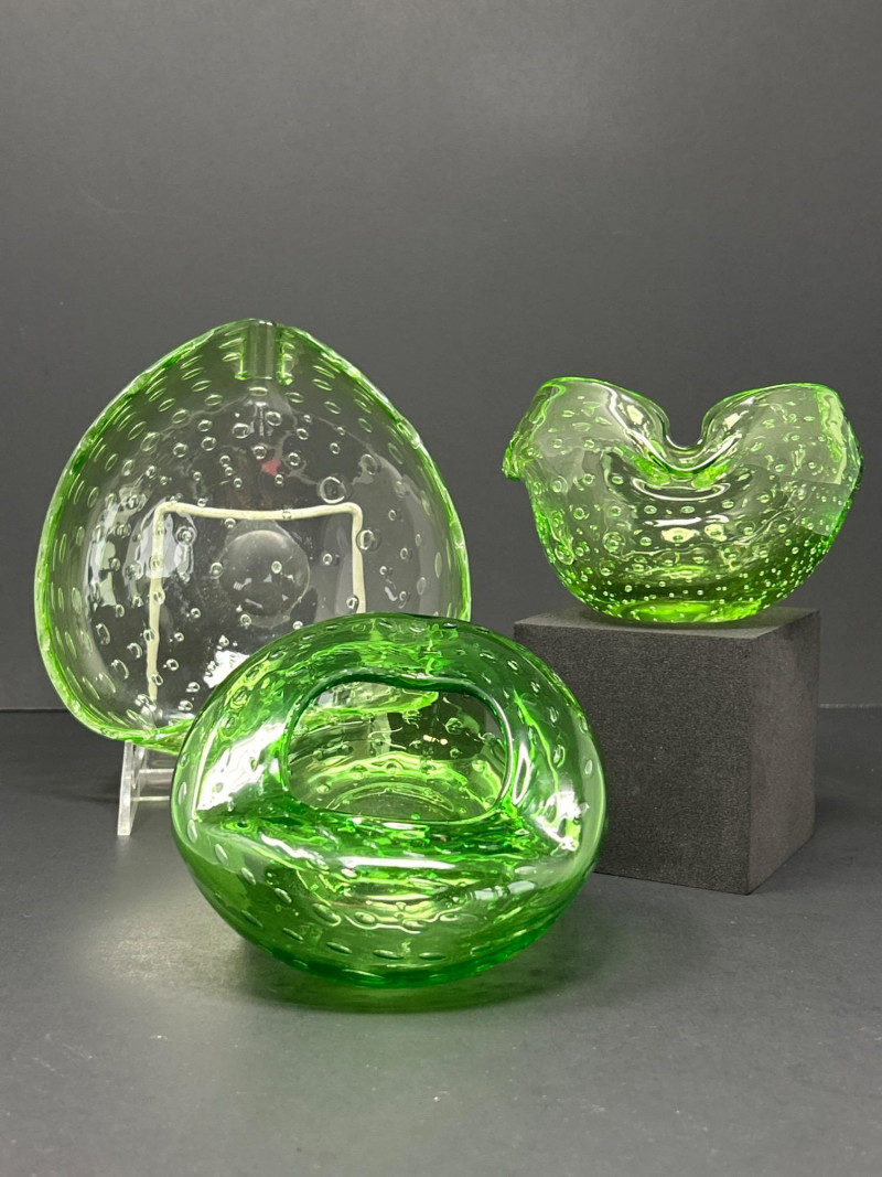 A luminous set of three hand-blown uranium green art glass bowls / ashtrays, glowing brilliantly under UV light. Each features the Murano-style bullicante (controlled bubble) technique, where air bubbles are artfully suspended within the glass for a radiant, dimensional effect. The group includes a leaf-shaped form, a softly folded freeform piece, and a rounded bowl with sculptural curves—each a fine example of mid-century Murano-style craftsmanship. Perfect for display, use as trinket dishes, or as glowing conversation pieces. Lot Details: Quantity: 3 pieces Design: Controlled bubble (bullicante) technique Style: Murano-style, mid-century art glass Color: Uranium green (UV reactive) Material: Hand-blown glass Dimensions (approx.):