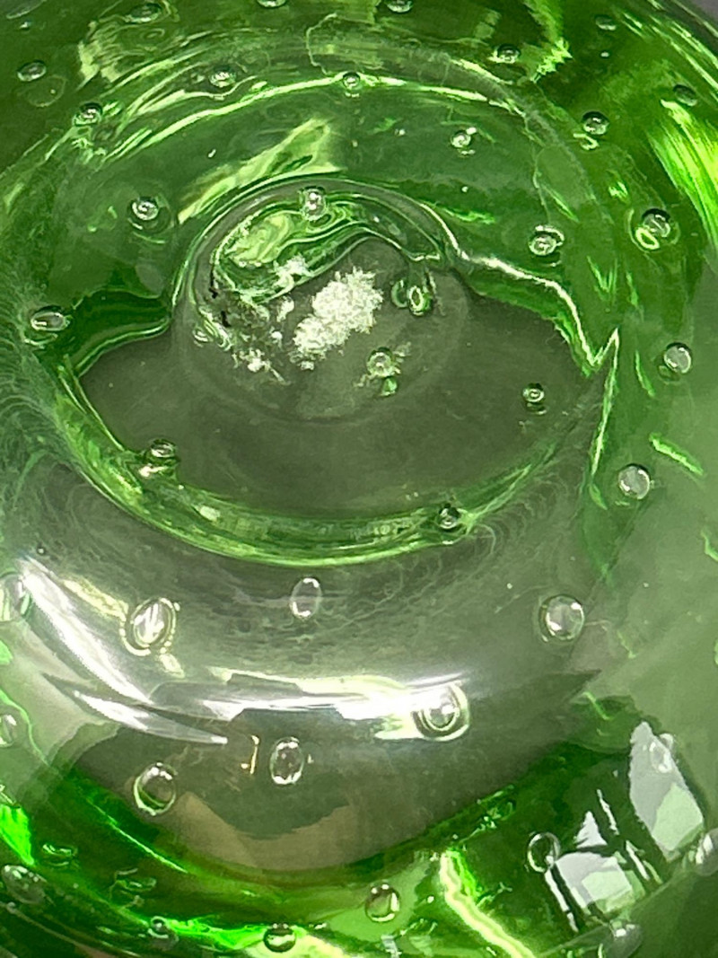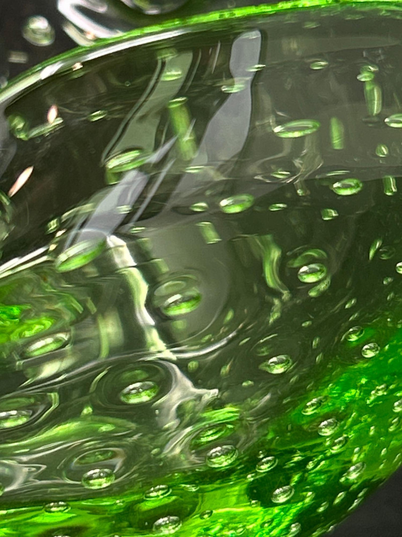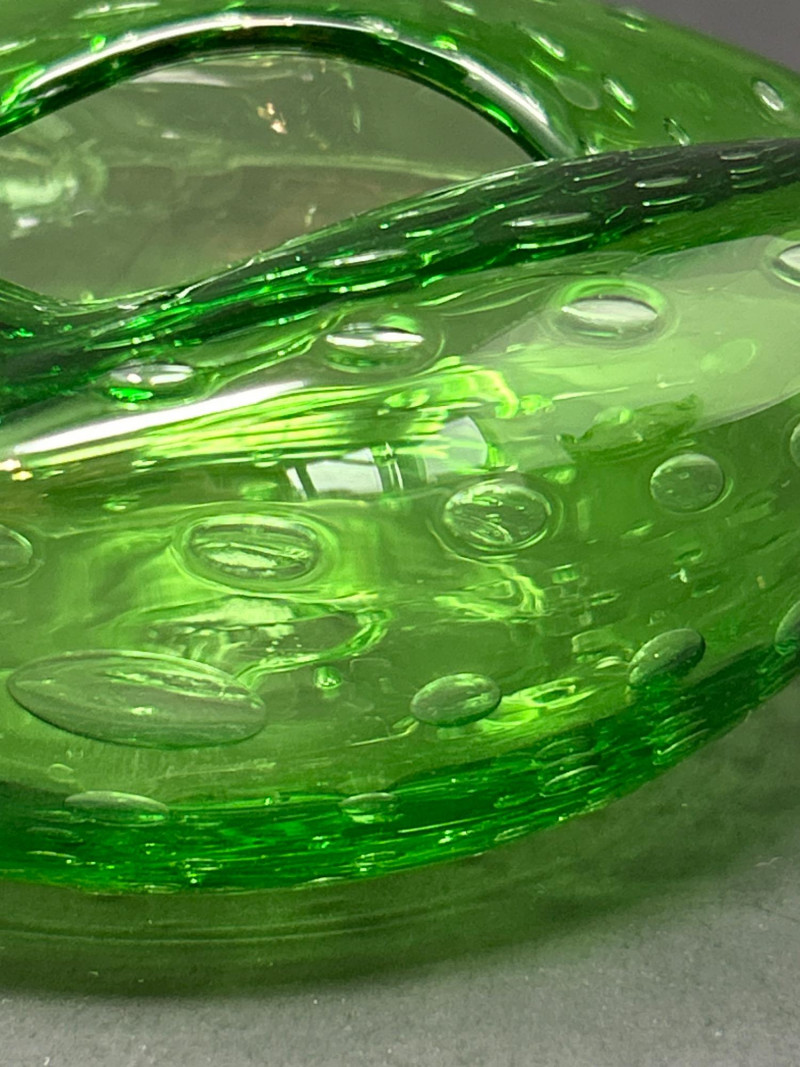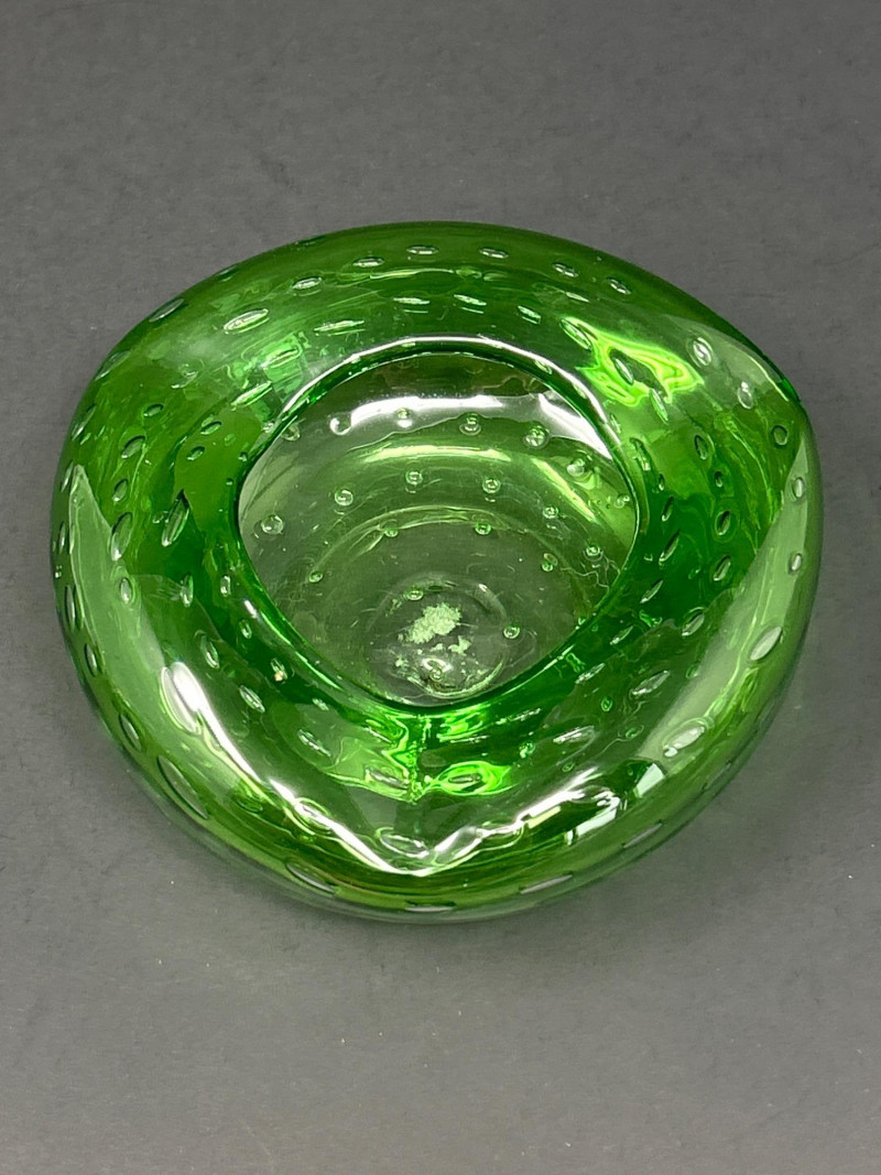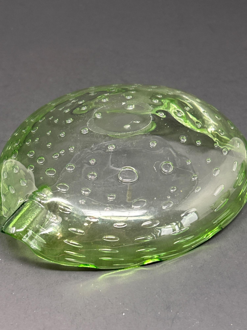 A luminous set of three hand-blown uranium green art glass bowls / ashtrays, glowing brilliantly under UV light. Each features the Murano-style bullicante (controlled bubble) technique, where air bubbles are artfully suspended within the glass for a radiant, dimensional effect. The group includes a leaf-shaped form, a softly folded freeform piece, and a rounded bowl with sculptural curves—each a fine example of mid-century Murano-style craftsmanship. Perfect for display, use as trinket dishes, or as glowing conversation pieces. Lot Details: Quantity: 3 pieces Design: Controlled bubble (bullicante) technique Style: Murano-style, mid-century art glass Color: Uranium green (UV reactive) Material: Hand-blown glass Dimensions (approx.):