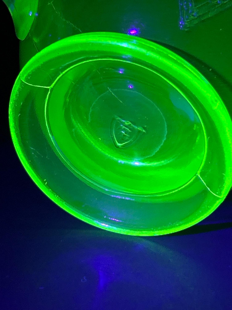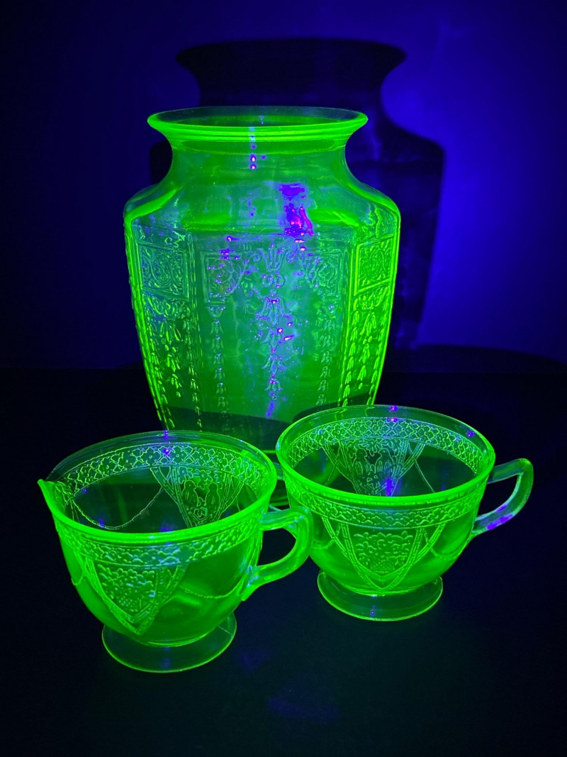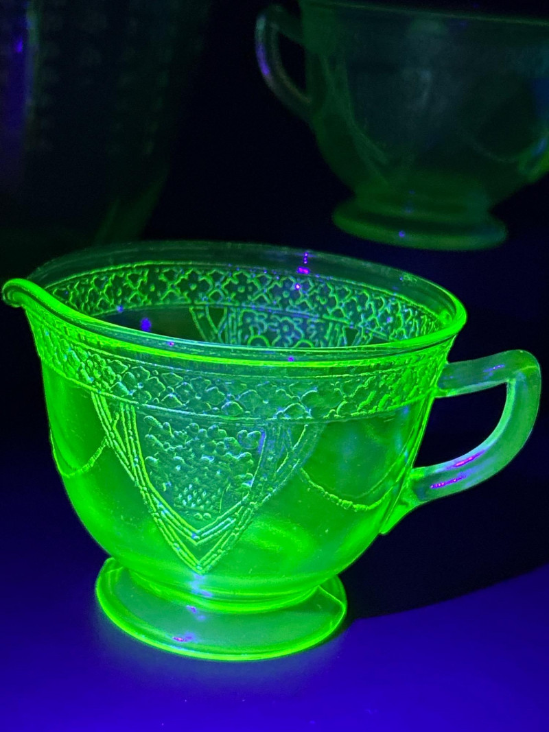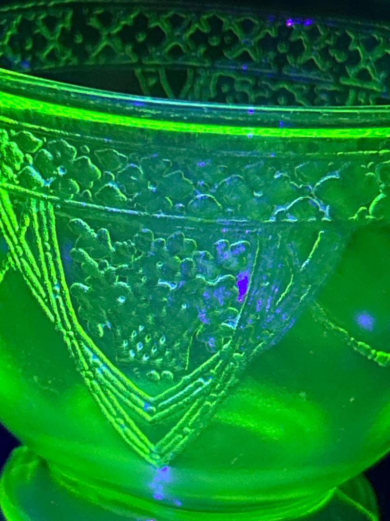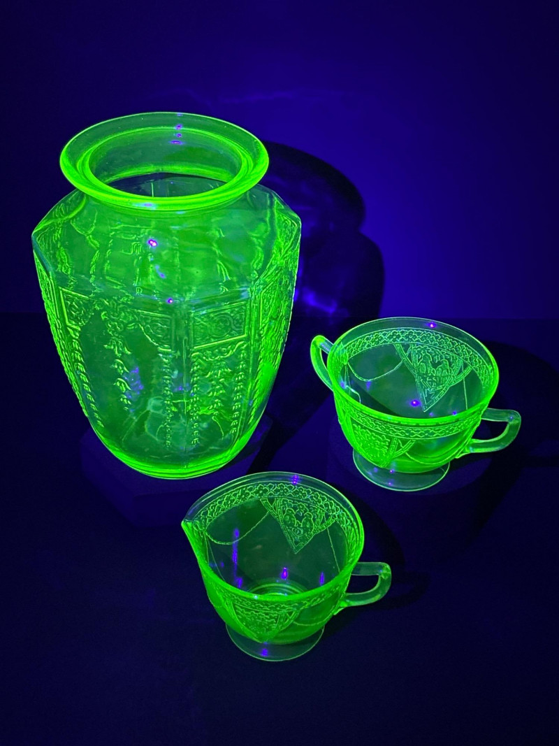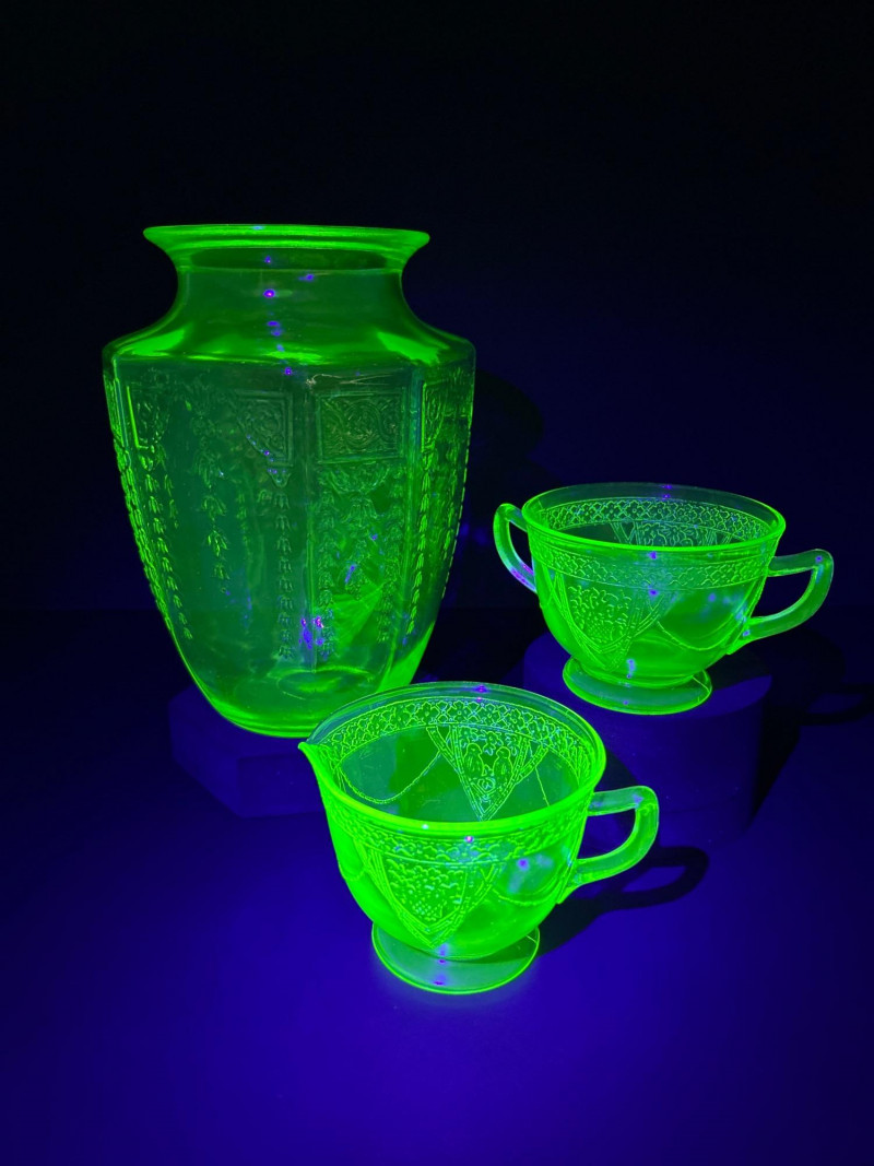 Produced during the early 1930s, both patterns represent the height of Depression-era pressed glass artistry, celebrated for their intricate embossed details, elegant symmetry, and characteristic uranium glow under UV light. Together, they showcase the decorative refinement and craftsmanship that defined American glassmaking between 1930 and 1935.Lot Details: