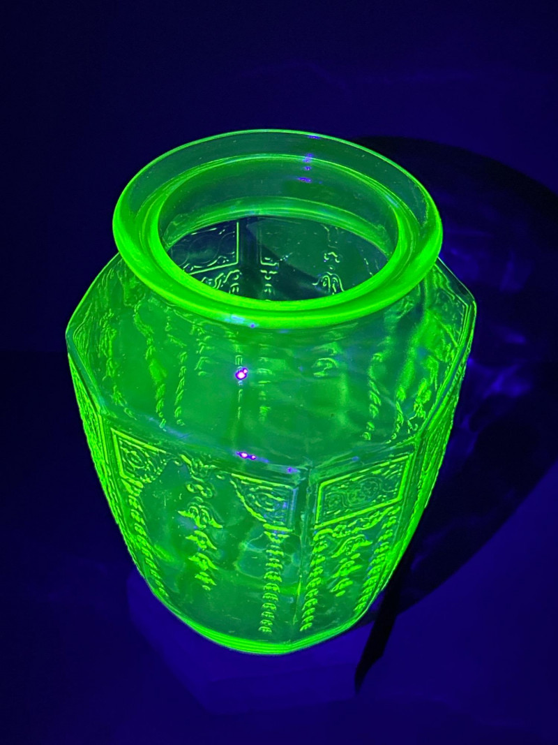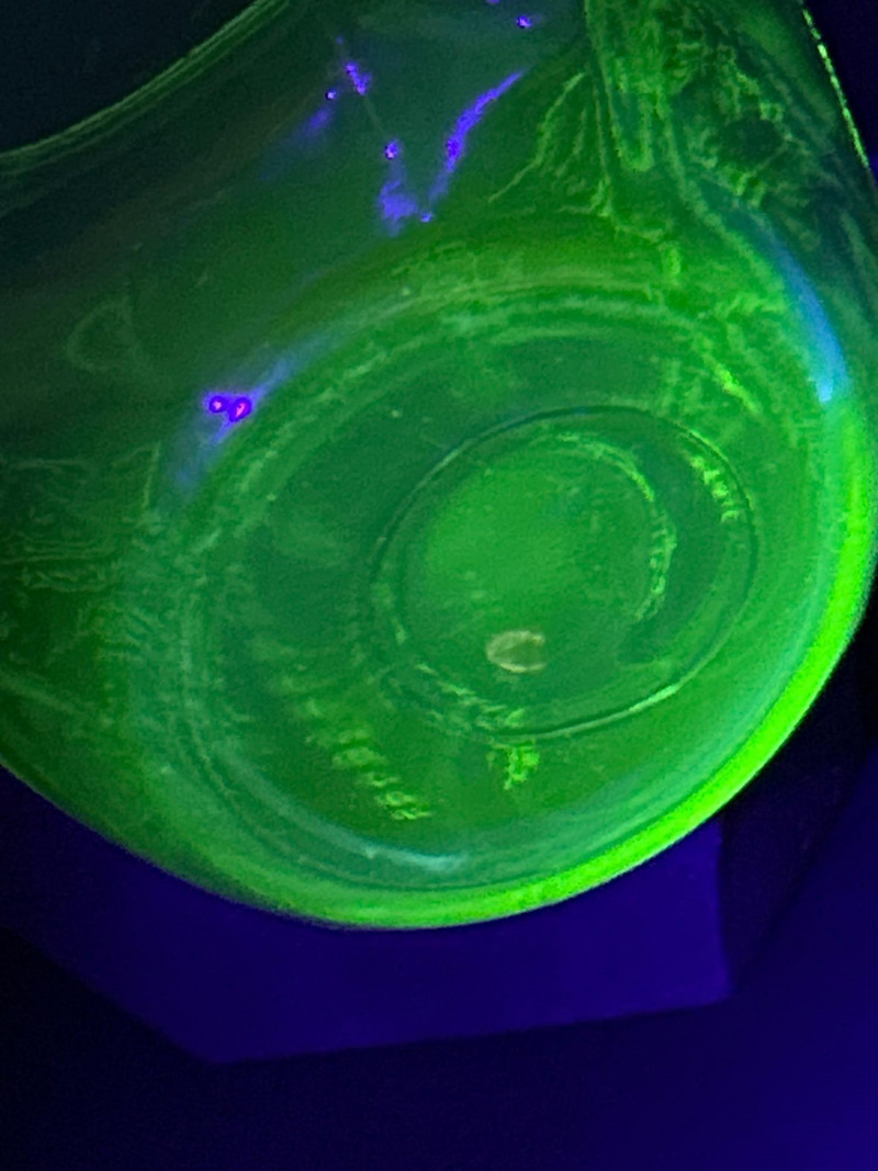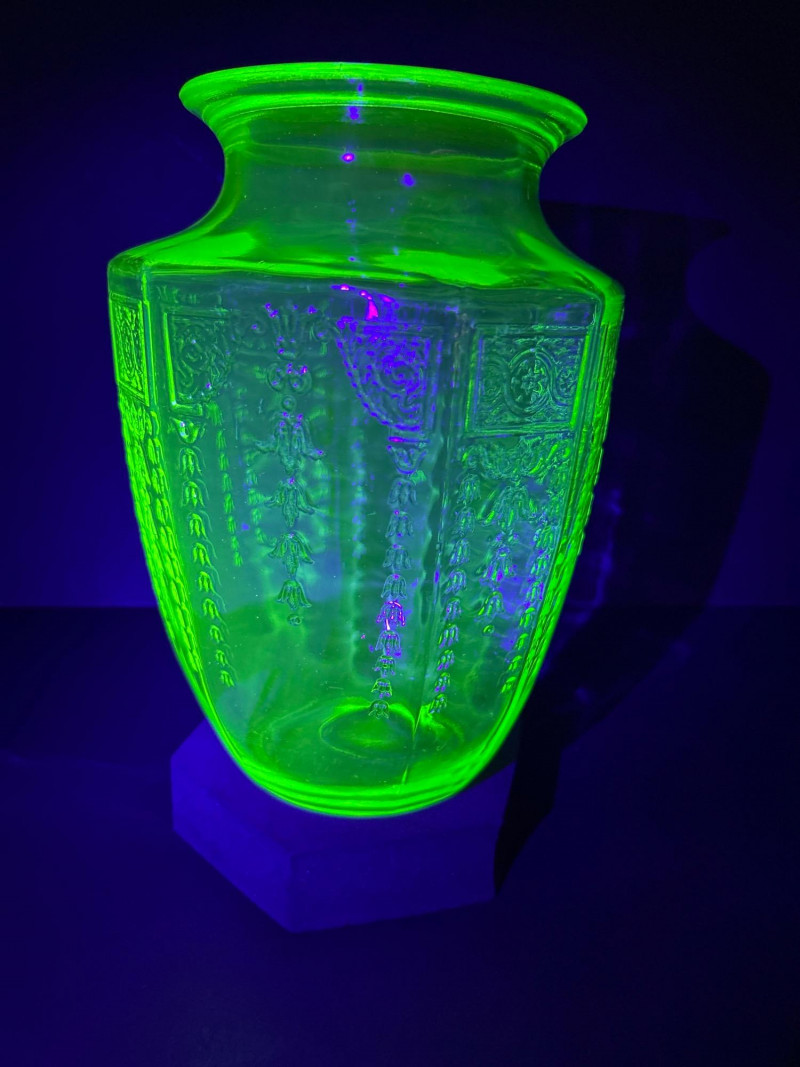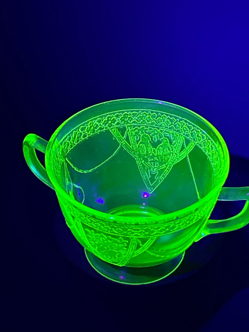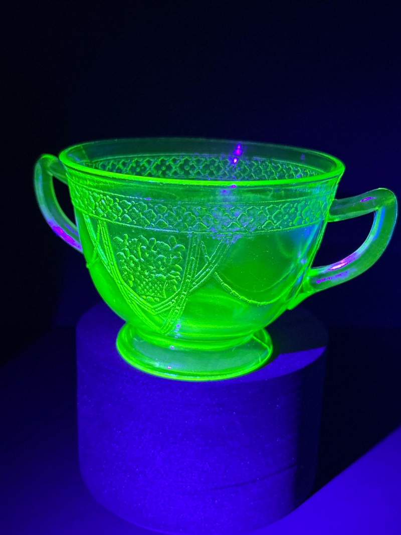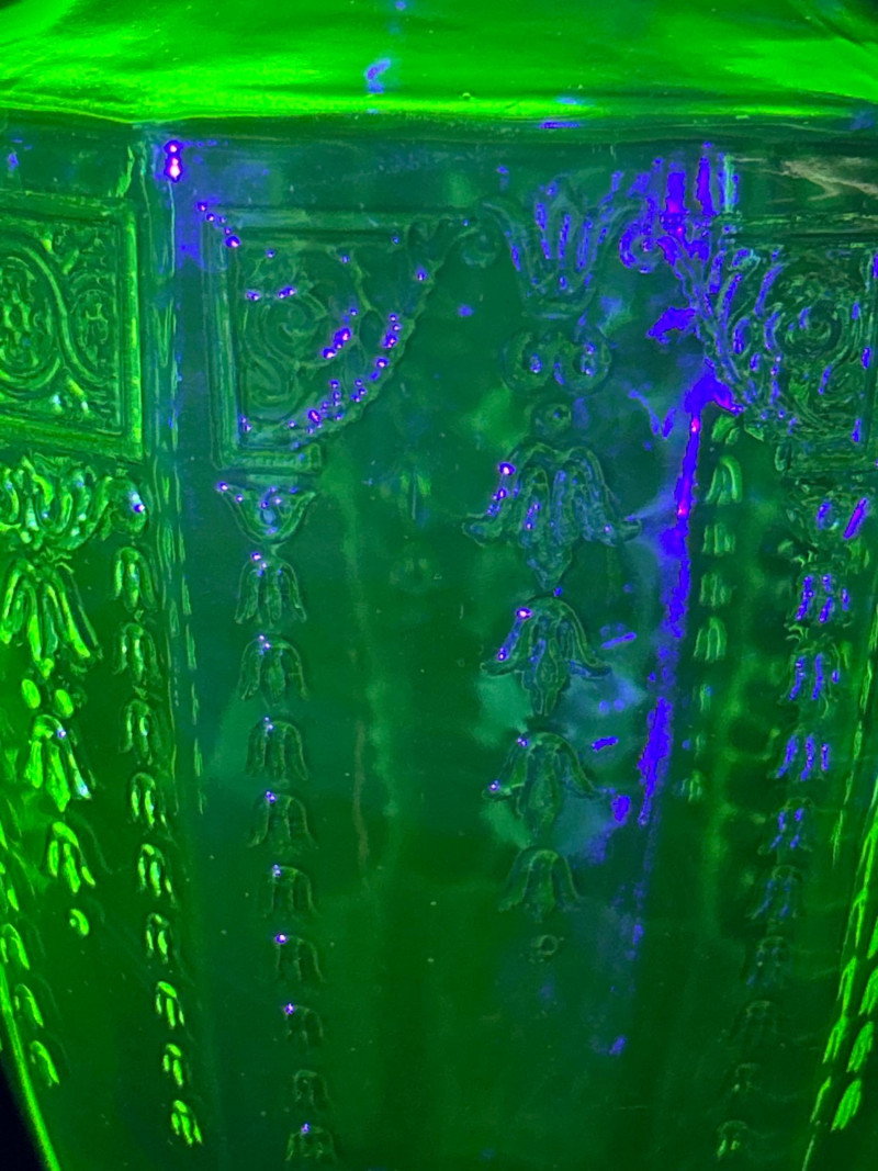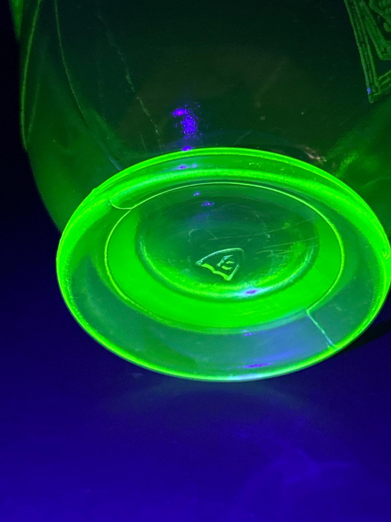 Produced during the early 1930s, both patterns represent the height of Depression-era pressed glass artistry, celebrated for their intricate embossed details, elegant symmetry, and characteristic uranium glow under UV light. Together, they showcase the decorative refinement and craftsmanship that defined American glassmaking between 1930 and 1935.Lot Details: