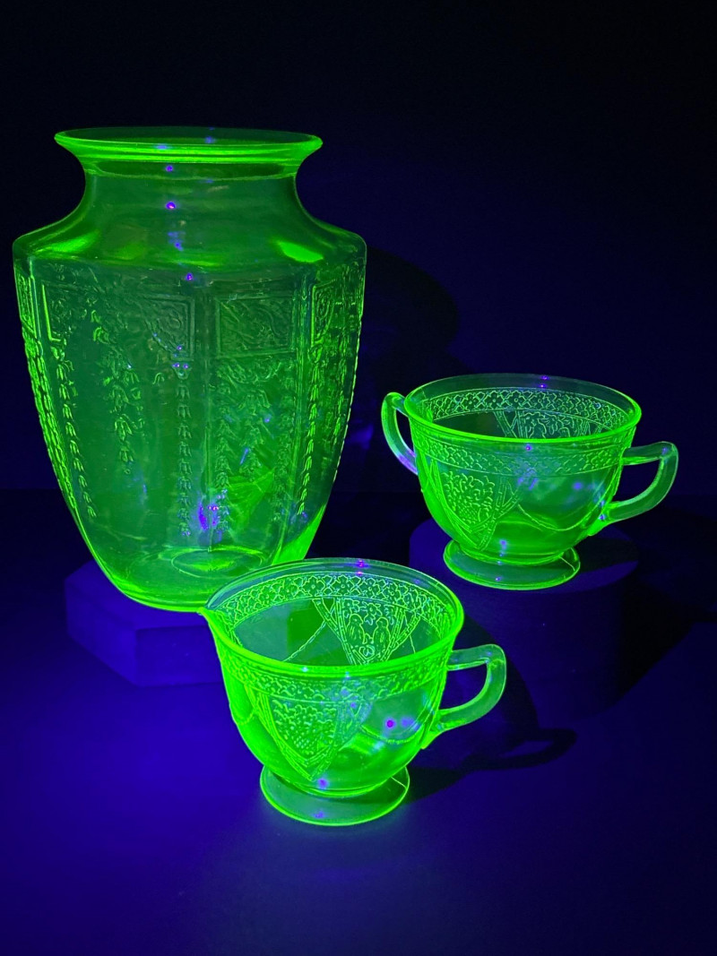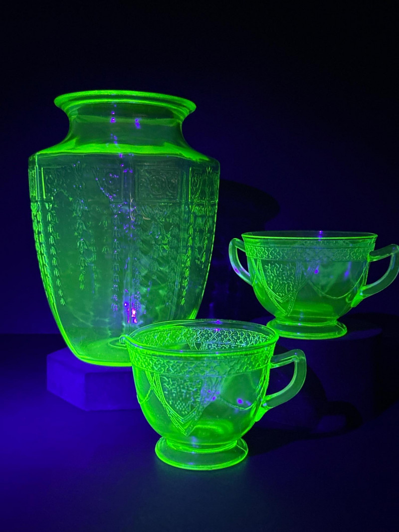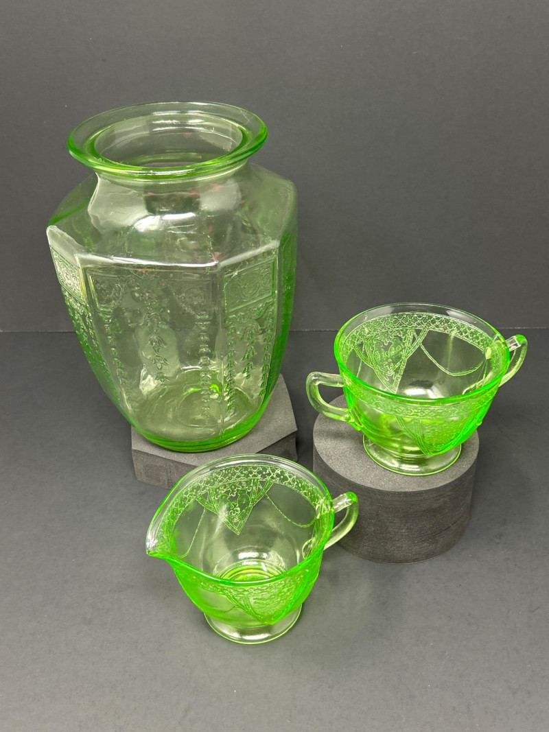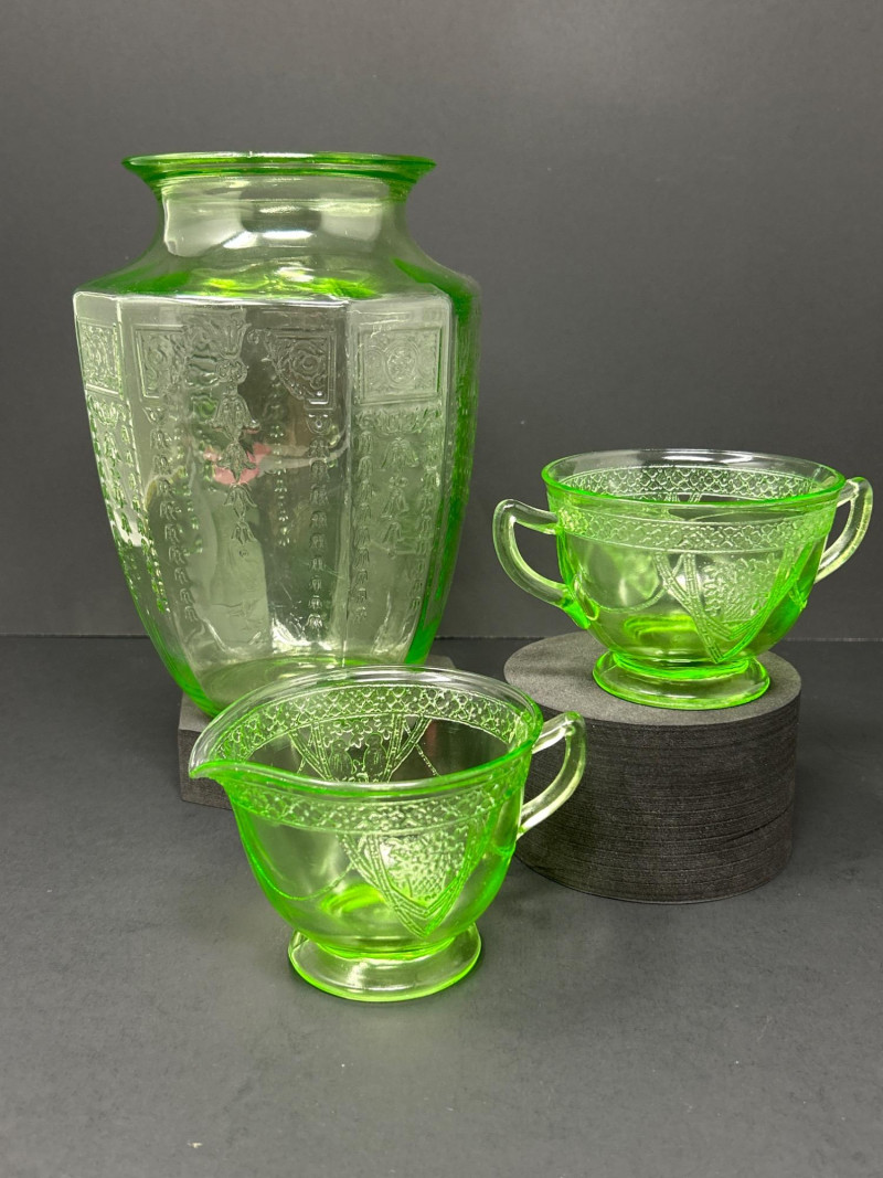 A glowing pair of classic American Depression glass designs — the Federal Glass “Georgian Lovebirds” Creamer & Sugar Set and the Anchor Hocking “Princess” Uranium Green Vase. Federal Glass “Georgian Lovebirds” Creamer & Sugar Set Anchor Hocking “Princess” Vase