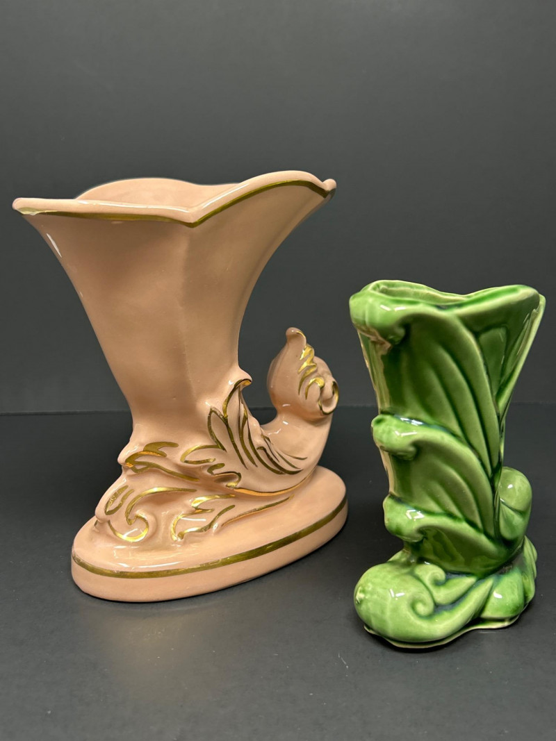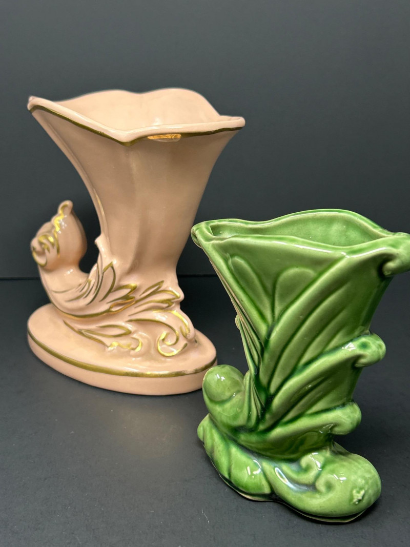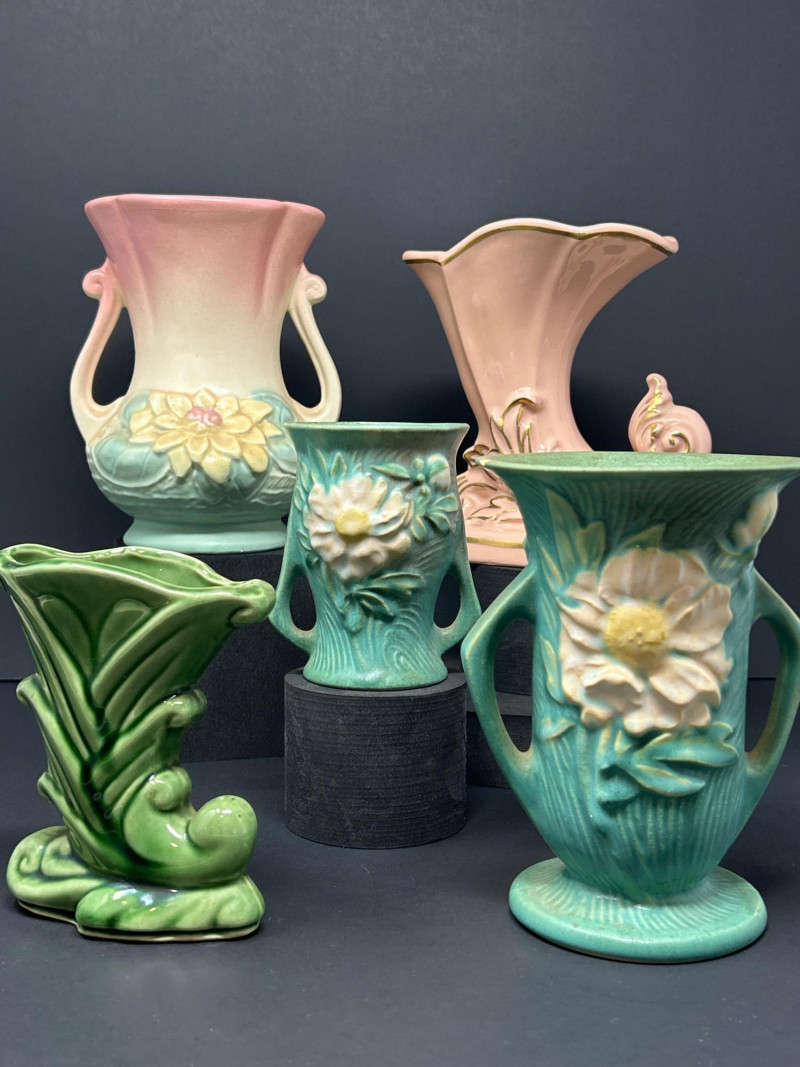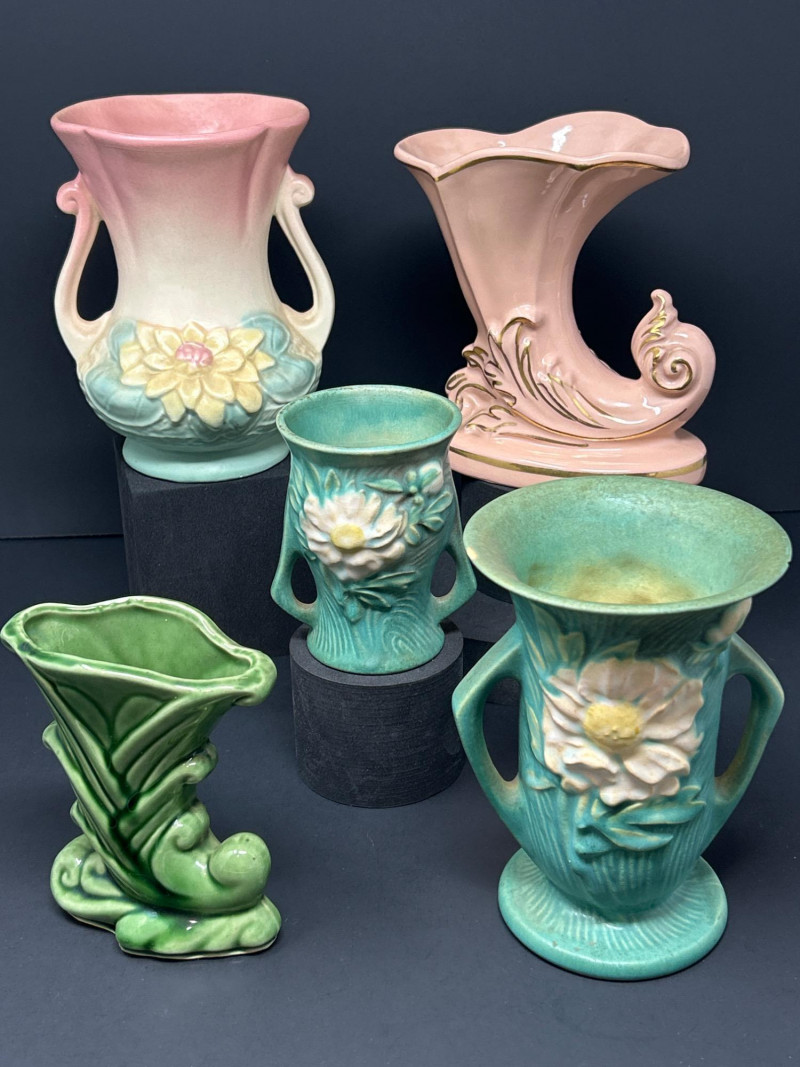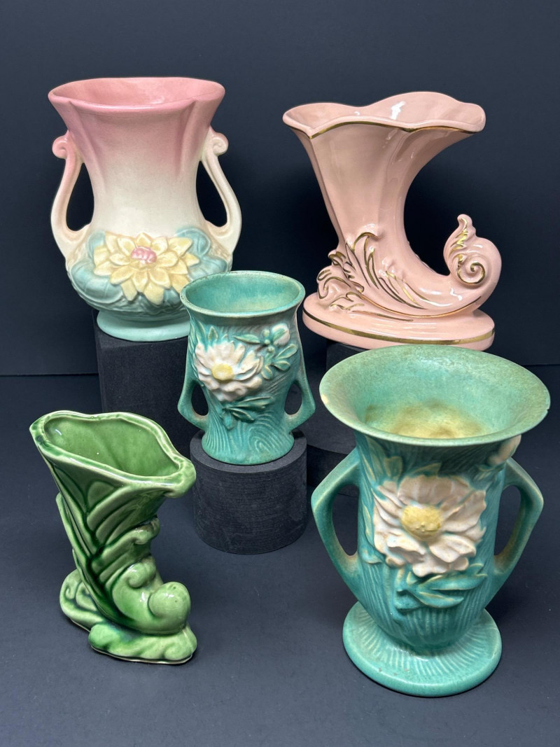 Lot # 40 - Five Ceramic Vases & Cornucopias – Hull, Roseville & Shawnee 1940s–50s