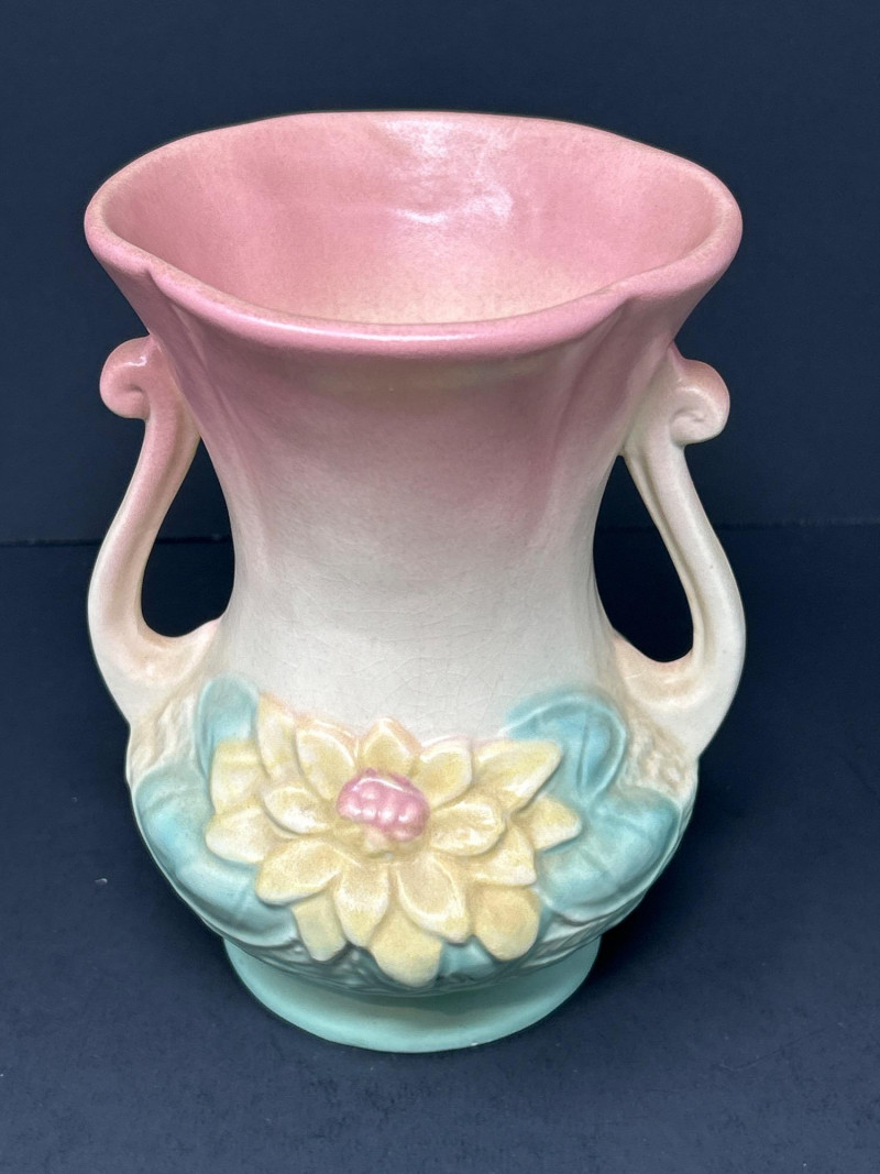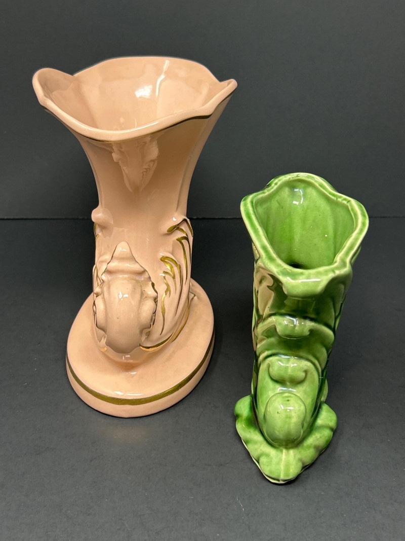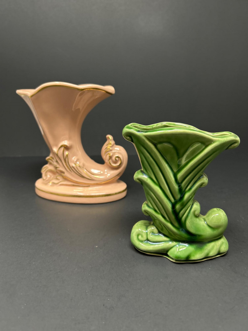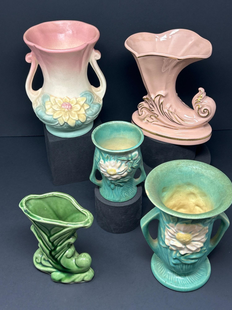 A beautiful mixed collection of vintage mid-century American pottery, featuring five classic vases and cornucopia horns from the 1940s–1950s. Each showcases the distinctive sculpted floral reliefs, pastel glazes, and stylized forms that define the Hull, Shawnee, and Roseville pottery lines. The group includes Hull’s well-known Water Lily vase, a Roseville Dahliapair, and two elegant cornucopia vases — one in soft pink (pattern #1133) and one in glossy green (#835). Together, they make an outstanding display set for collectors of early American art pottery. Hull Pottery “Water Lily” Double-Handled Vase – L-4 – 6½″ Marked: Hull Art U.S.A. L-4-6½ Pastel pink, ivory, and aqua tones with raised yellow water lily motif. Approx. 6½″ tall × 4½″ wide Reference: Similar example listed on eBay for US $23.95 (Nov 2025). Pair of Roseville Pottery “Dahlia” Pattern Vases – Nos. 59-6 & 59-4 Matte turquoise glaze with white and yellow dahlia floral reliefs. One vase shows a small rim chip (see photo). Approx. 6″ tall × 4½″ wide and 4″ tall × 3″ wide Reference: Comparable Roseville Dahlia 59-6 sold at auction for US $18.00 (April 2022). Pink Cornucopia Pottery Vase – No. 1133 Glossy blush-mauve glaze with scroll base and curved rim; marked U.S.A 1133. Approx. 6½″ tall × 6″ long × 4″ wide Reference: “Vintage 1940’s Mauve Cornucopia Pottery Vase #1133” listed US $25. Shawnee Pottery Green Cornucopia Vase – #835 Bright leaf-green glaze with stylized Art Moderne swirl base; marked U.S.A 835. Approx. 5″ tall × 4″ long × 2½″ wide Reference: “Vintage Shawnee Pottery Green Cornucopia 5″ Vase #835” listed US $5.Lot Details: