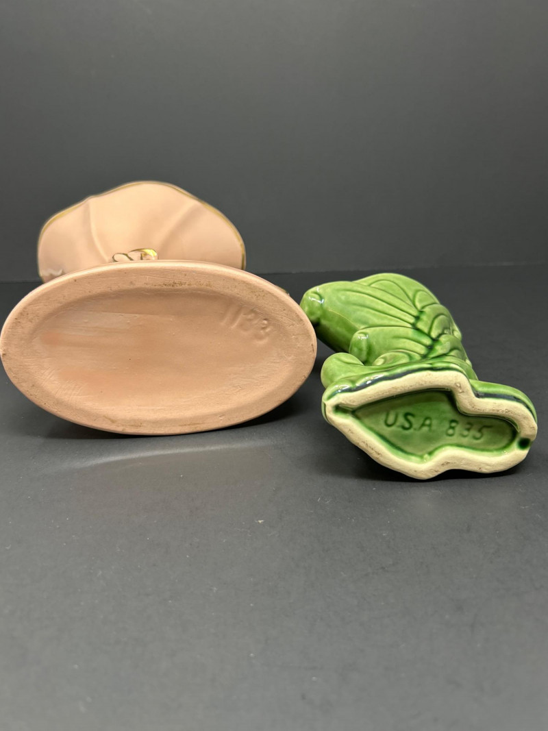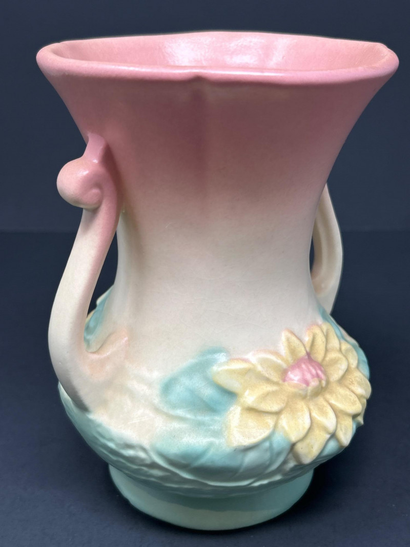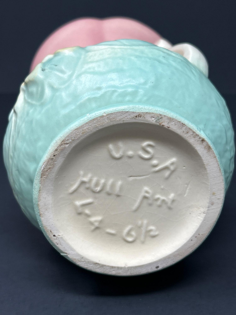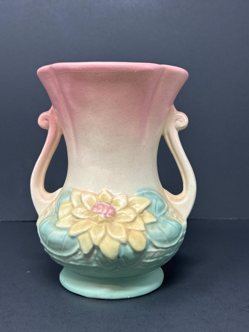 A beautiful mixed collection of vintage mid-century American pottery, featuring five classic vases and cornucopia horns from the 1940s–1950s. Each showcases the distinctive sculpted floral reliefs, pastel glazes, and stylized forms that define the Hull, Shawnee, and Roseville pottery lines. The group includes Hull’s well-known Water Lily vase, a Roseville Dahliapair, and two elegant cornucopia vases — one in soft pink (pattern #1133) and one in glossy green (#835). Together, they make an outstanding display set for collectors of early American art pottery. Hull Pottery “Water Lily” Double-Handled Vase – L-4 – 6½″ Marked: Hull Art U.S.A. L-4-6½ Pastel pink, ivory, and aqua tones with raised yellow water lily motif. Approx. 6½″ tall × 4½″ wide Reference: Similar example listed on eBay for US $23.95 (Nov 2025). Pair of Roseville Pottery “Dahlia” Pattern Vases – Nos. 59-6 & 59-4 Matte turquoise glaze with white and yellow dahlia floral reliefs. One vase shows a small rim chip (see photo). Approx. 6″ tall × 4½″ wide and 4″ tall × 3″ wide Reference: Comparable Roseville Dahlia 59-6 sold at auction for US $18.00 (April 2022). Pink Cornucopia Pottery Vase – No. 1133 Glossy blush-mauve glaze with scroll base and curved rim; marked U.S.A 1133. Approx. 6½″ tall × 6″ long × 4″ wide Reference: “Vintage 1940’s Mauve Cornucopia Pottery Vase #1133” listed US $25. Shawnee Pottery Green Cornucopia Vase – #835 Bright leaf-green glaze with stylized Art Moderne swirl base; marked U.S.A 835. Approx. 5″ tall × 4″ long × 2½″ wide Reference: “Vintage Shawnee Pottery Green Cornucopia 5″ Vase #835” listed US $5.Lot Details: