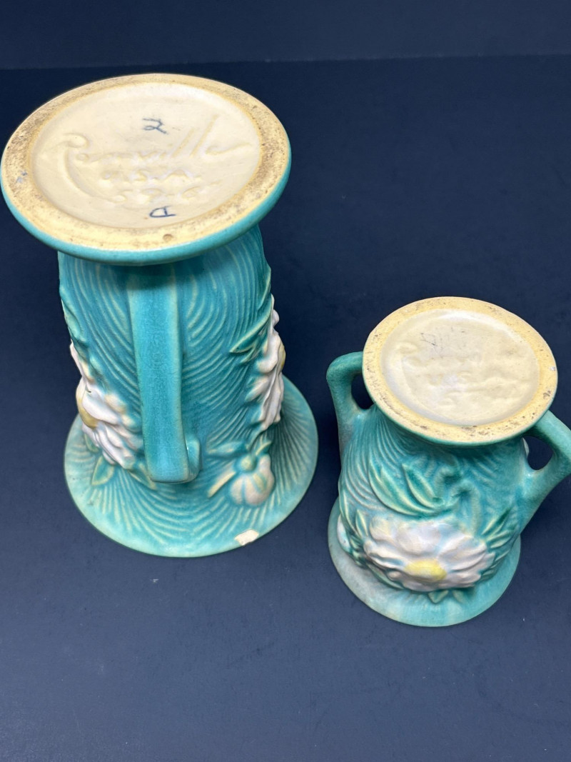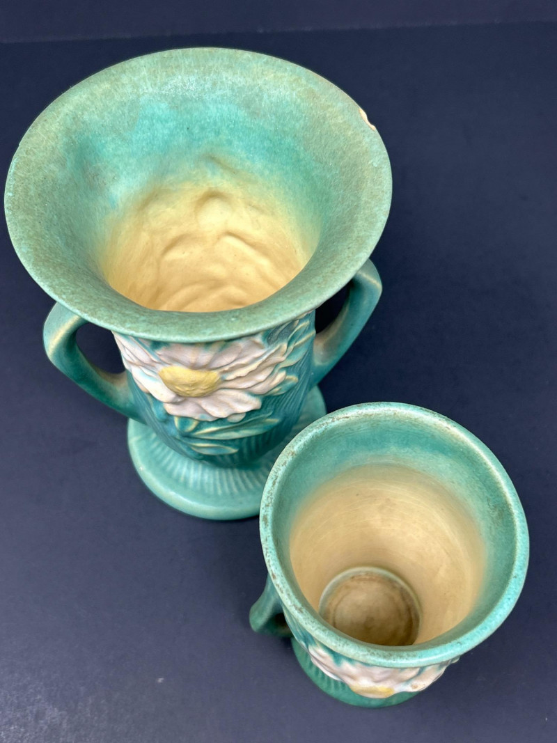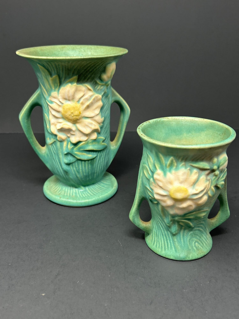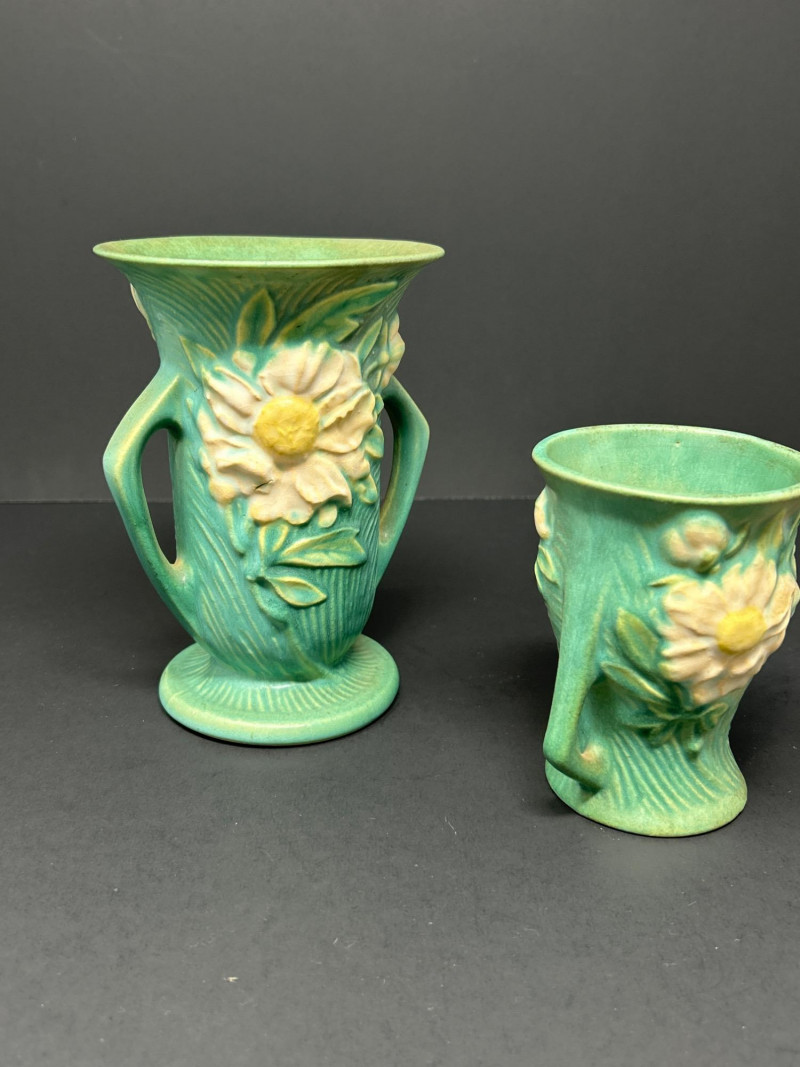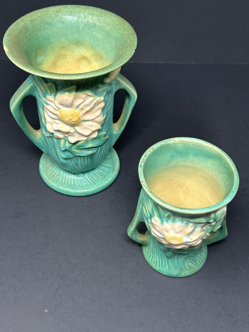 Condition: One small rim chip on smaller Roseville vase (as shown).
