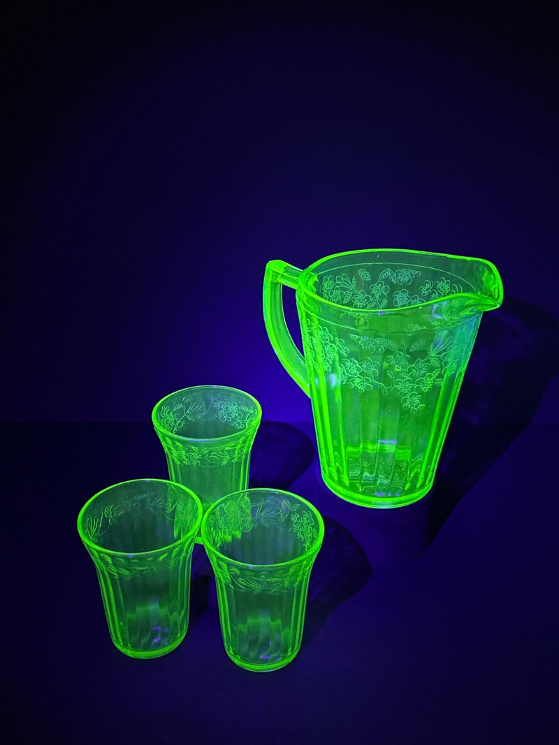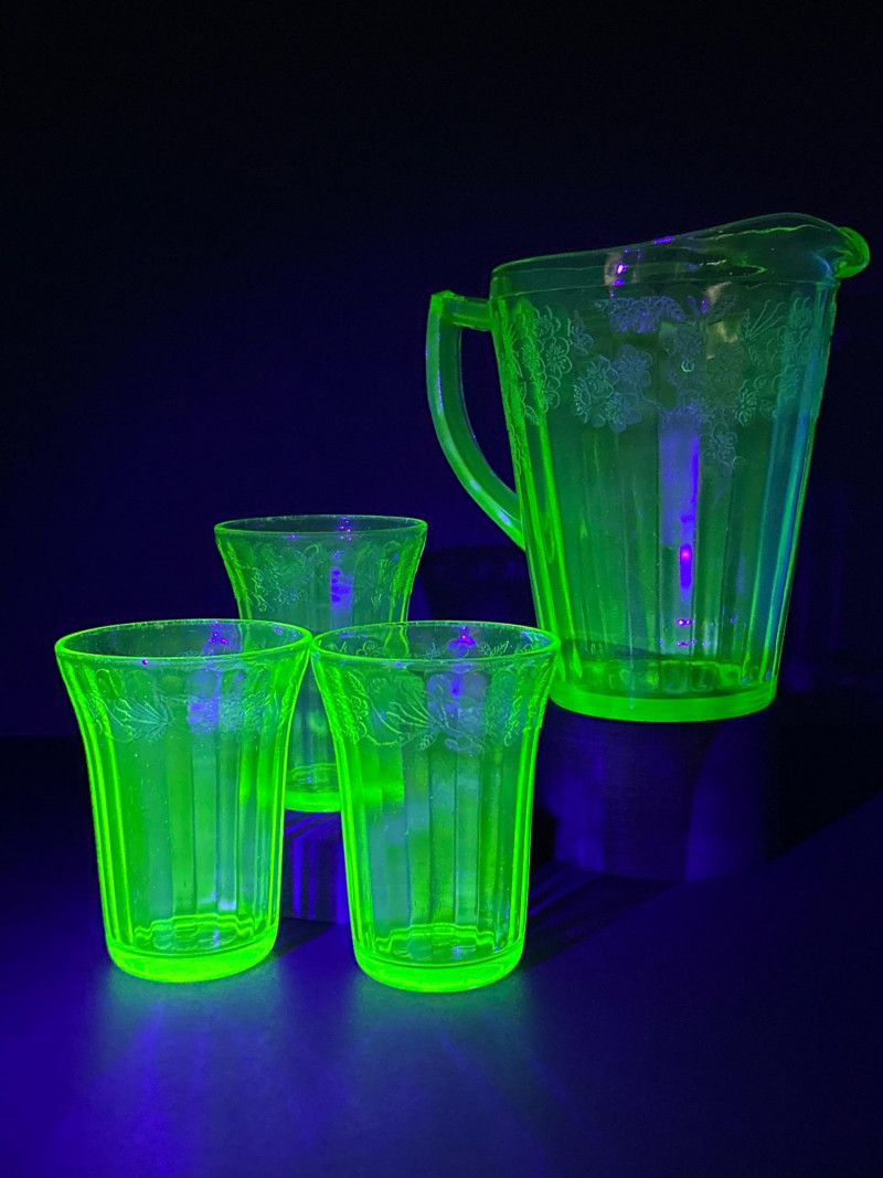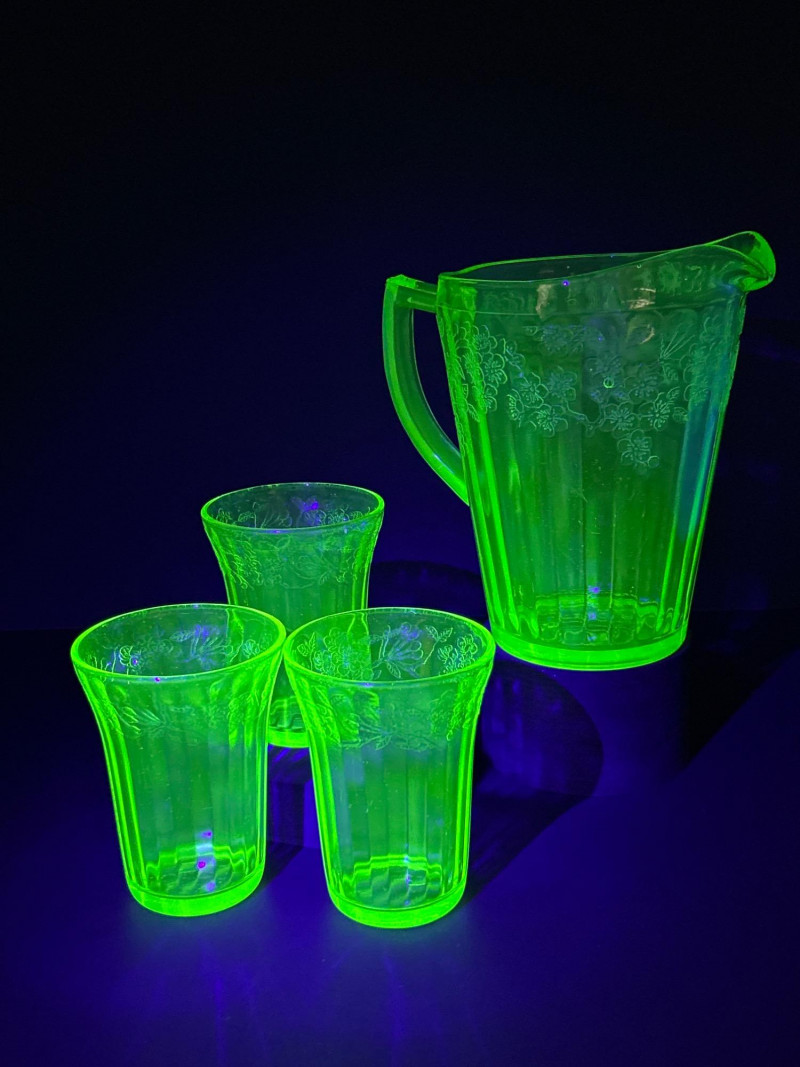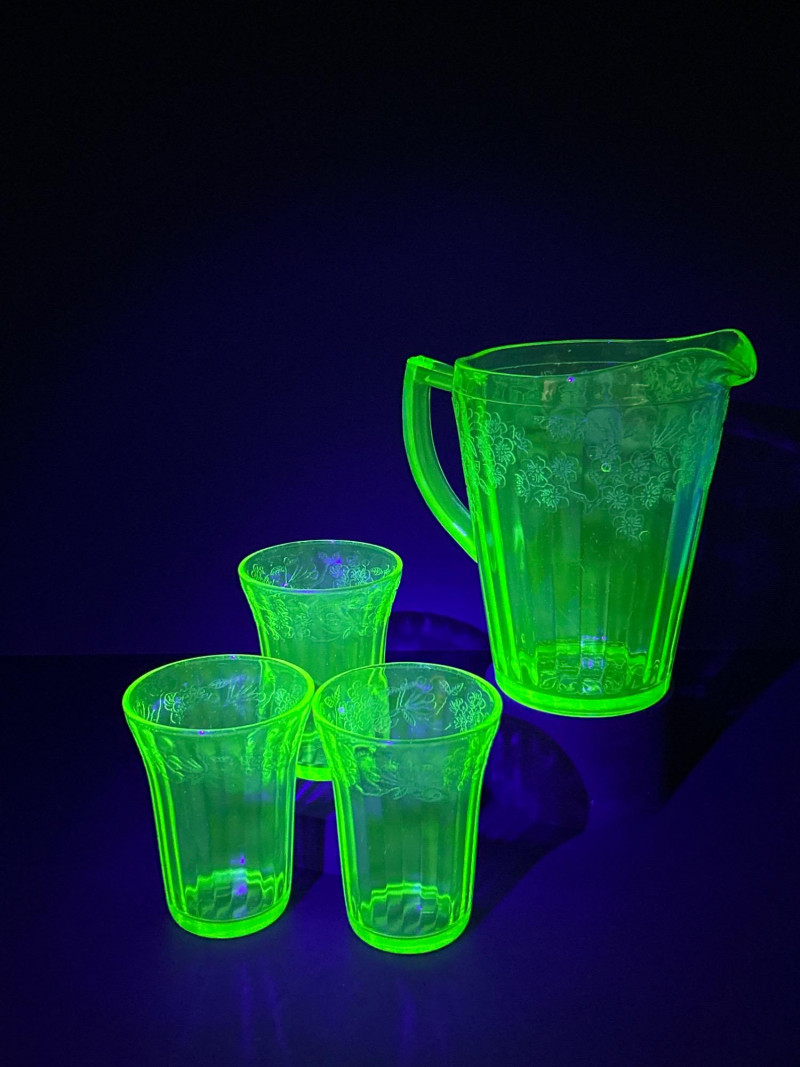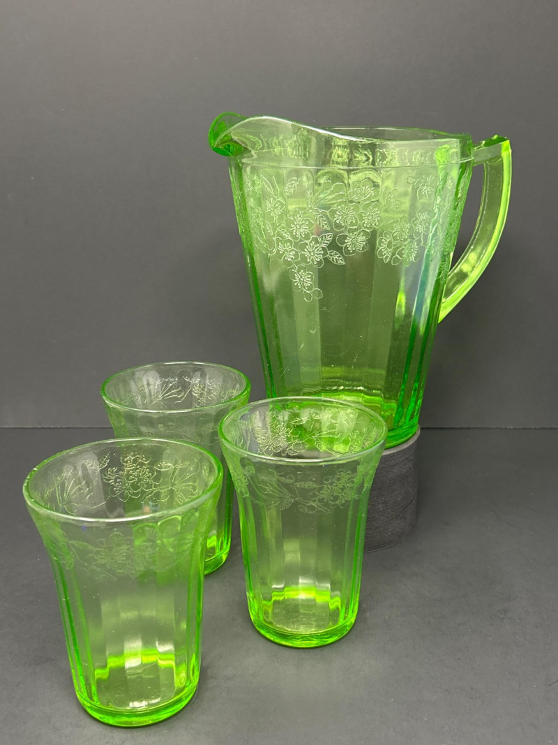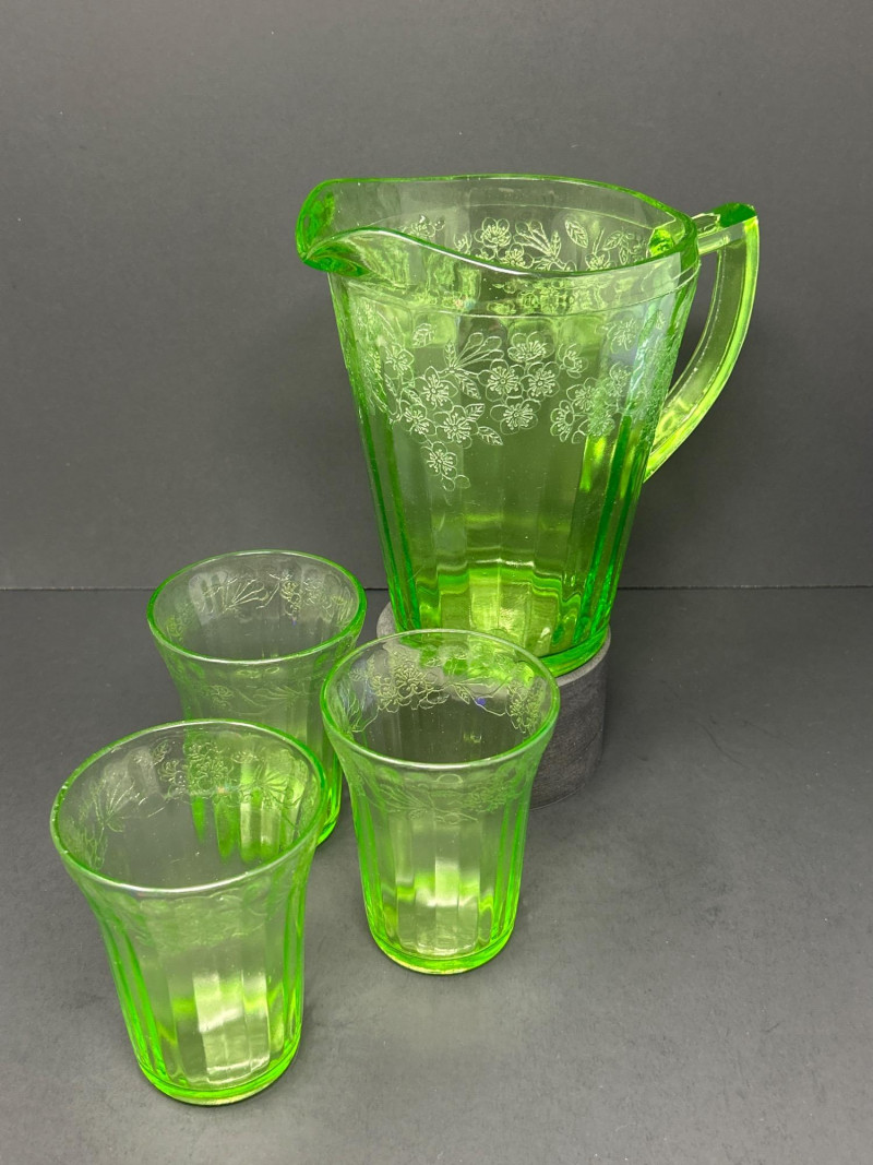 A radiant 1930s Depression-era glass beverage set by Jeanette Glass Company, featuring the beloved “Cherry Blossom” etched pattern. This glowing uranium green set includes one paneled pitcher and three matching tumblers that come alive under UV light with a stunning neon fluorescence. The design showcases intricate cherry blossom sprays in delicate relief—an iconic motif among Depression glass collectors. Originally valued at $70, this elegant set remains a cherished example of early American pressed glass artistry. Lot Details: Maker: Jeanette Glass Company Pattern: Cherry Blossom Date: Circa 1930–1939 Material: Uranium Depression Glass (fluorescent under UV light) Color: Green Design: Floral etch with paneled body Includes: (1) Pitcher – approx. 7½″ tall × 5″ across (3) Tumblers – each approx. 4″ tall × 3″ across Collecting Note: