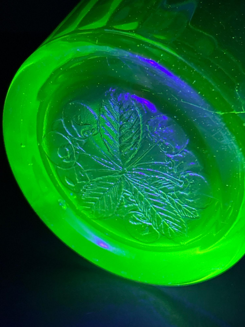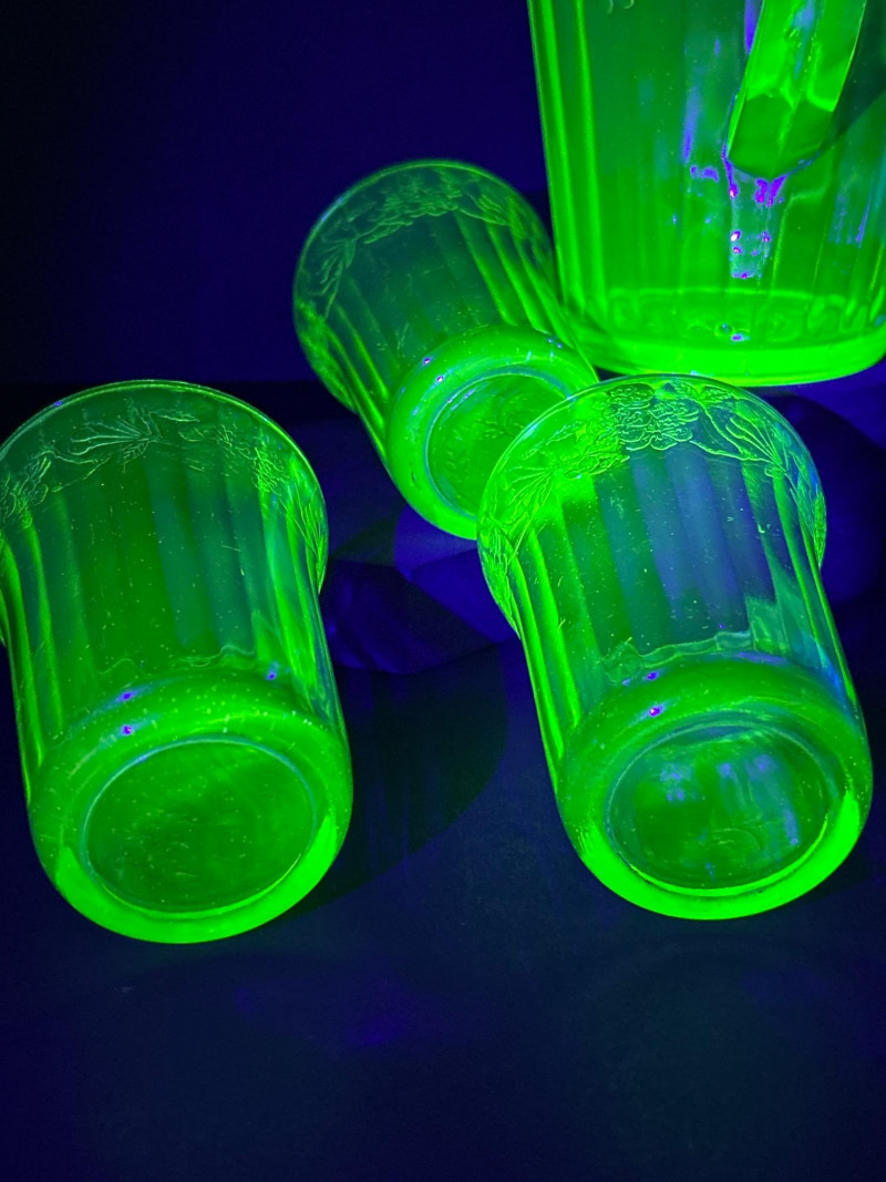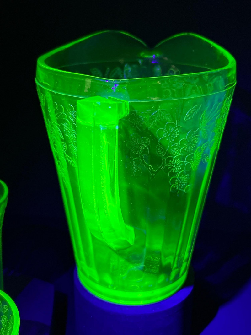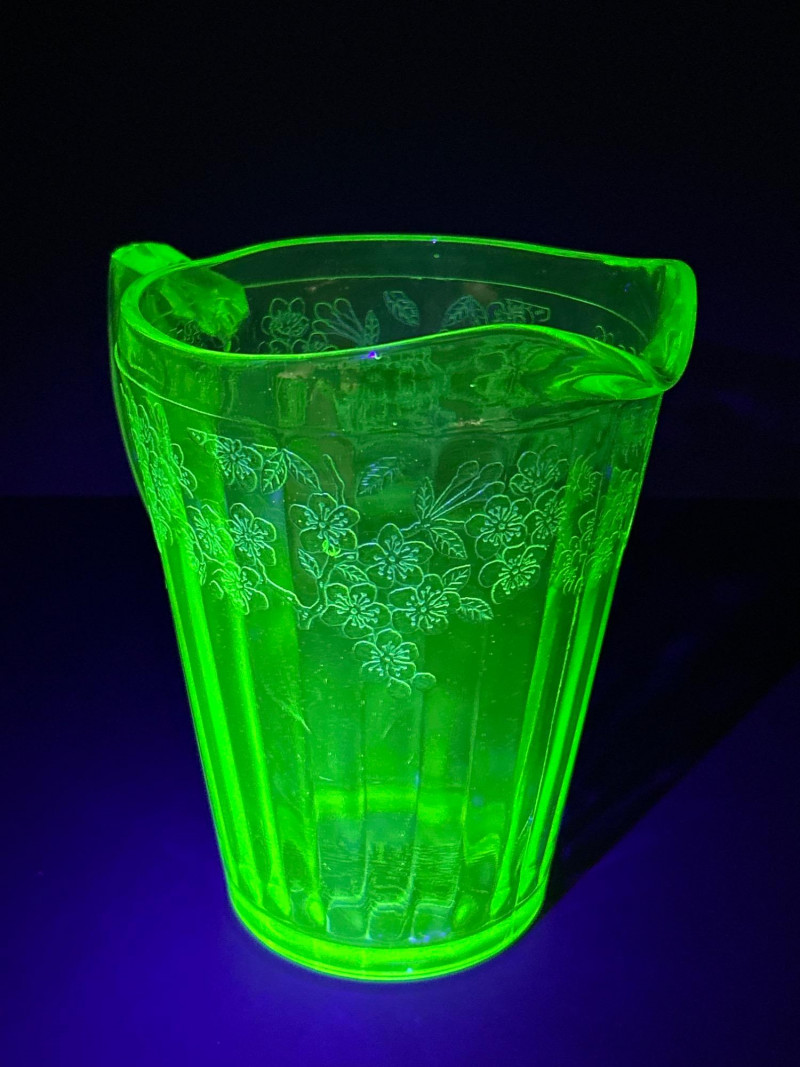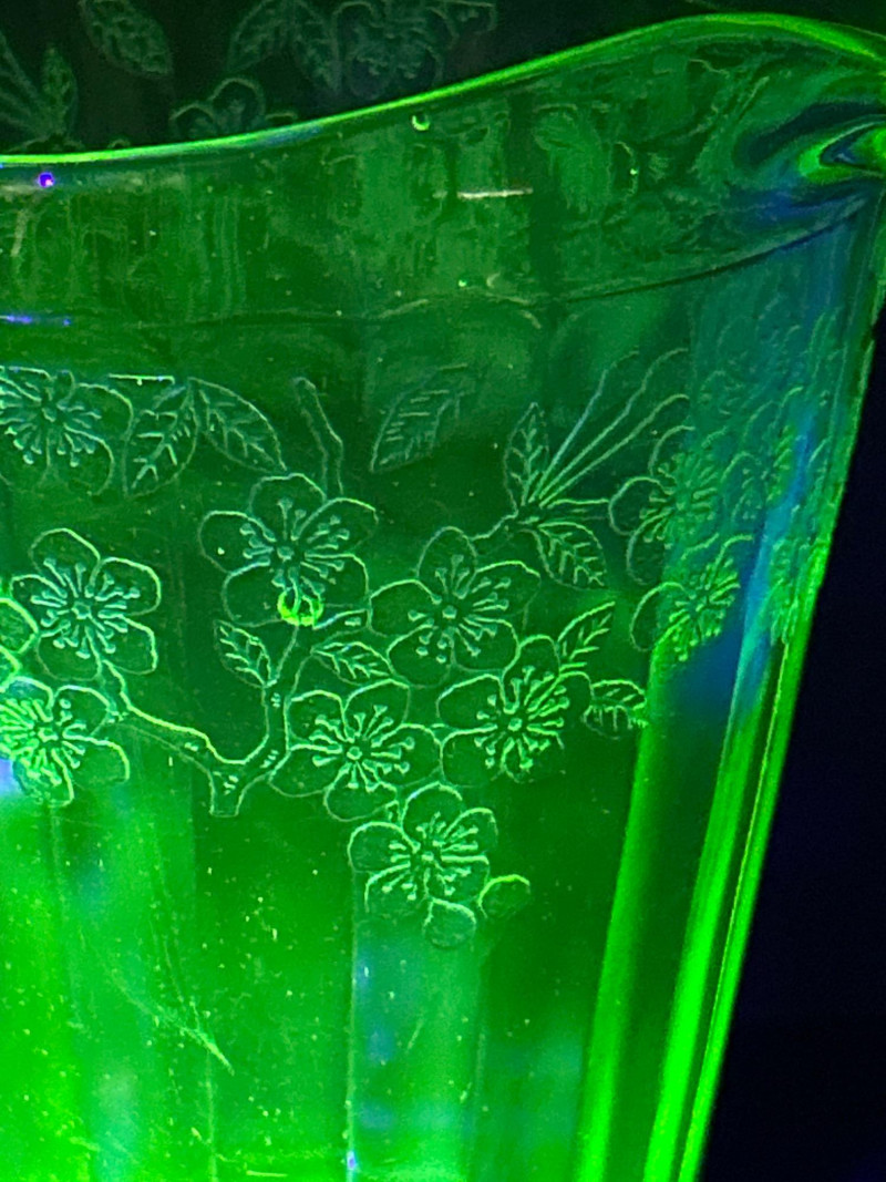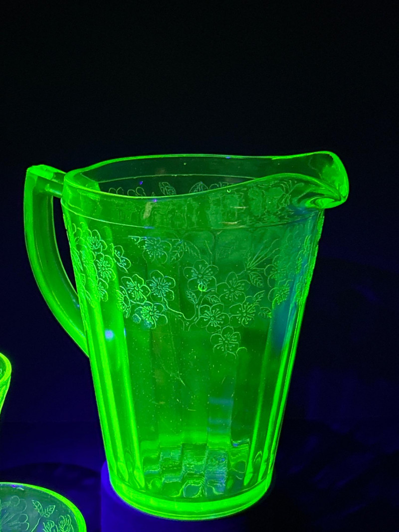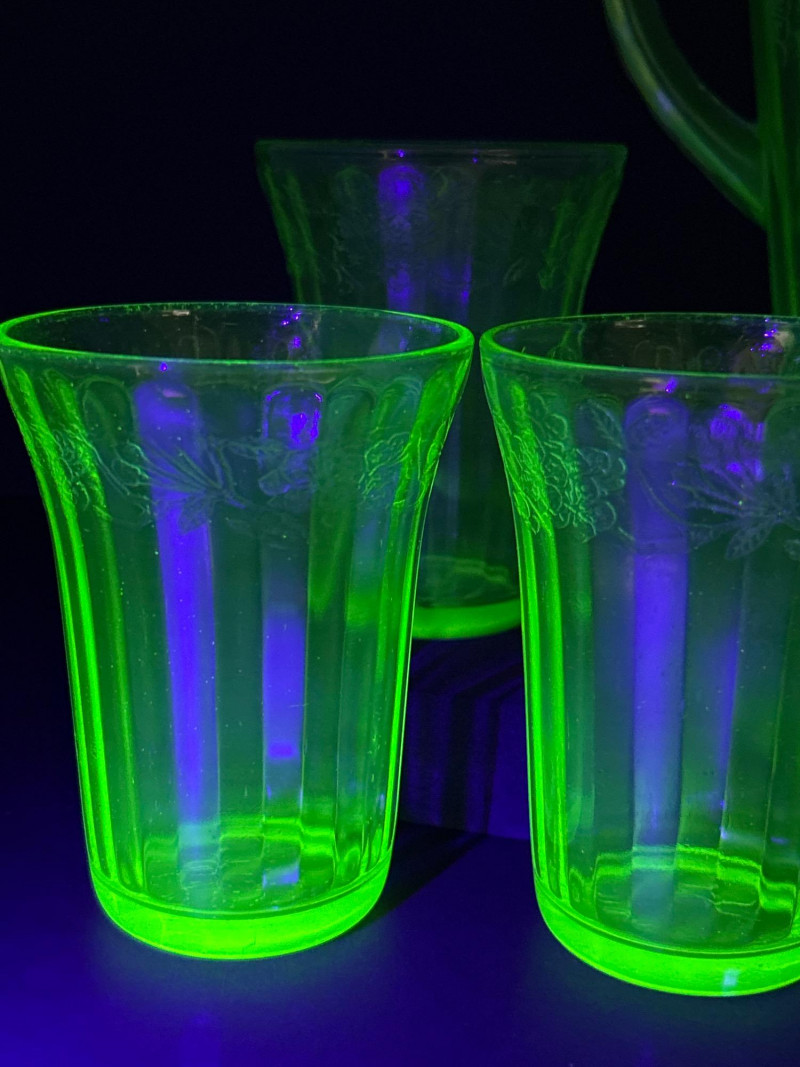 A radiant 1930s Depression-era glass beverage set by Jeanette Glass Company, featuring the beloved “Cherry Blossom” etched pattern. This glowing uranium green set includes one paneled pitcher and three matching tumblers that come alive under UV light with a stunning neon fluorescence. The design showcases intricate cherry blossom sprays in delicate relief—an iconic motif among Depression glass collectors. Originally valued at $70, this elegant set remains a cherished example of early American pressed glass artistry. Lot Details: Maker: Jeanette Glass Company Pattern: Cherry Blossom Date: Circa 1930–1939 Material: Uranium Depression Glass (fluorescent under UV light) Color: Green Design: Floral etch with paneled body Includes: (1) Pitcher – approx. 7½″ tall × 5″ across (3) Tumblers – each approx. 4″ tall × 3″ across Collecting Note: