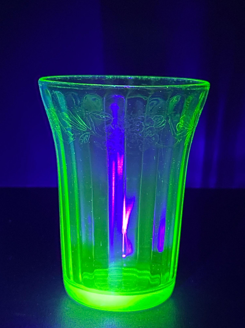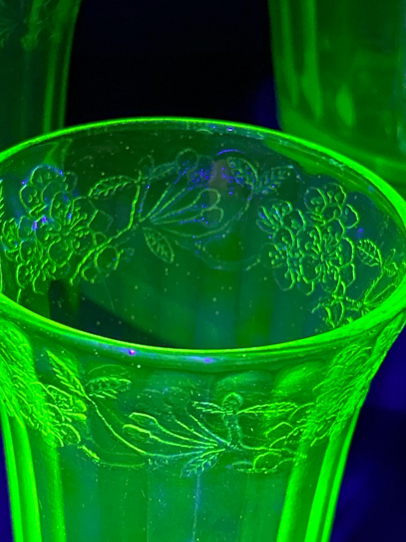 Jeanette’s Cherry Blossom pattern is one of the most recognized and sought-after Depression glass lines. Produced between 1930 and 1939, these pieces are prized for their romantic floral etching and brilliant uranium glow, making them a highlight in any vintage glass collection.