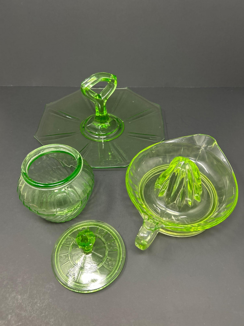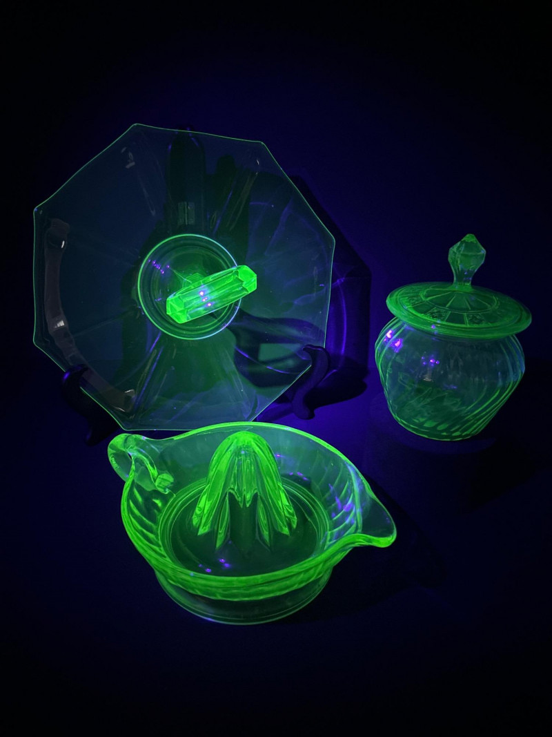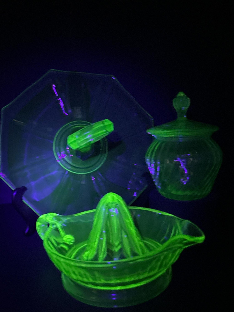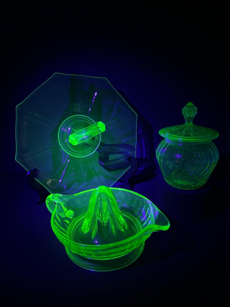 A beautiful three-piece collection of vintage Uranium Glass, featuring an Octagon Tidbit Tray, Citrus Reamer, and Lidded Swirl Jar. Each piece glows vividly under UV light, showcasing the distinctive brilliance of authentic Depression-era uranium glass. Together, these pieces highlight classic Art Deco geometry and timeless collector appeal. Octagon Tidbit Tray Citrus Reamer / Juicer Lidded Swirl JarItem Details: