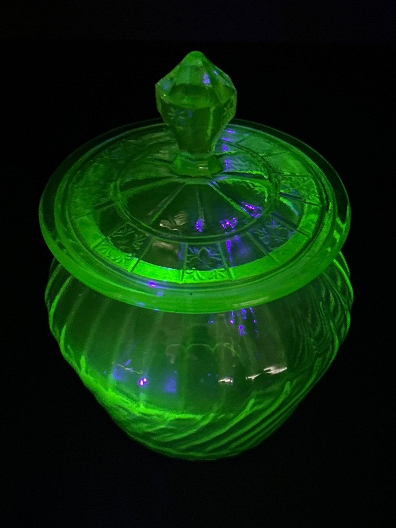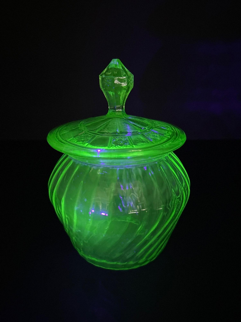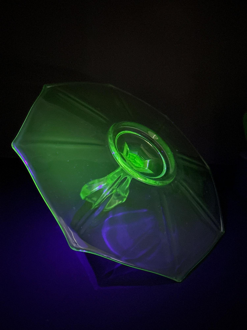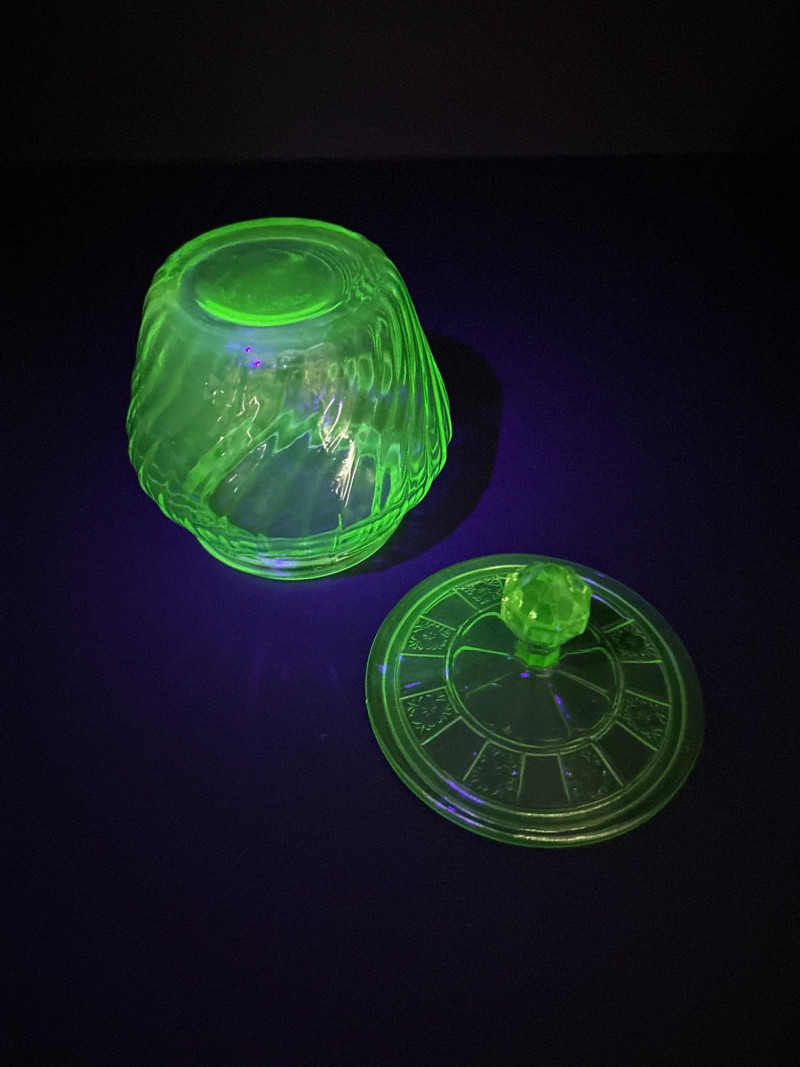 A beautiful three-piece collection of vintage Uranium Glass, featuring an Octagon Tidbit Tray, Citrus Reamer, and Lidded Swirl Jar. Each piece glows vividly under UV light, showcasing the distinctive brilliance of authentic Depression-era uranium glass. Together, these pieces highlight classic Art Deco geometry and timeless collector appeal. Octagon Tidbit Tray Citrus Reamer / Juicer Lidded Swirl JarItem Details: