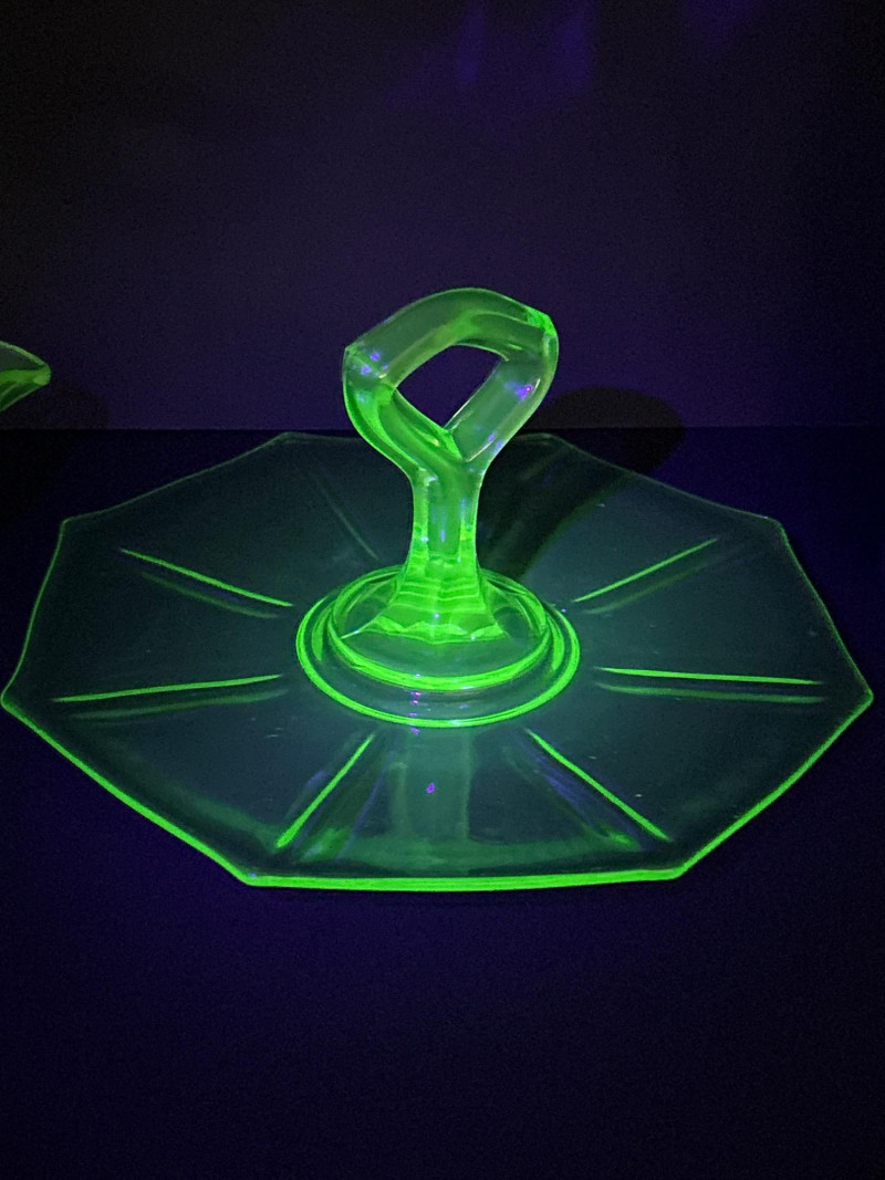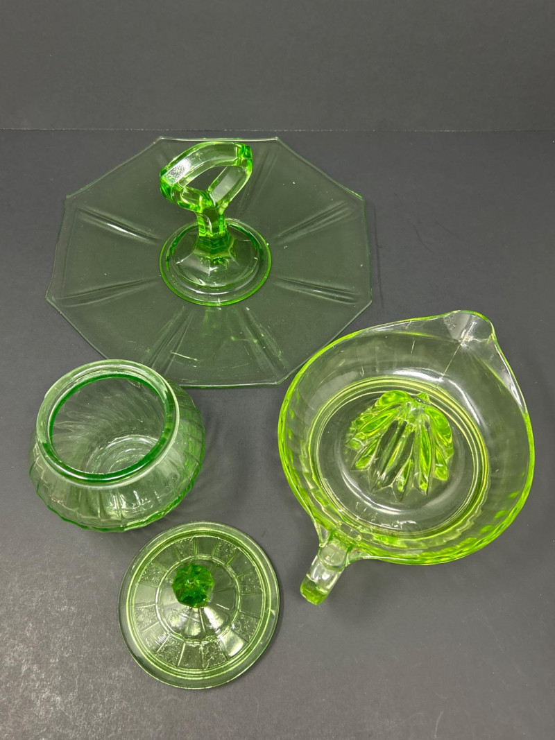 Lot # 43 - Three Piece Uranium Glass– Octagon Tidbit Tray, Citrus Reamer & Lidded